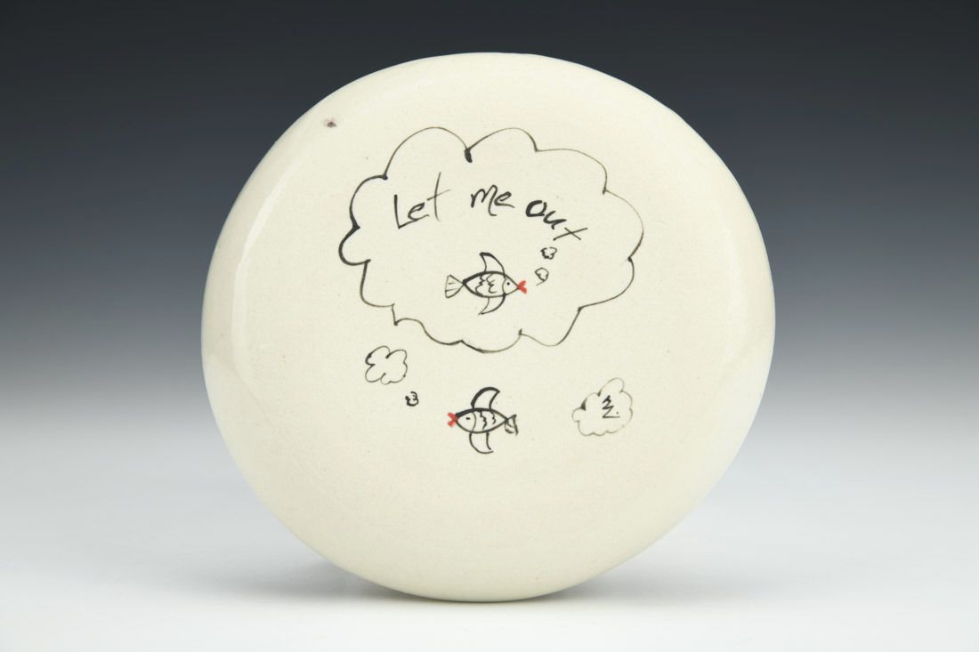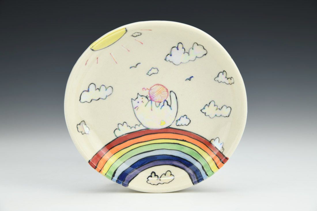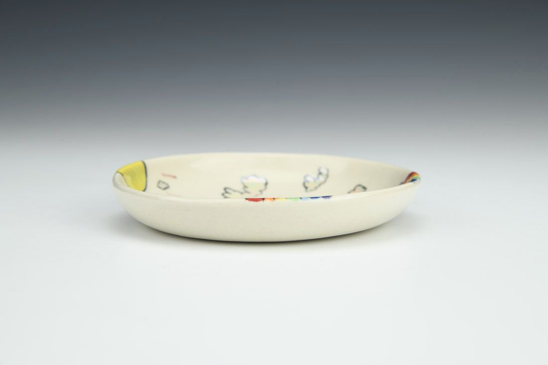Porcelain, wheel thrown, underglaze, glaze, gold luster, mother of pearl luster, cone 6 oxidation fired, 0.75 x 4.5 x 0.5 inches.