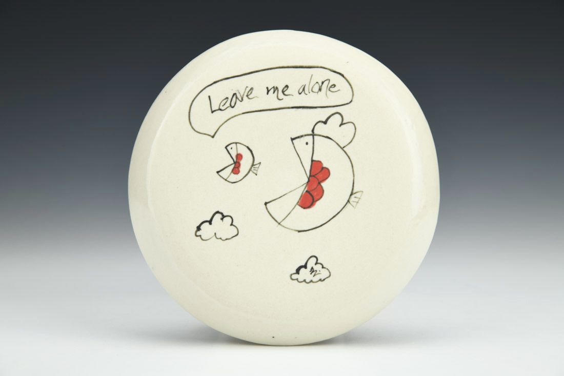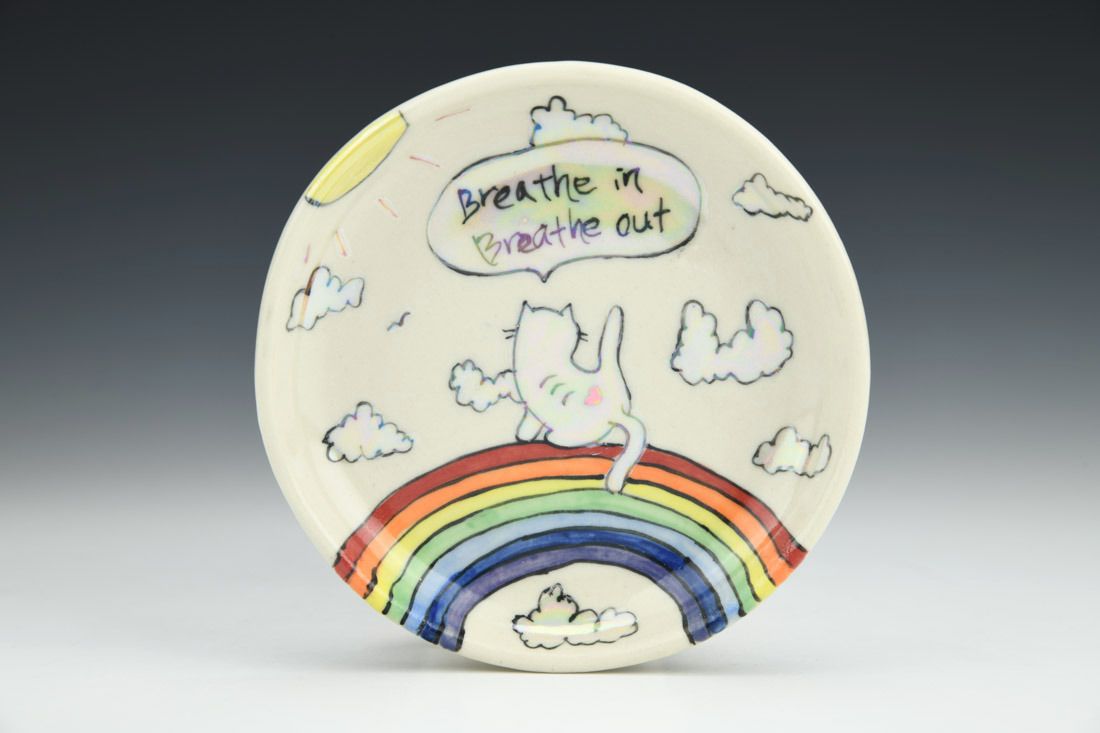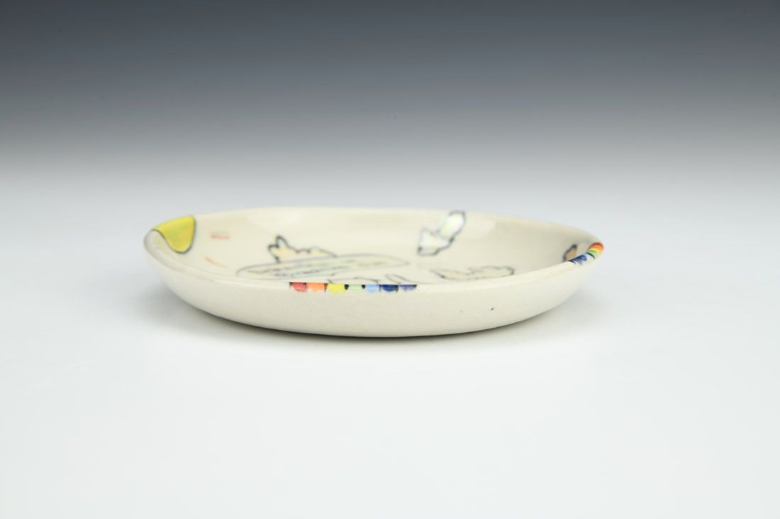 Porcelain, wheel thrown, underglaze, glaze, gold luster, mother of pearl luster, cone 6 oxidation fired, 0.75 x 4.5 x 0.5 inches.
