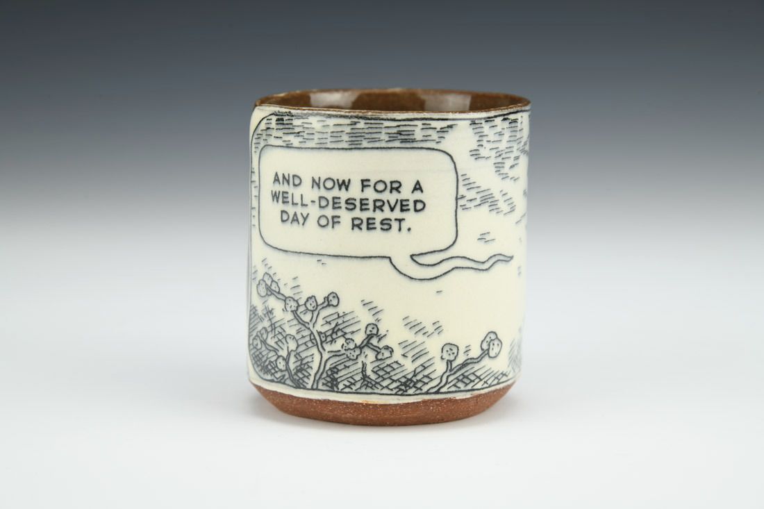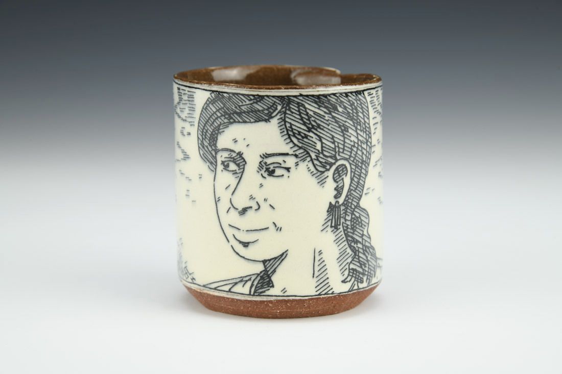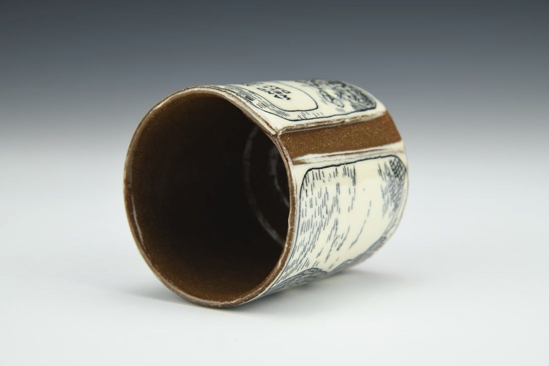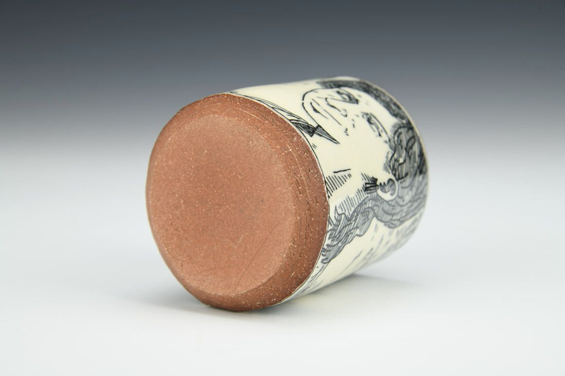 Brooklyn Red stoneware, hand built, screenprinted ink, underglaze, cone 6 electric fired, 2.5 x 2.5 x 2.5 inches.