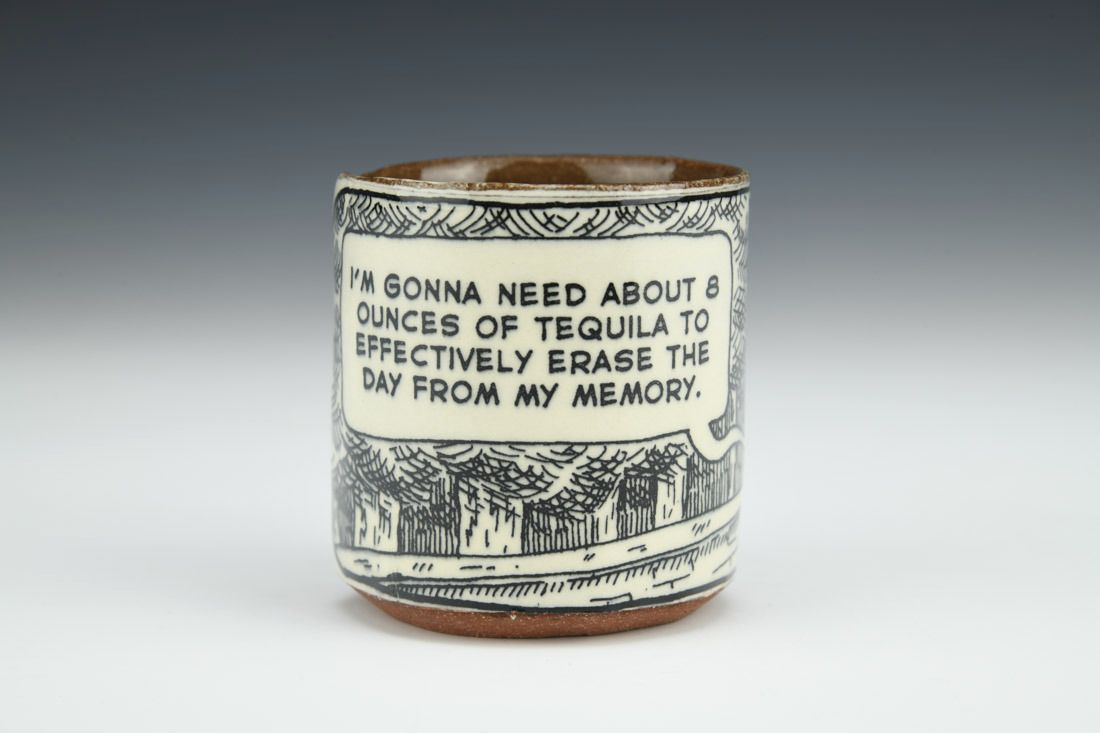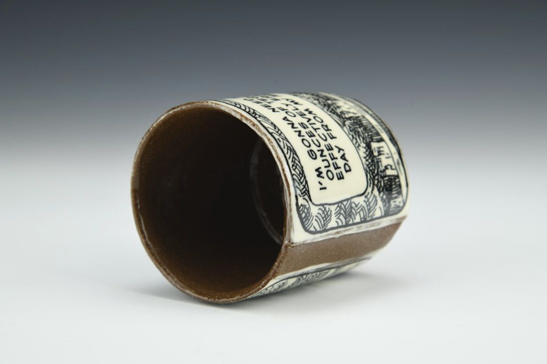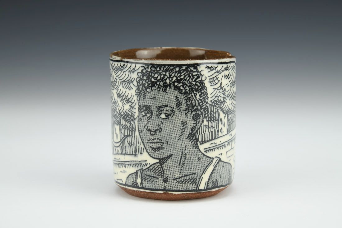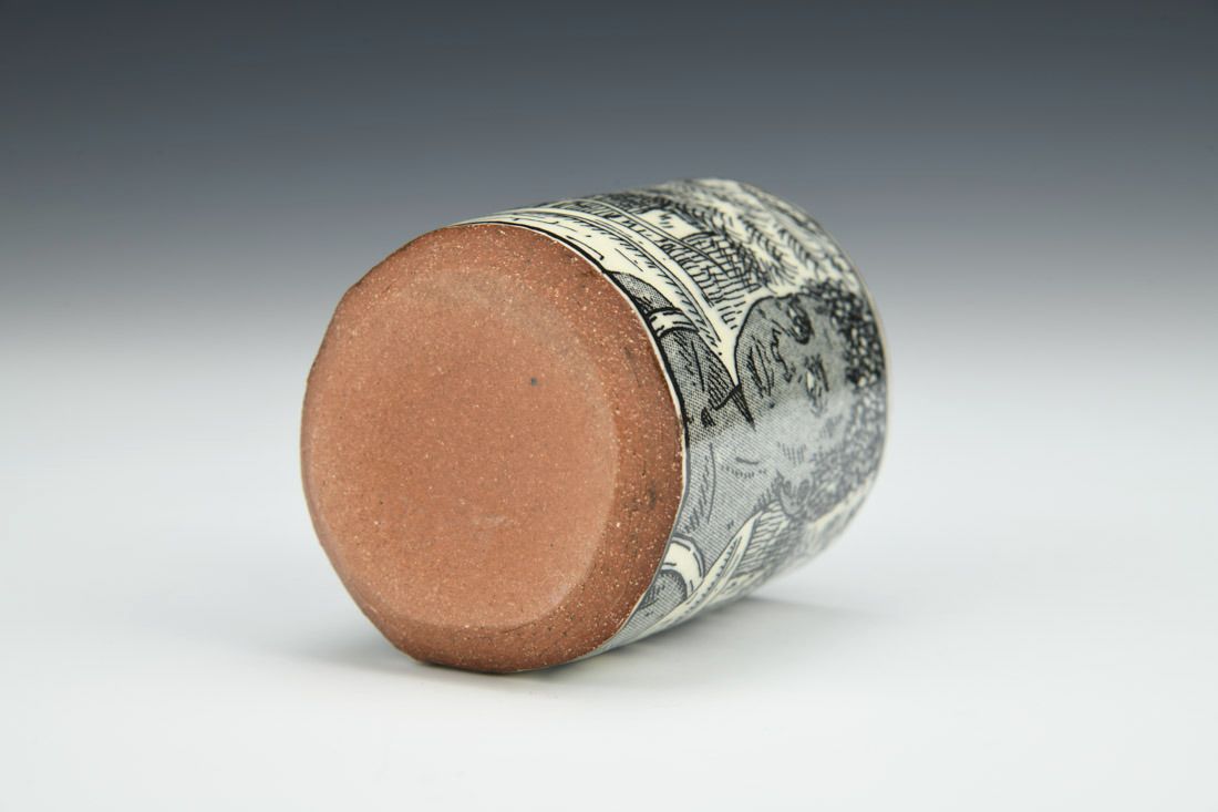 Brooklyn Red stoneware, hand built, screenprinted ink, underglaze, cone 6 electric fired, 2.5 x 2.5 x 2.5 inches.