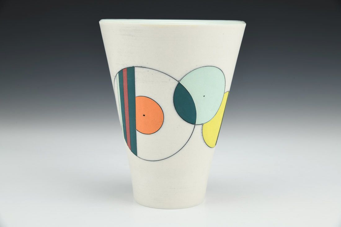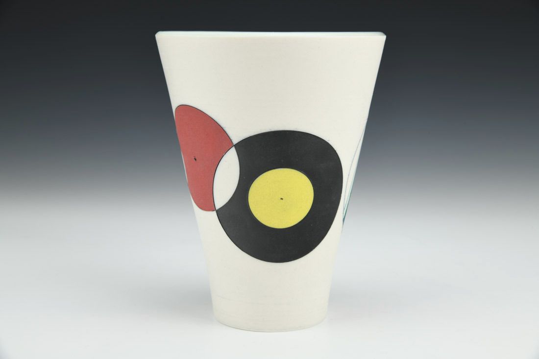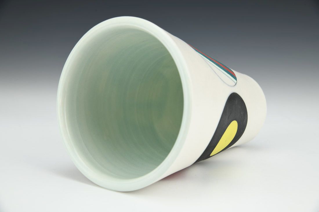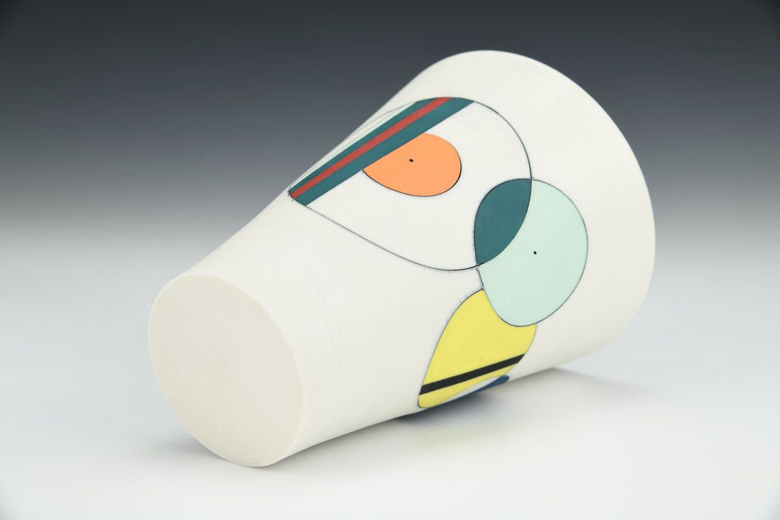 Porcelain, wheel thrown, mishima, underglaze, glaze, cone 6 oxidation fired, 5.25 x 4 x 4 inches.