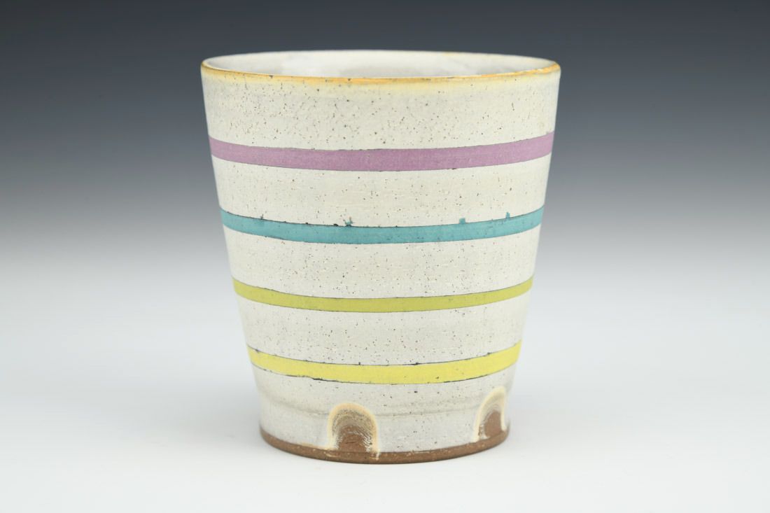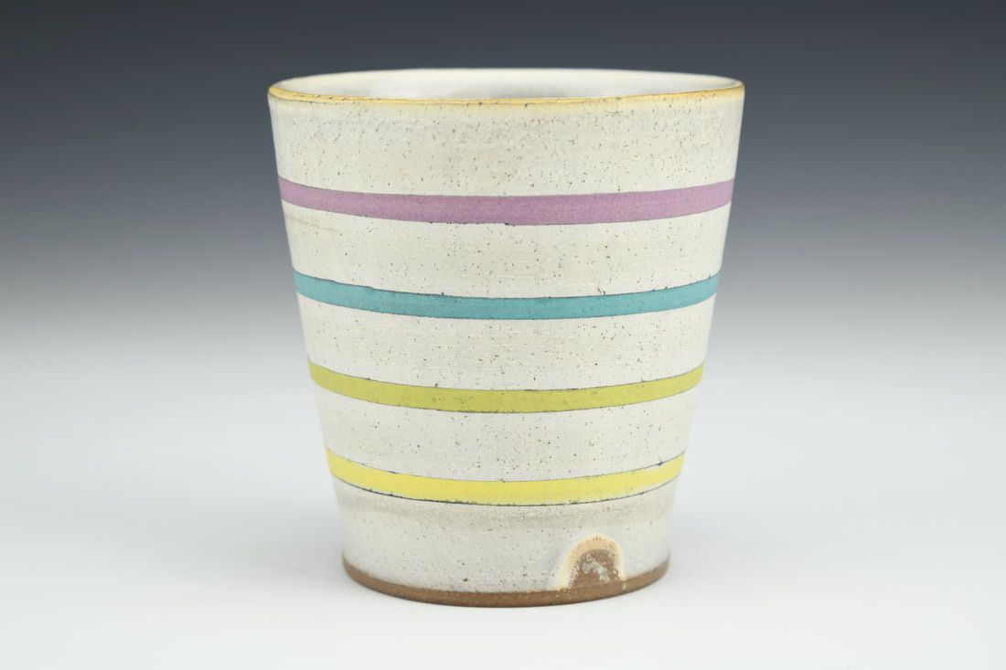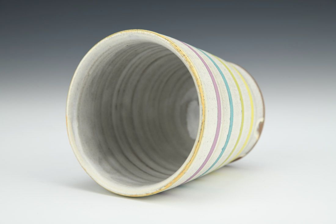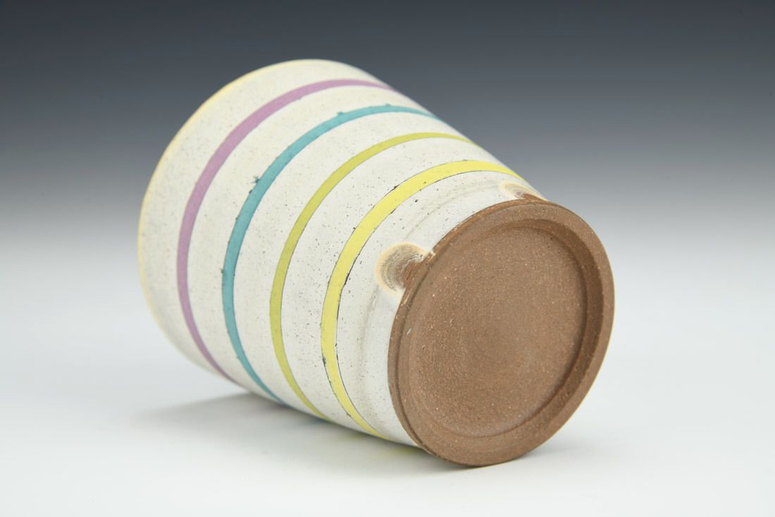 Stoneware, wheel thrown, slip, underglaze, cone 6 oxidation fired, 3.5 x 3.25 x 3.25 inches.