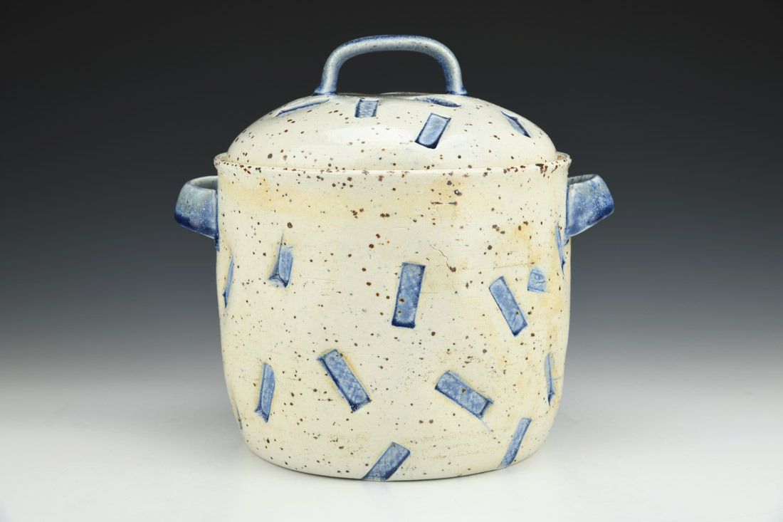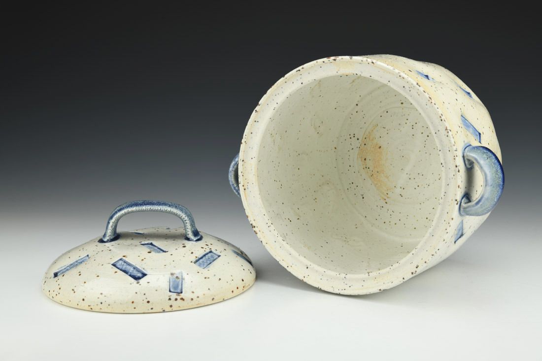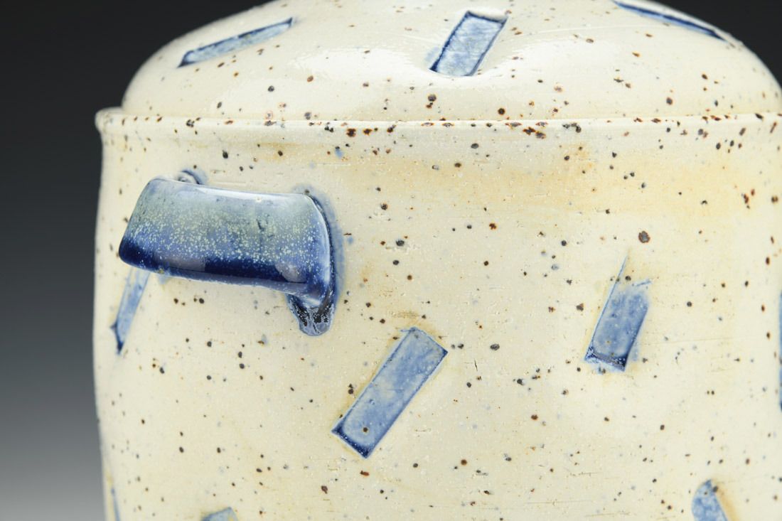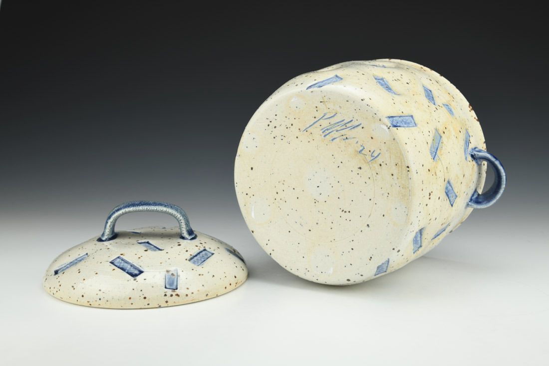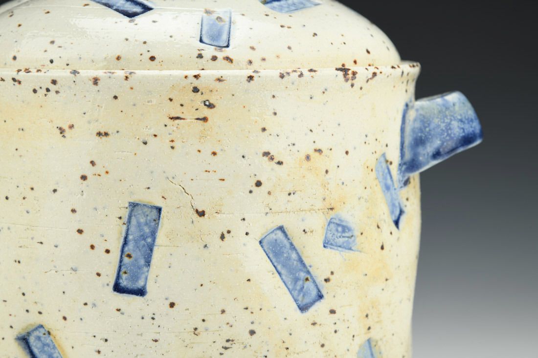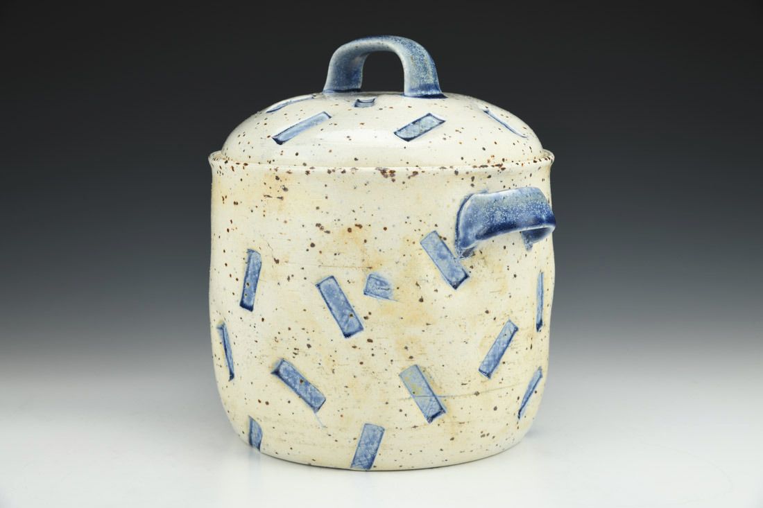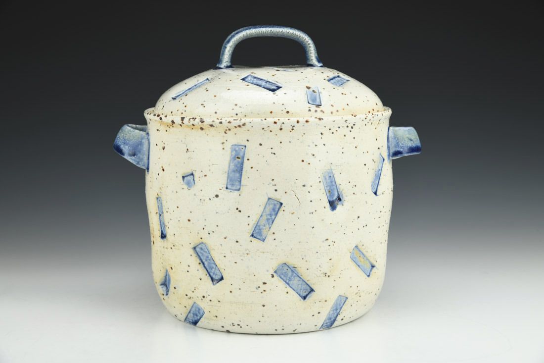 Porcelain with mica inclusions, wheel thrown and altered, cone 11 woodfired, 9.5 x 10 x 8.25 Inches.