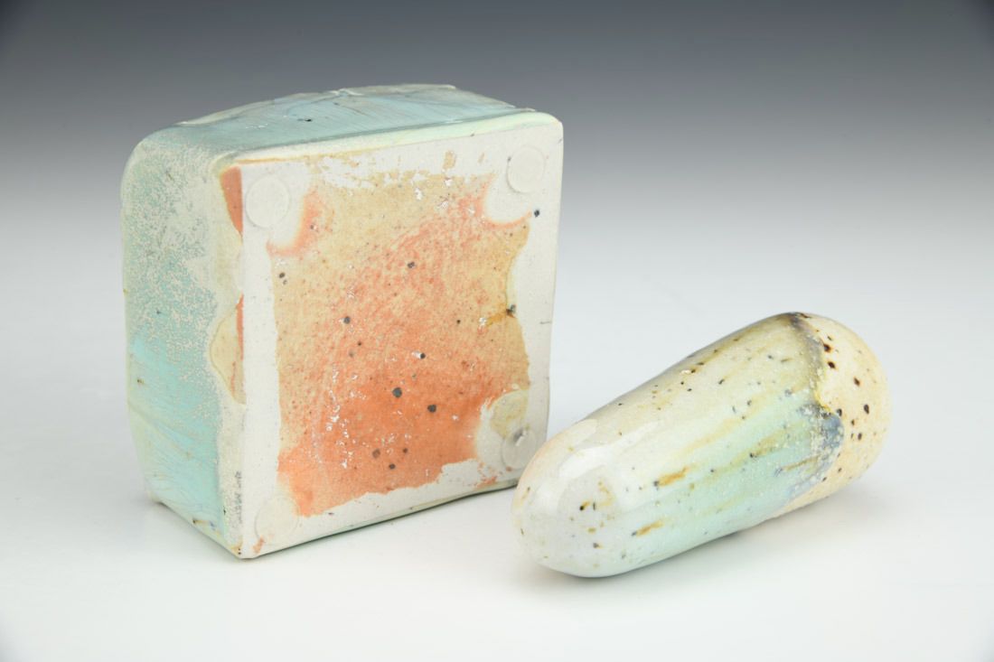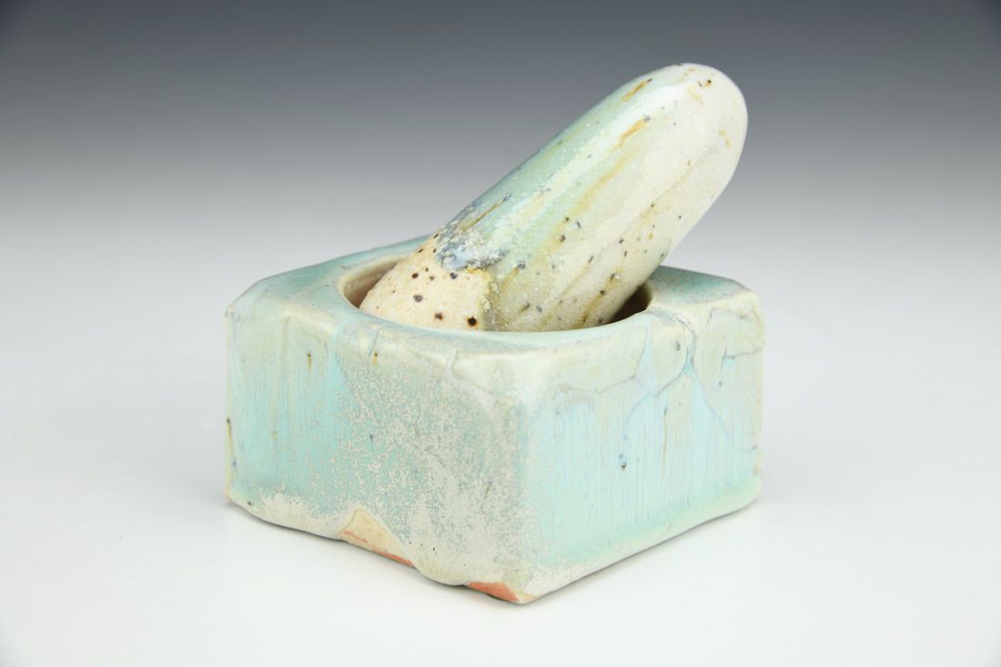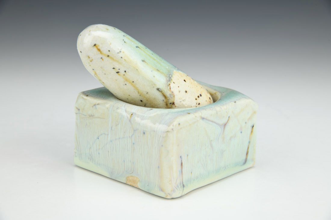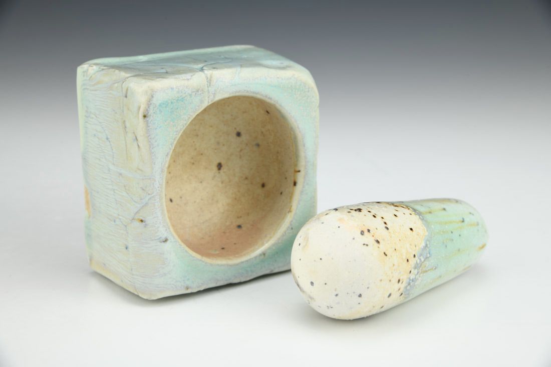 Porcelain with mica inclusions, plastic feet, wheel thrown, press molded, cone 11 salt/wood fired, pestle: 4 x 1.5 x 1.5 inches, mortar: 2 x 3.25 x 3.25 inches.