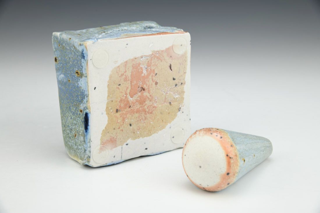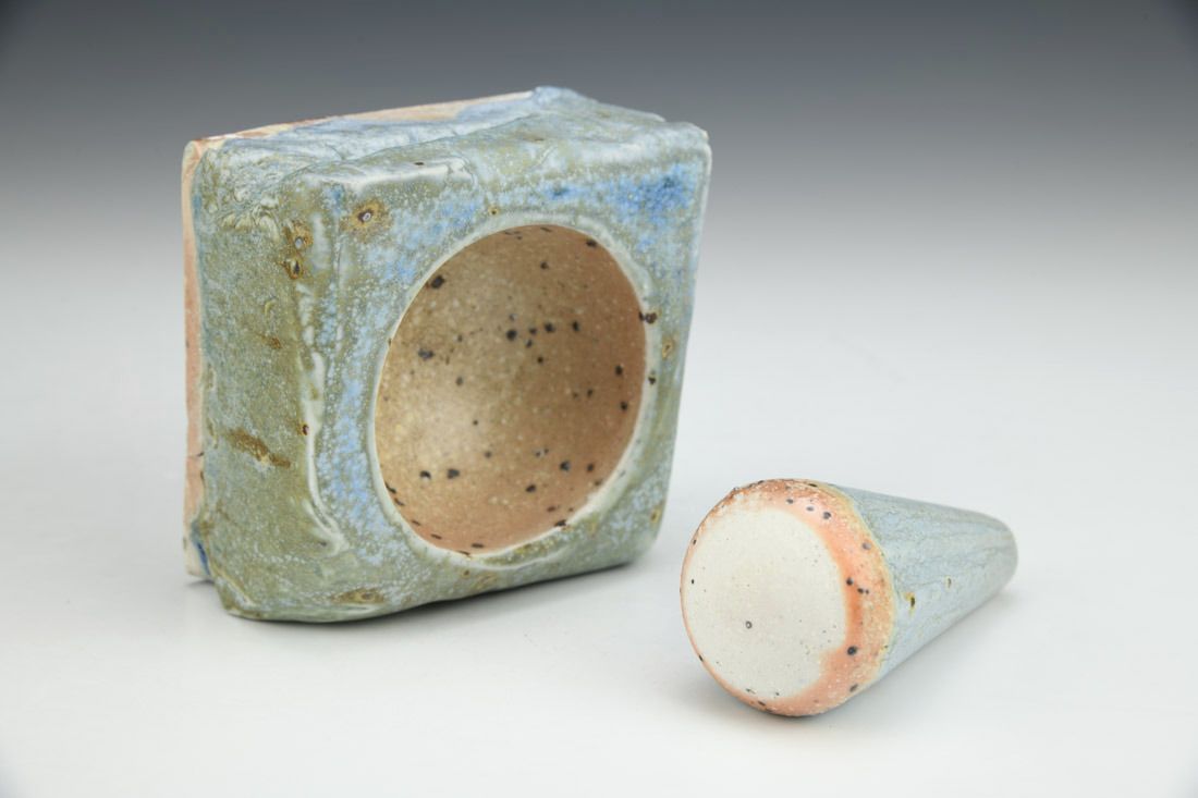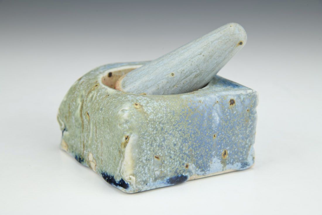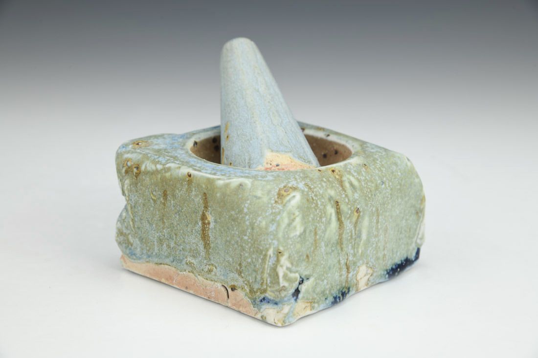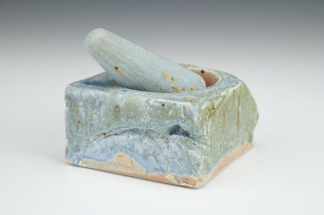 Porcelain with mica inclusions, plastic feet, wheel thrown, press molded, cone 11 salt/wood fired, pestle: 3.25 x 1.5 x 1.5 inches, mortar: 2 x 3.25 x 3.25 inches.