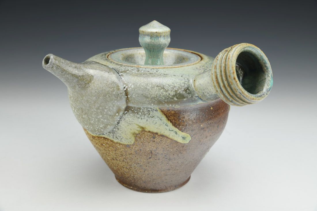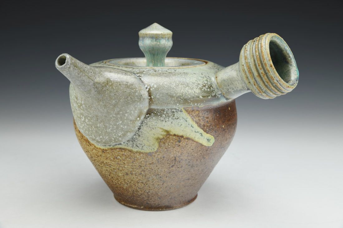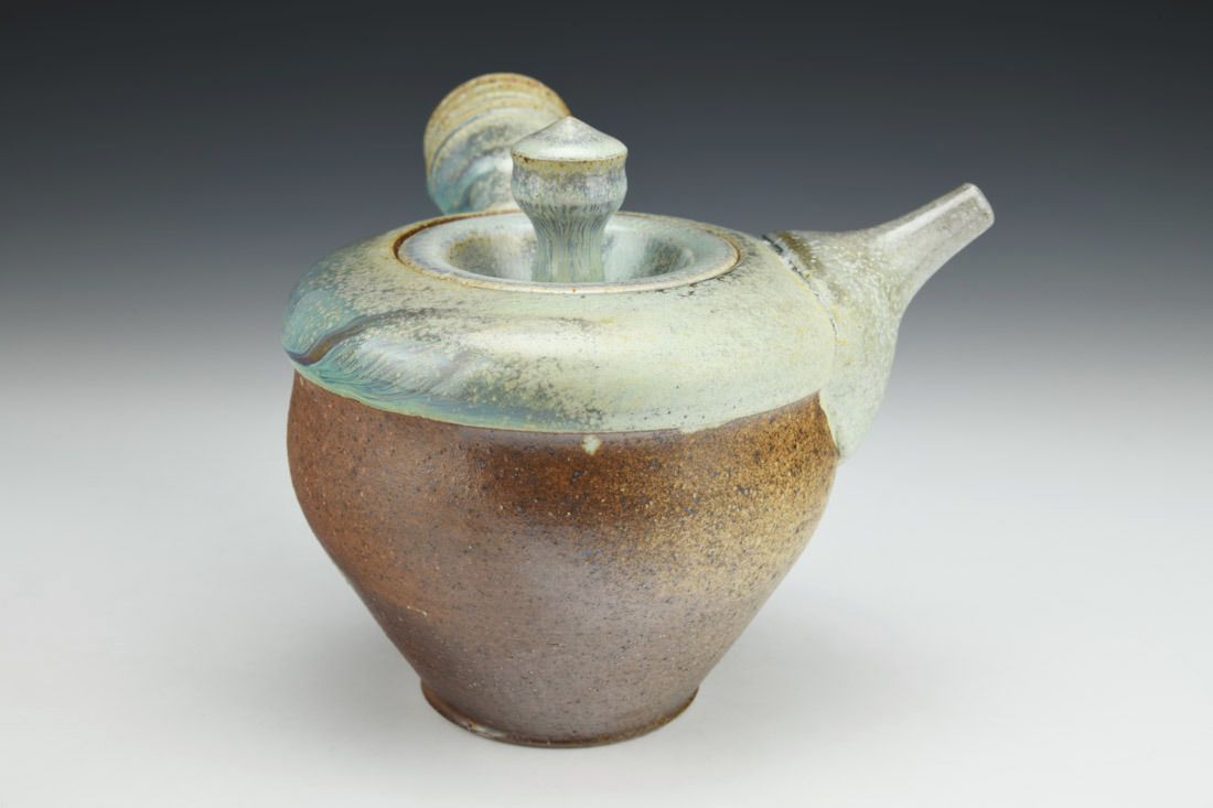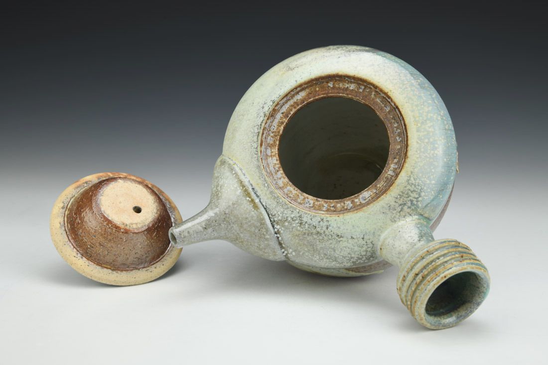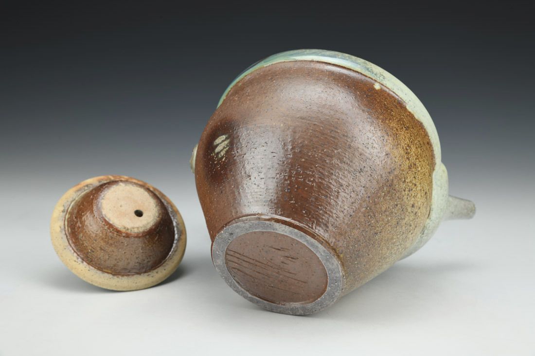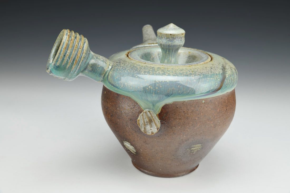 Stoneware, wheel thrown and altered, cone 11 salt/wood fired on seashells, 6.5 x 7.75 x 7.5 inches.