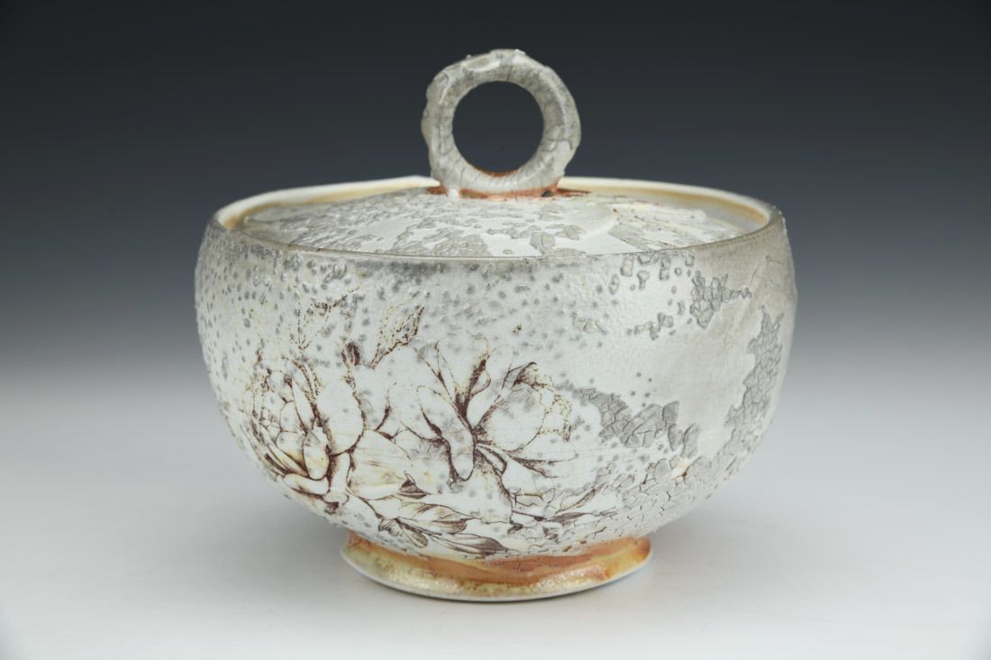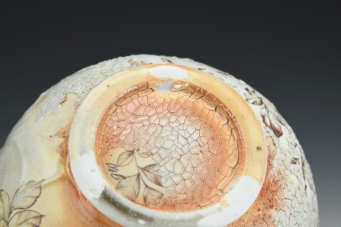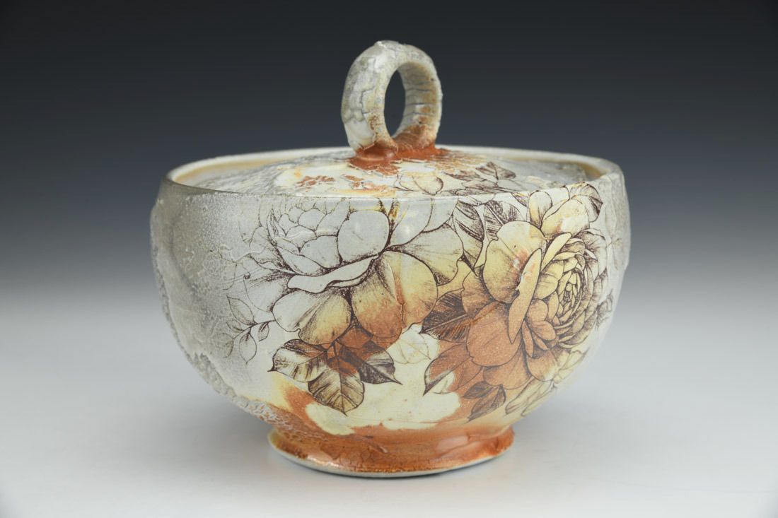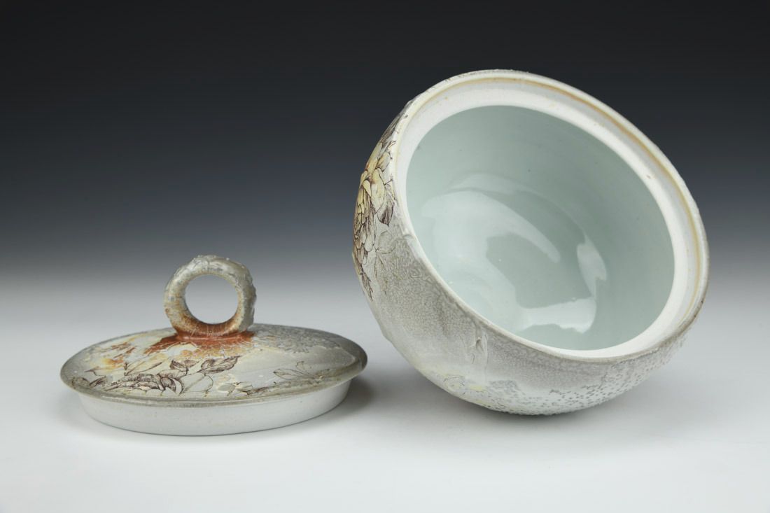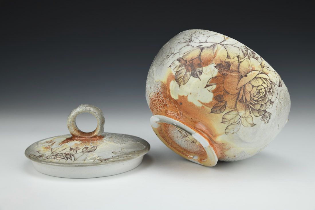 Porcelain, wheel thrown, decals, cone 10 soda fired, 6 x 6.75 x 6.75 inches.