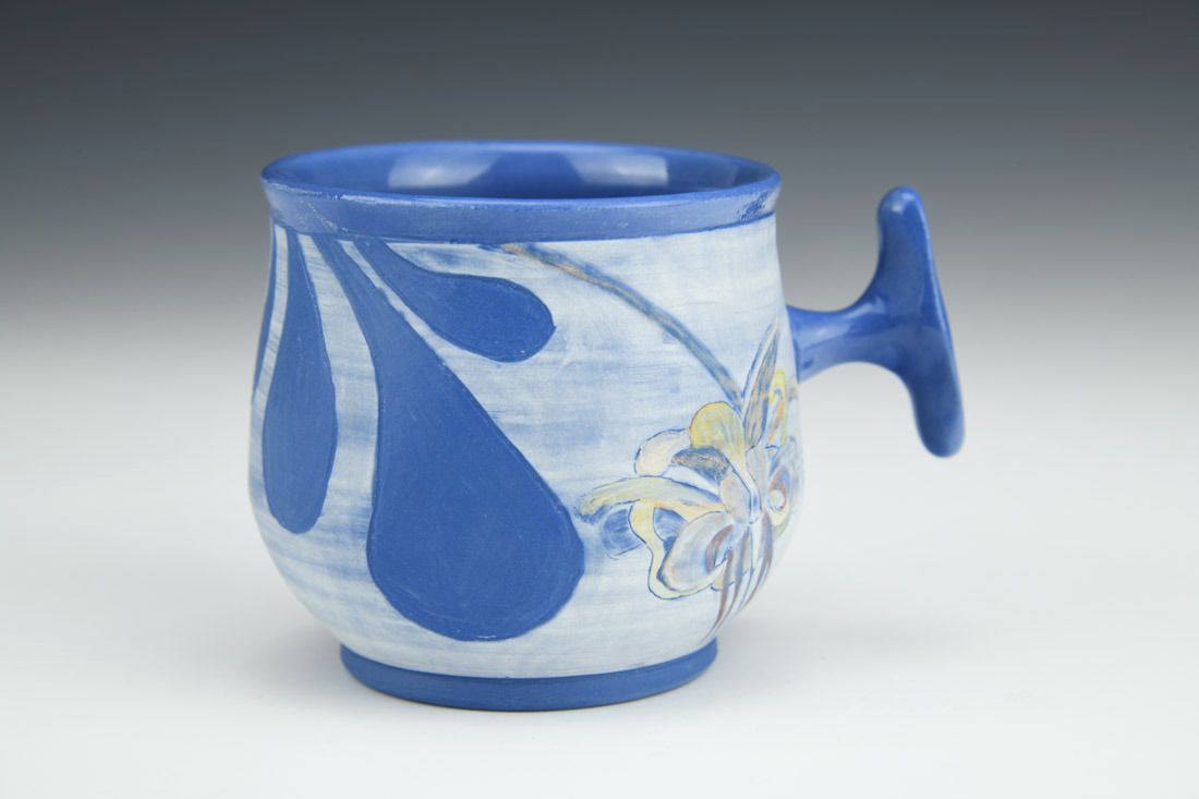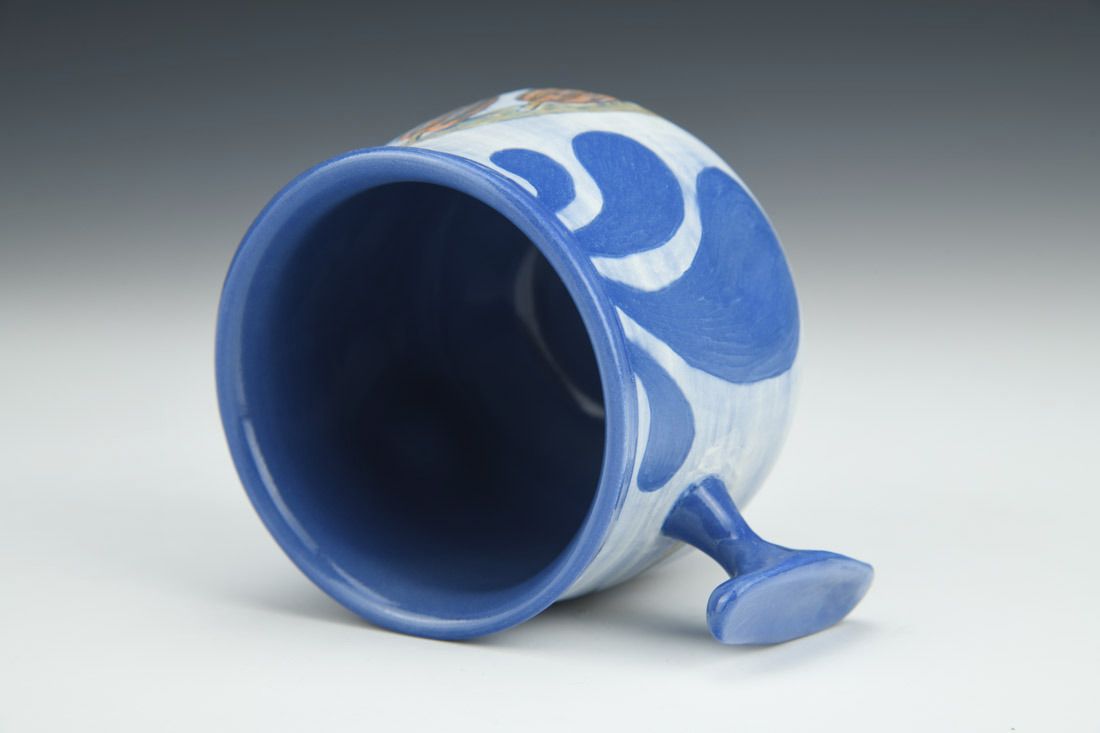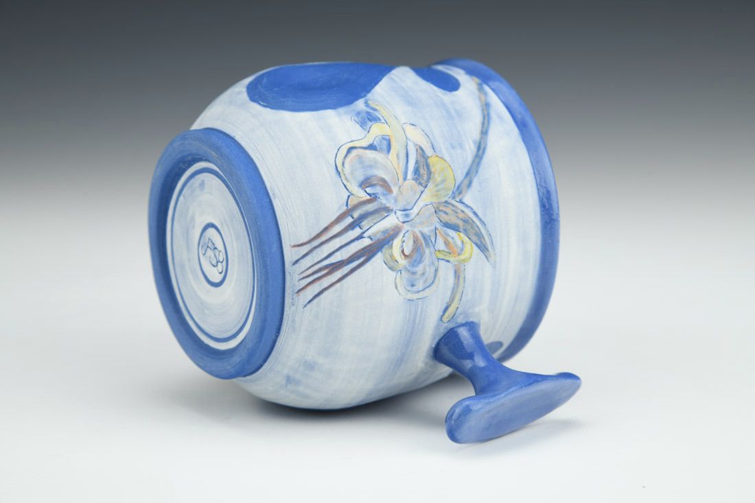 Sio2 Upsala Porcelain, wheel thrown, sgraffito, Sio2 Aneto Slip, underglaze watercolors, cone 6 fired, 3 x 4.25 x 3 inches.