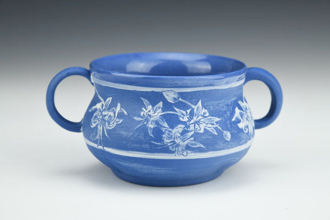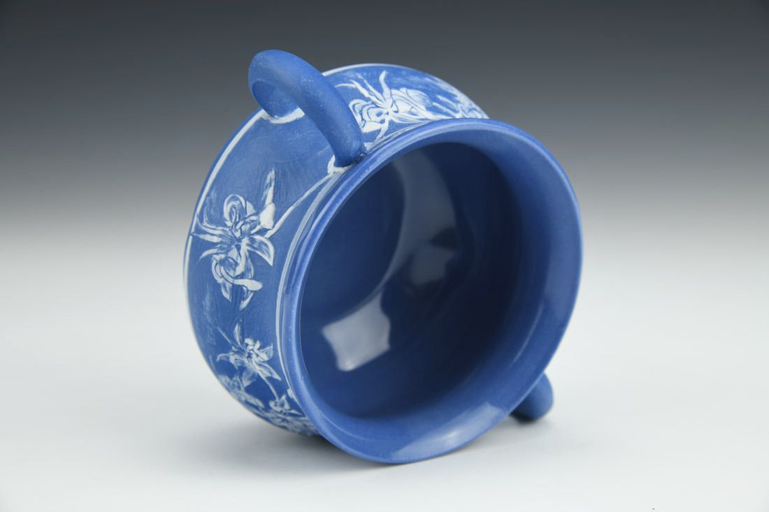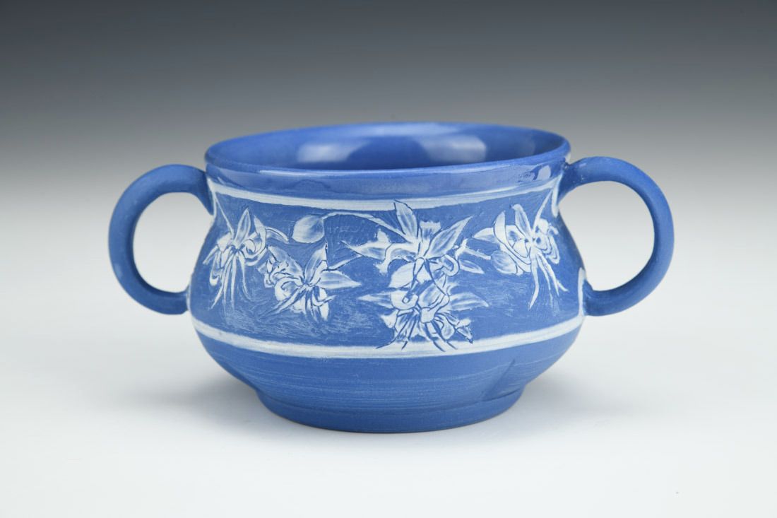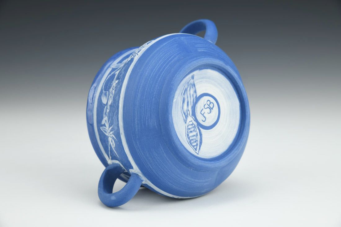 Sio2 Upsala Porcelain, wheel thrown, sgraffito, Sio2 Aneto Slip, cone 6 fired, 2.25 x 5 x 3.5 inches.