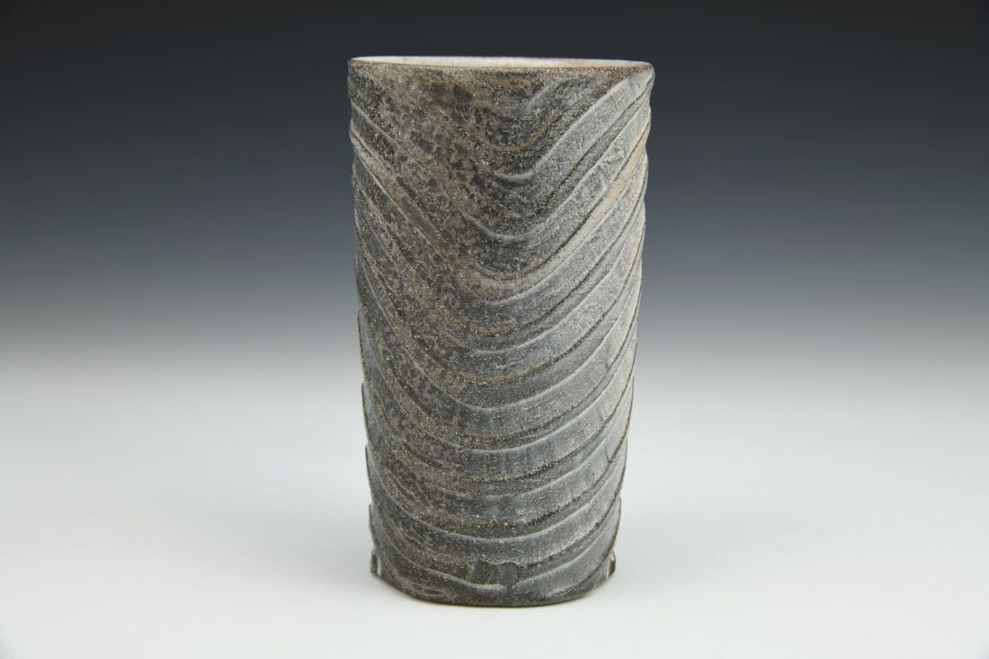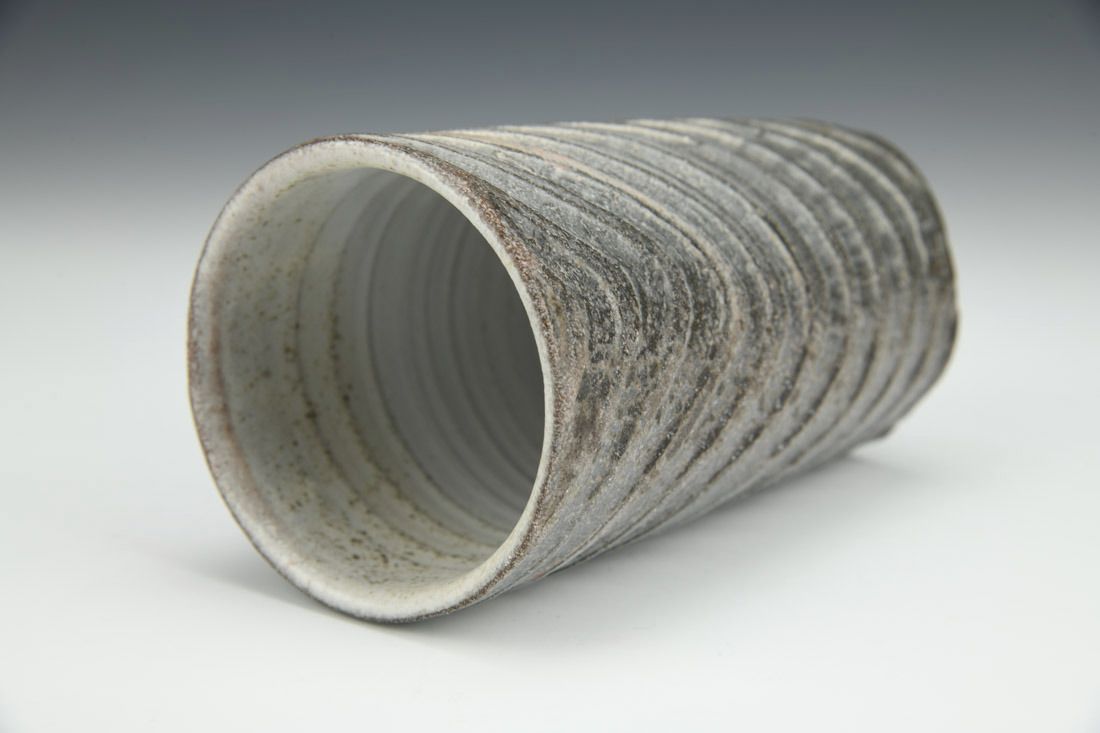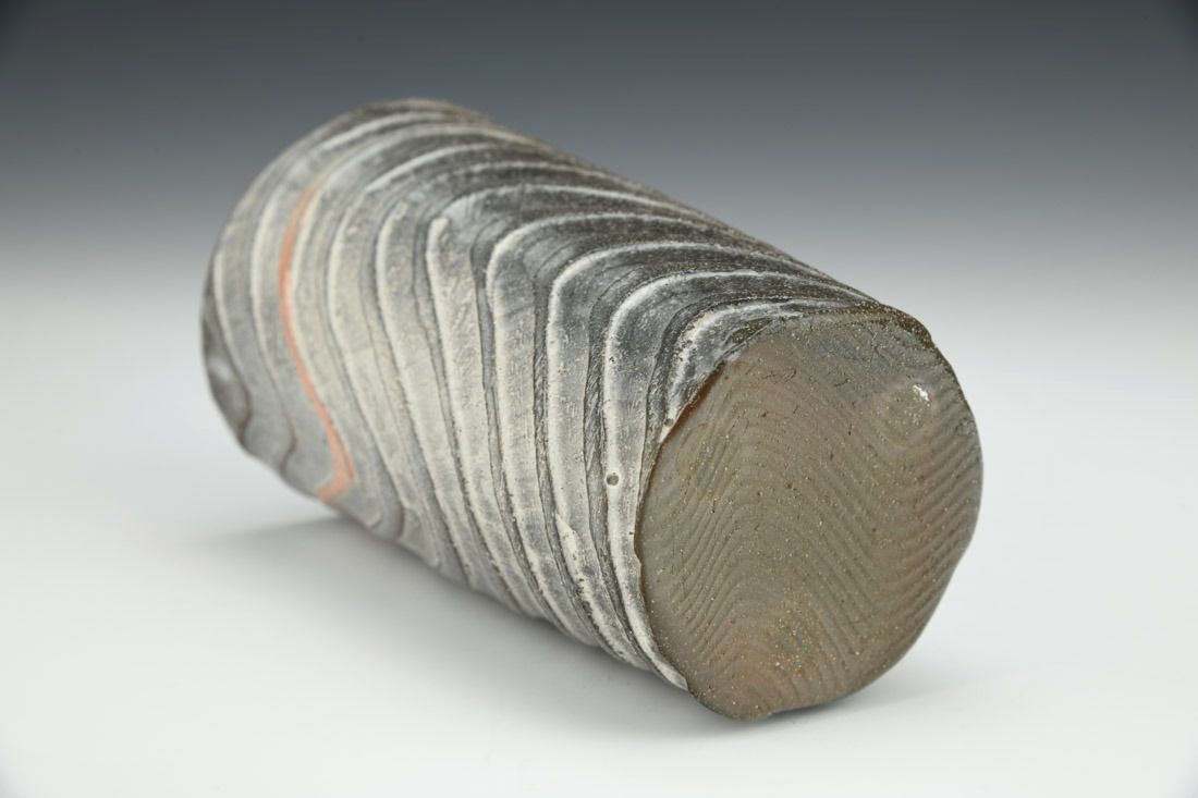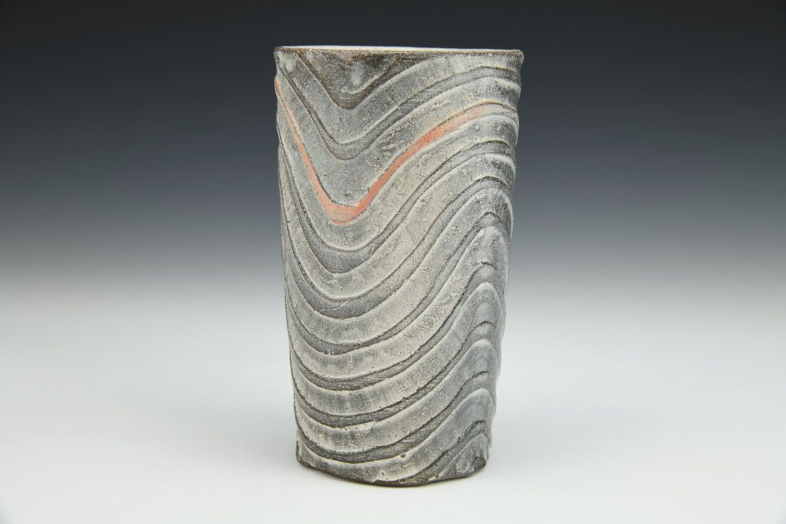 Earthenware, wheel thrown and carved, slip, terra sigillata, glaze, low-fire soda in wood kiln, 5.5 x 3.5 x 3.5 inches.