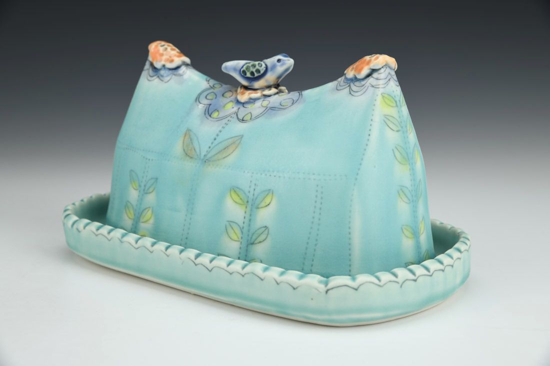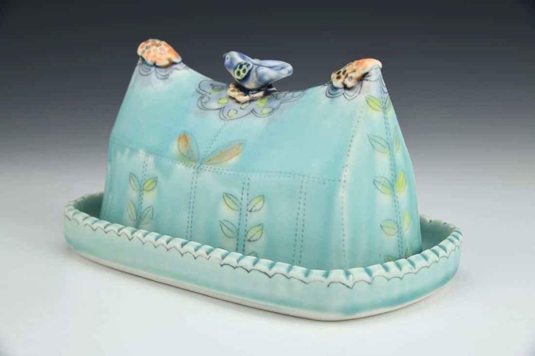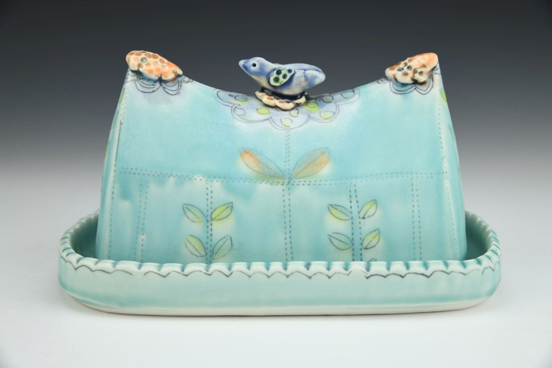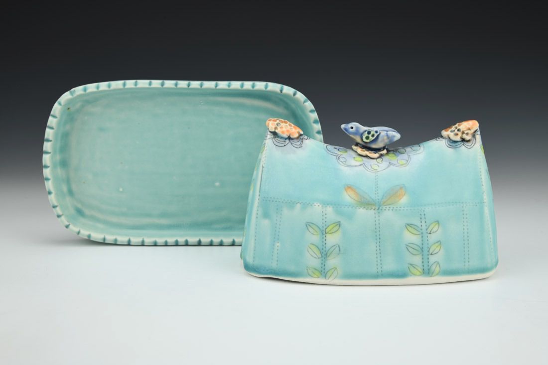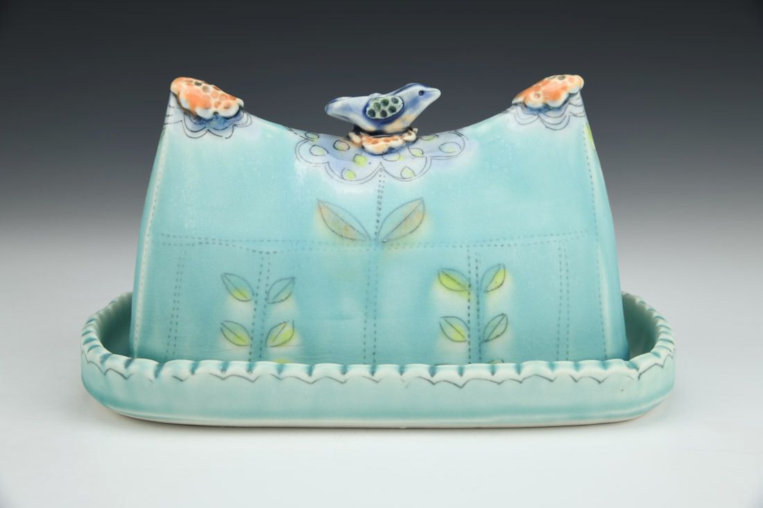 Aqua Butter Dish with Blue Bird