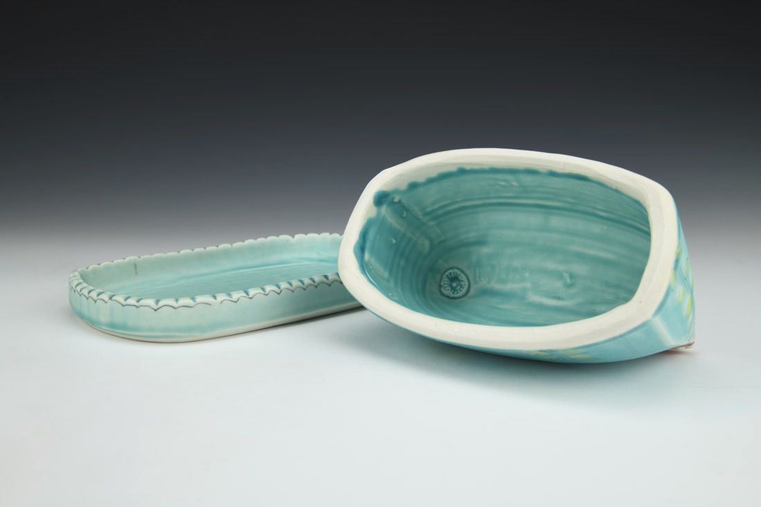 Porcelain, wheel thrown, inlaid stain, semi-matte white glaze with blue and green accent glazes, cone 8 oxidation fired, 3.5 x 8 x 4.25 inches.