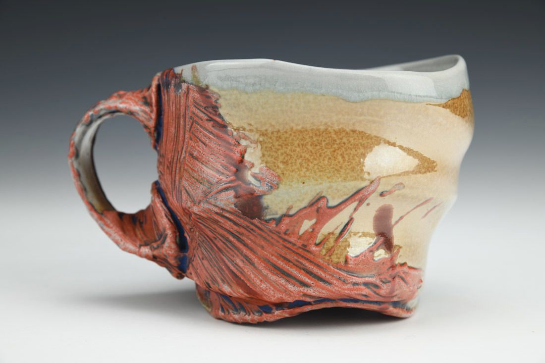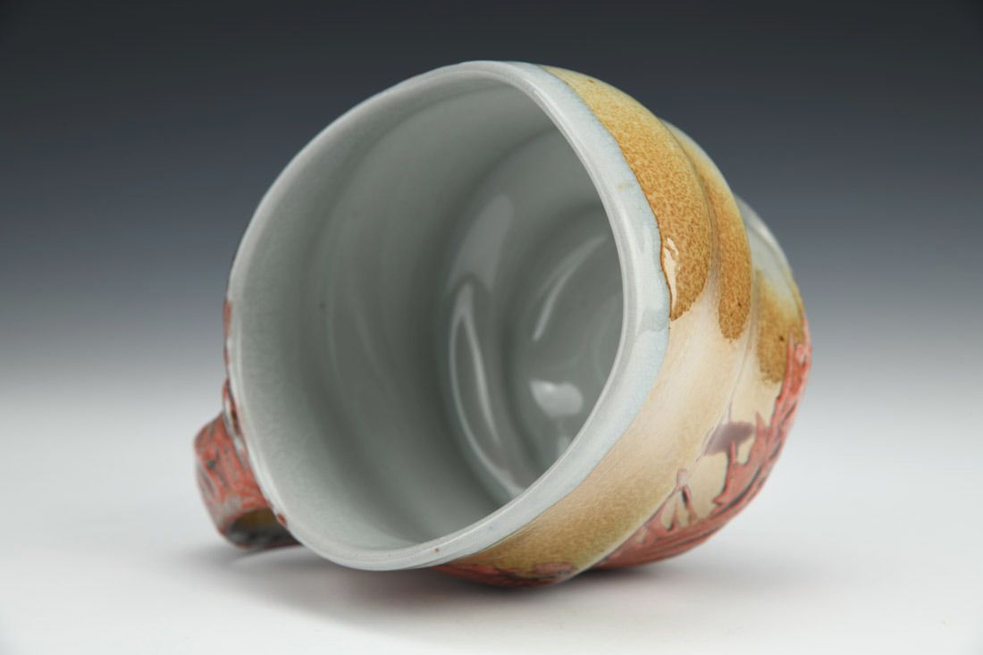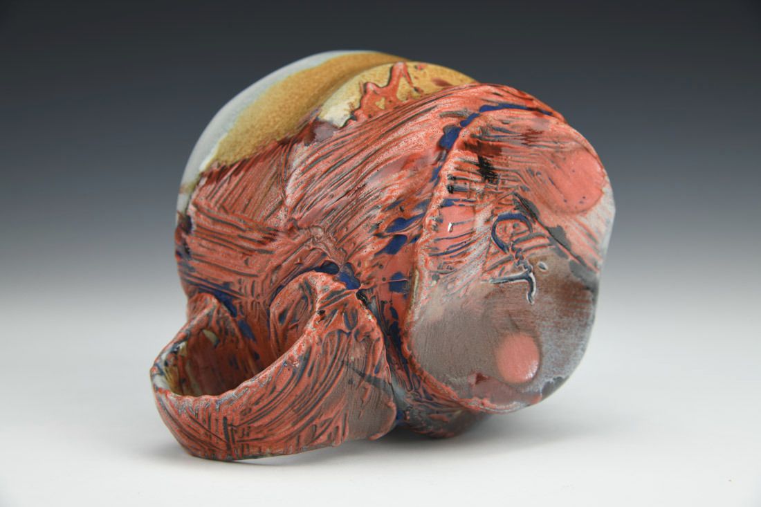Flashing porcelain, wheel thrown and altered, engobes, underglaze, cone 11 soda fired, 3.5 x 5.25 x 3.25 inches.