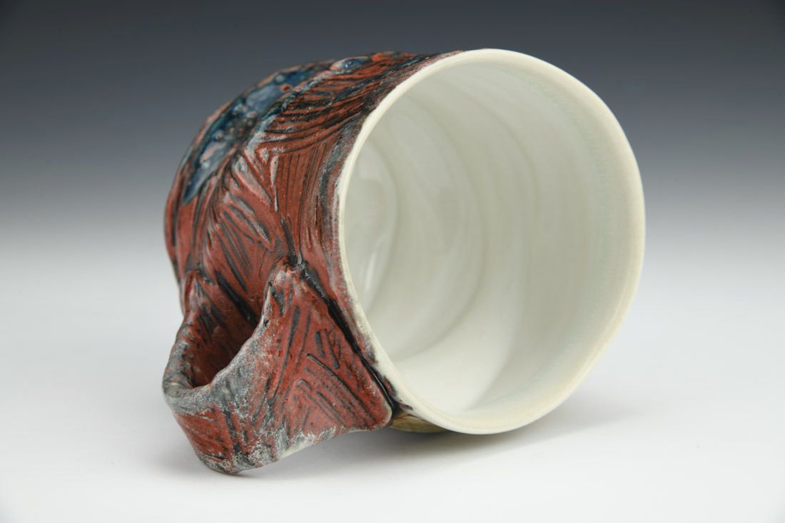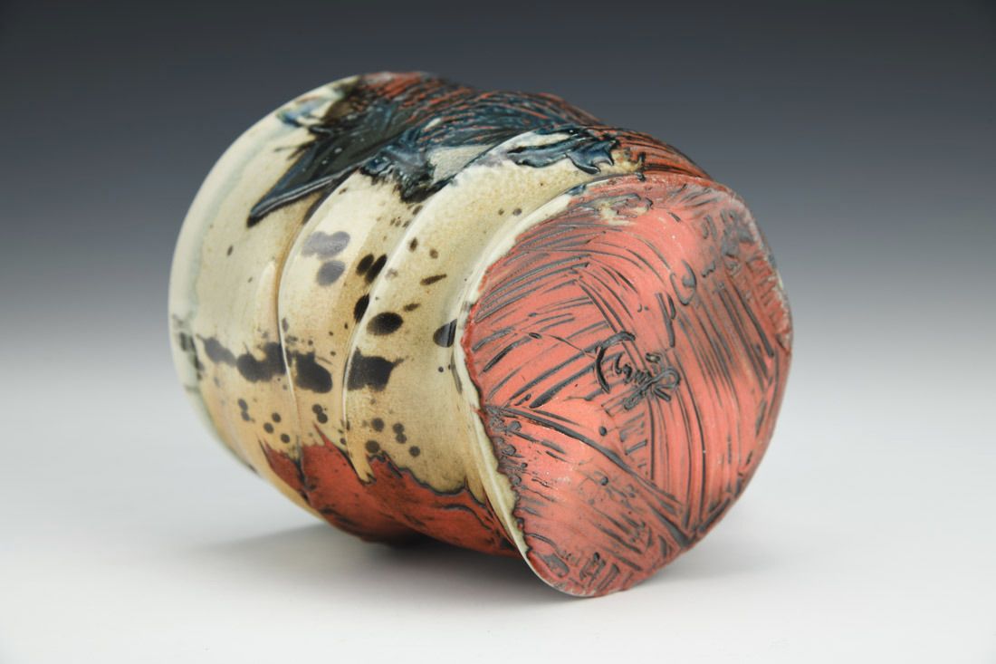 Flashing porcelain, wheel thrown and altered, engobes, underglaze, cone 11 soda fired, 3.75 x 5 x 4 inches.