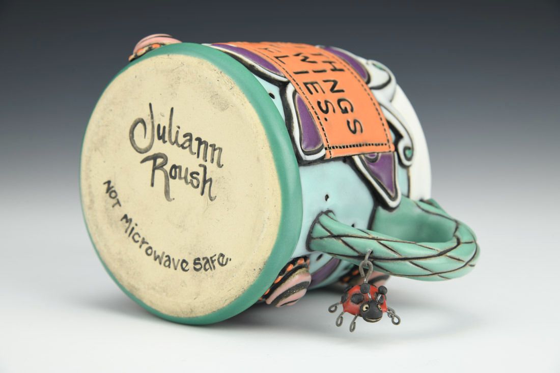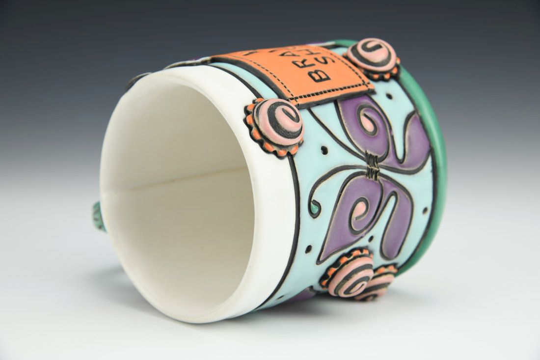 White stoneware with nichrome wire, hand built with slabs, stamped, cone 5 electric fired, 3.75 x 5.5 x 4 inches.