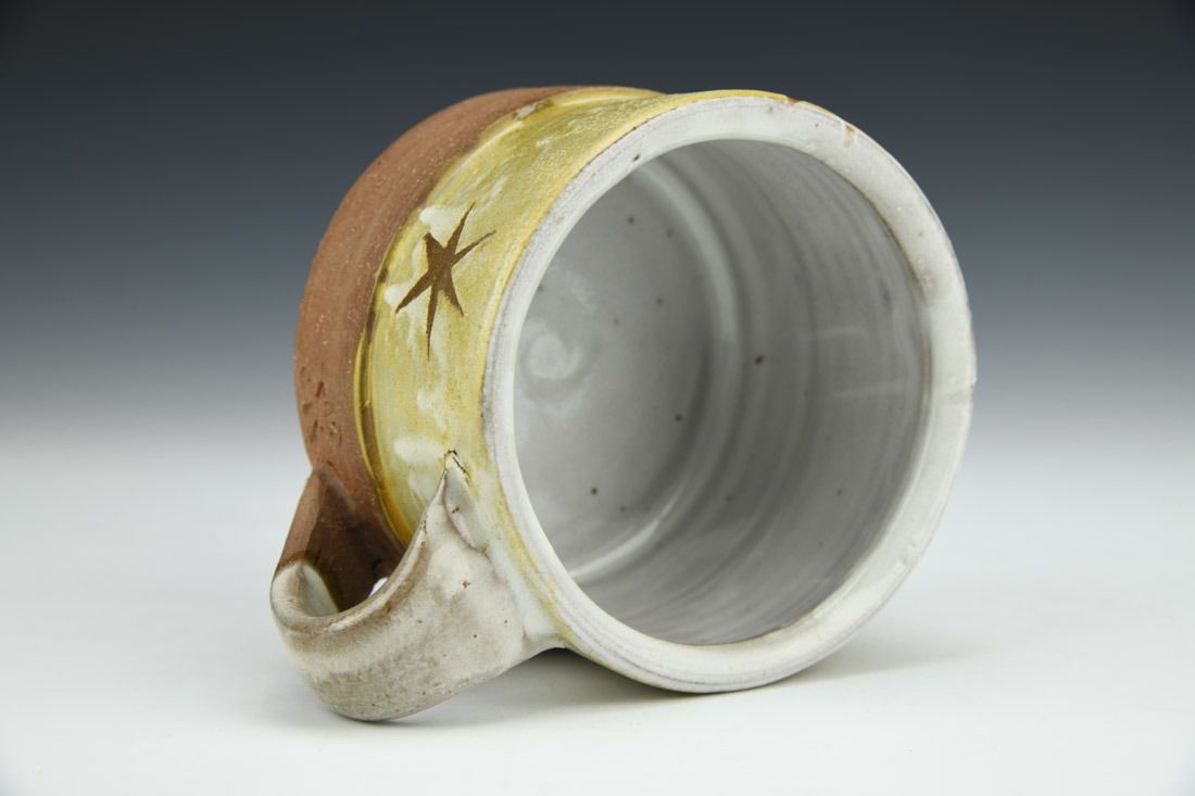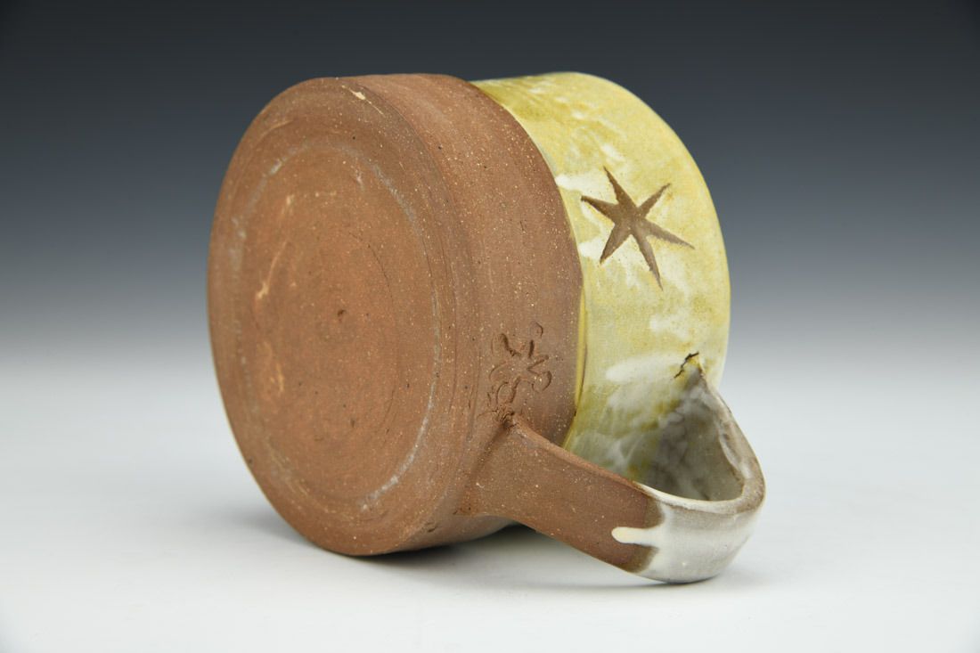Earthenware, wheel thrown, paper resist, slip, underglaze, cone 6 electric fired, 2.75 x 5.25 x 4 inches.