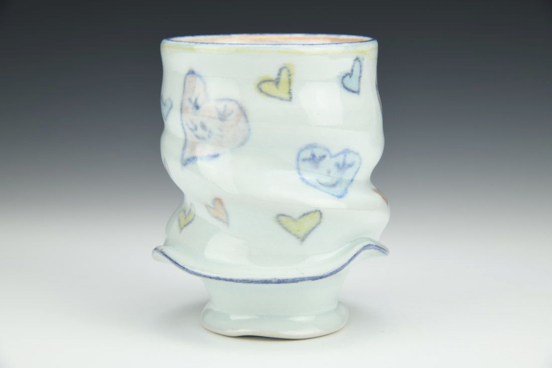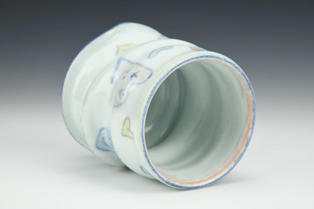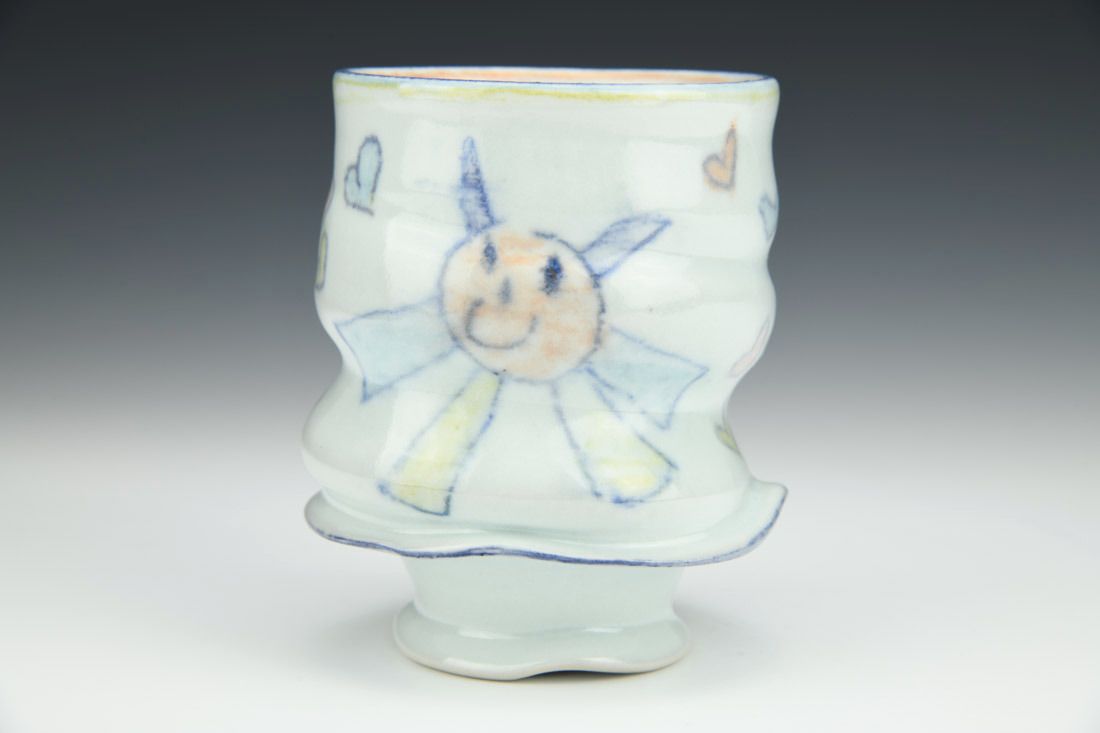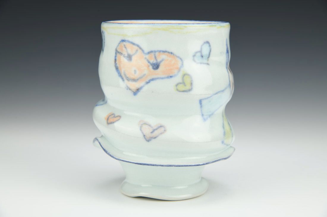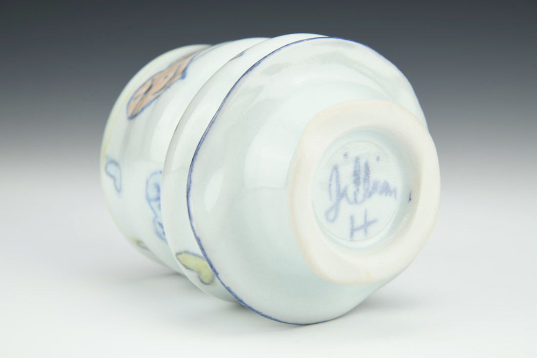 Porcelain, wheel thrown, newsprint transfers, underglaze chalk, clear glaze, cone 10 reduction fired, 4 x 3.5 x 3.5 inches.