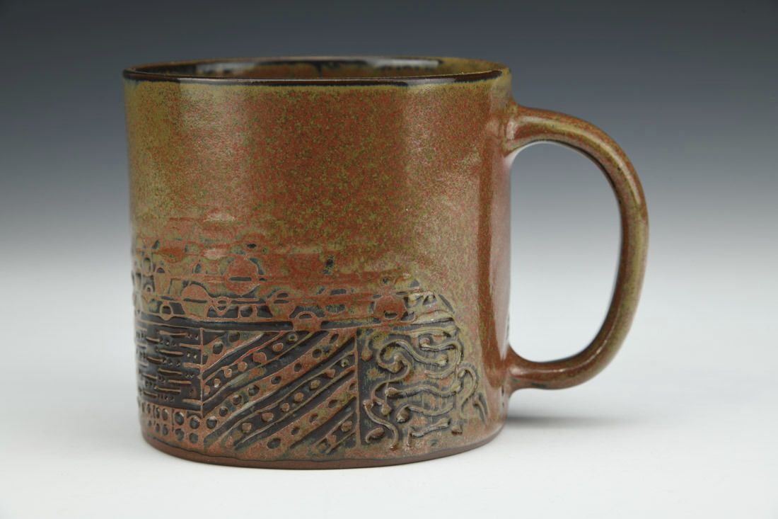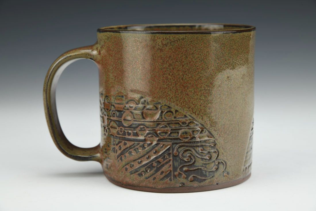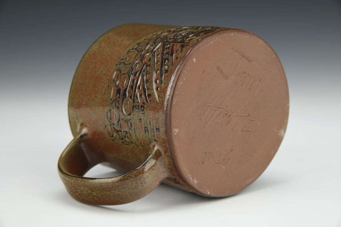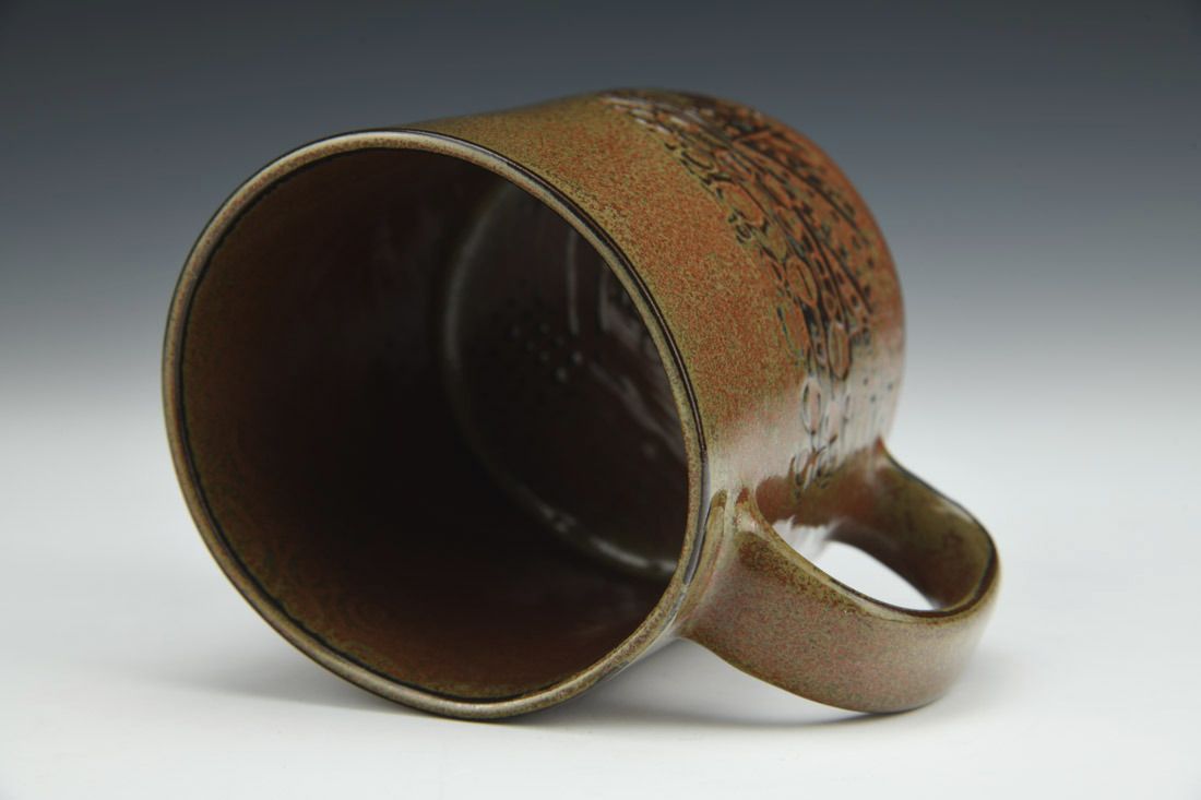 Red stoneware, hand built, stamped with handmade laser cut rolling pins, cone 6 electric fired, 3.5 x 4.75 x 3.5 inches.