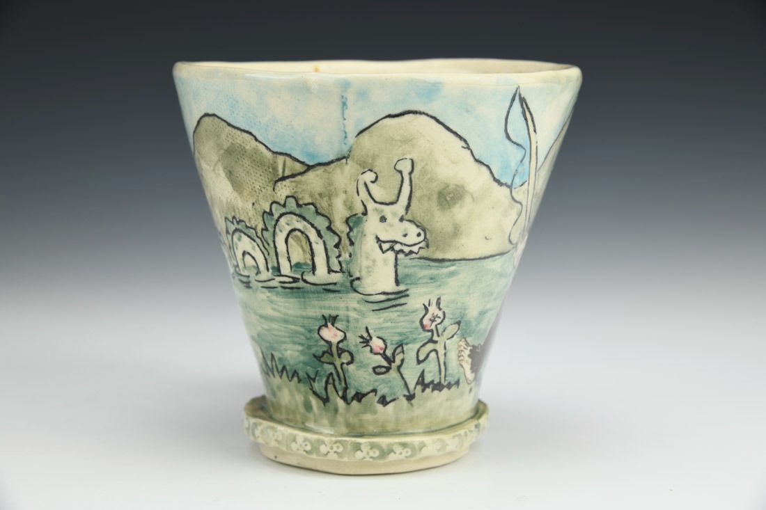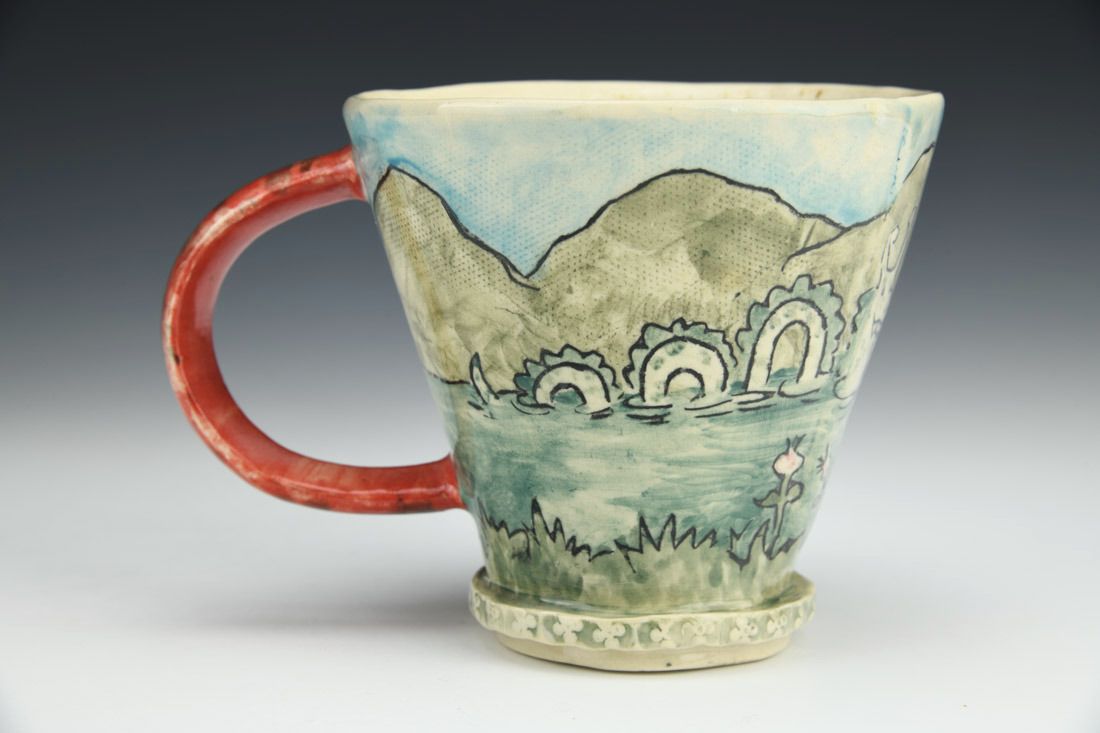Porcelain, hand built with slabs, underglaze, underglaze image transfer, glaze, cone 6 electric fired, 4.25 x 6 x 4.25 inches.