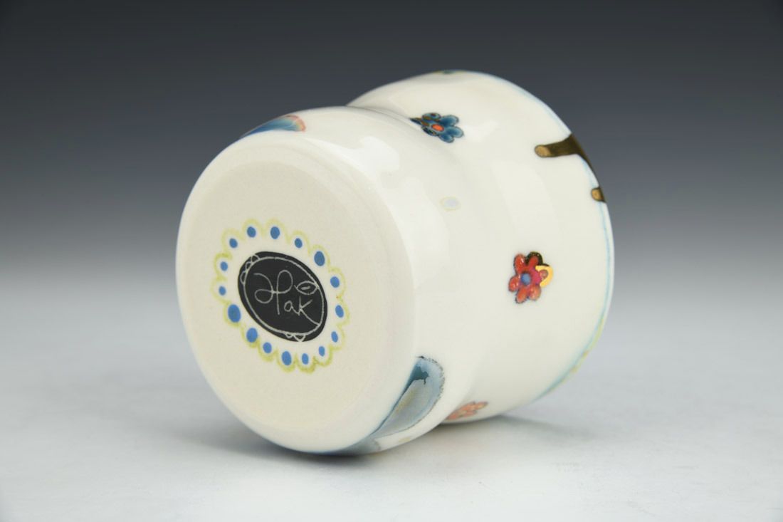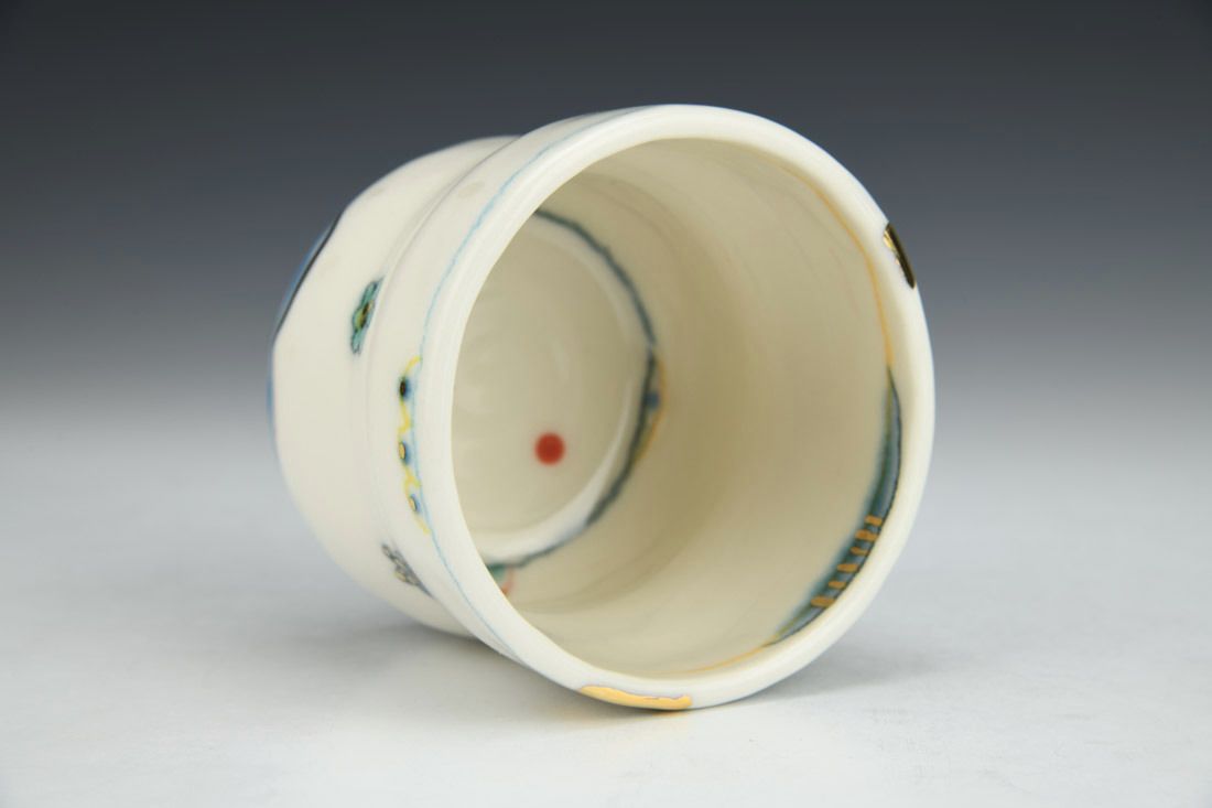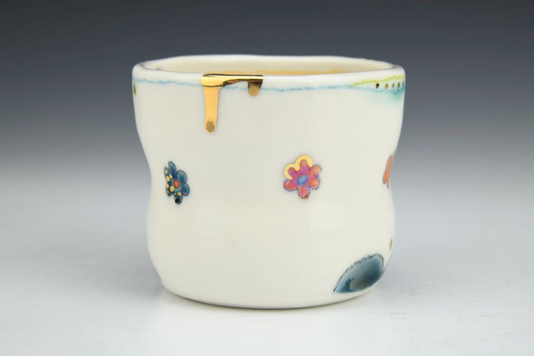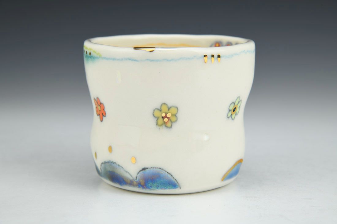 Porcelain, hand built with coils and pinched, underglaze, underglaze pencil, glaze, gold luster, mother of pearl luster, cone 6 oxidation electric fired, 3 x 3.5 x 3.5 inches.