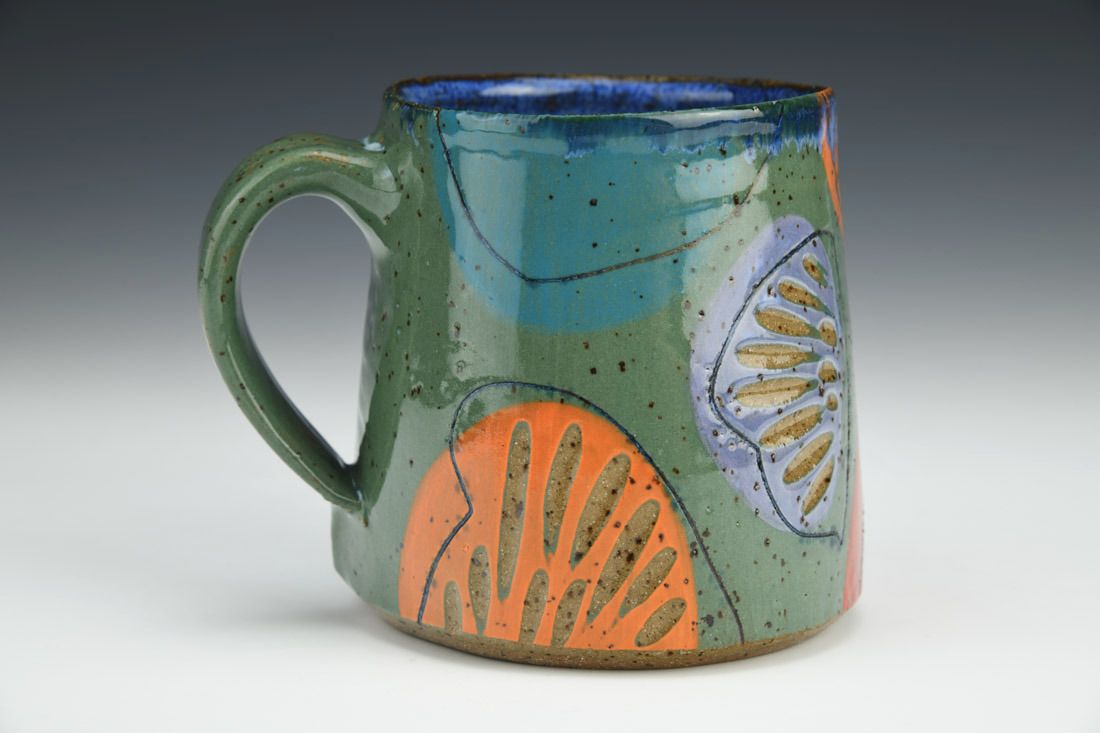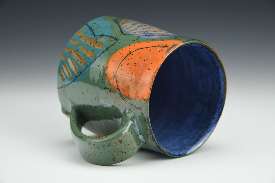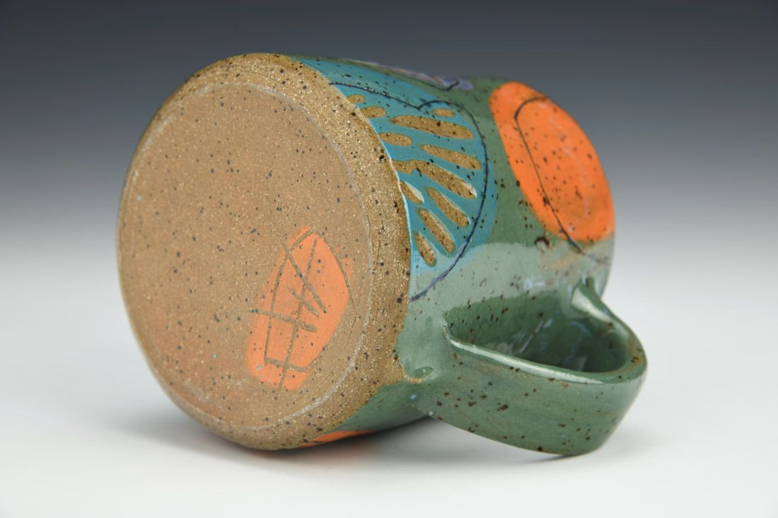Stoneware, wheel thrown, colored slips, underglazes, glazes, cone 6 oxidation fired, 4 x 5 x 3.75 inches.