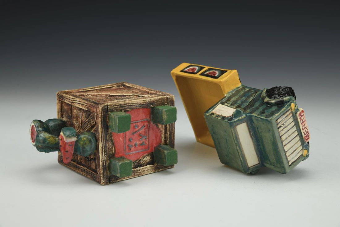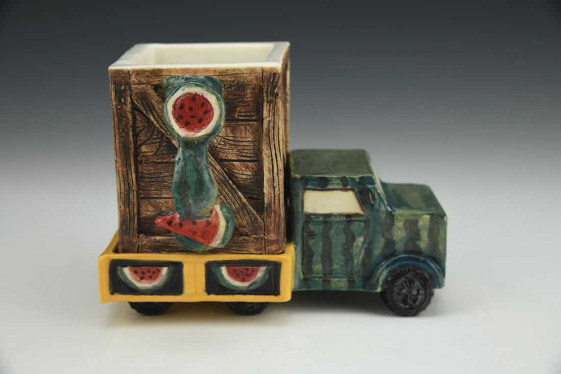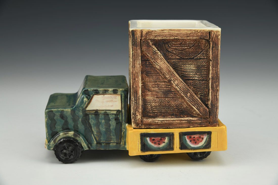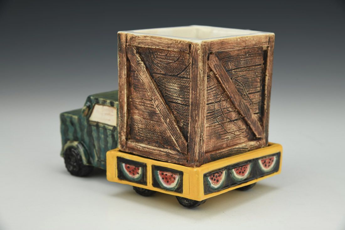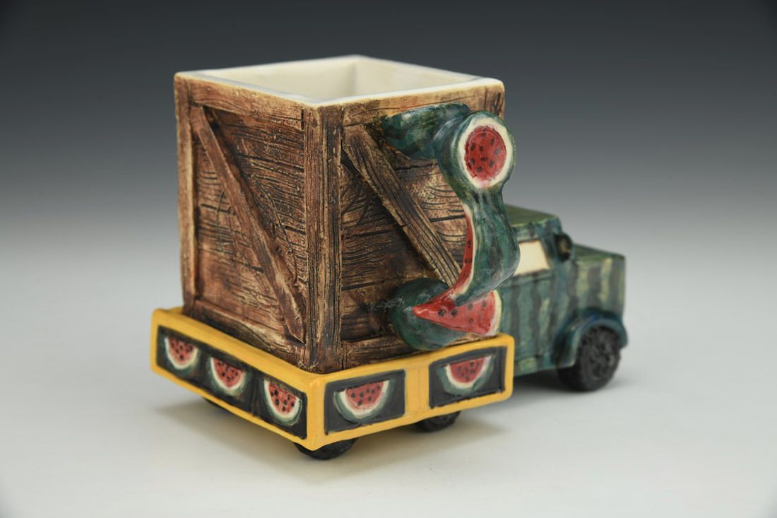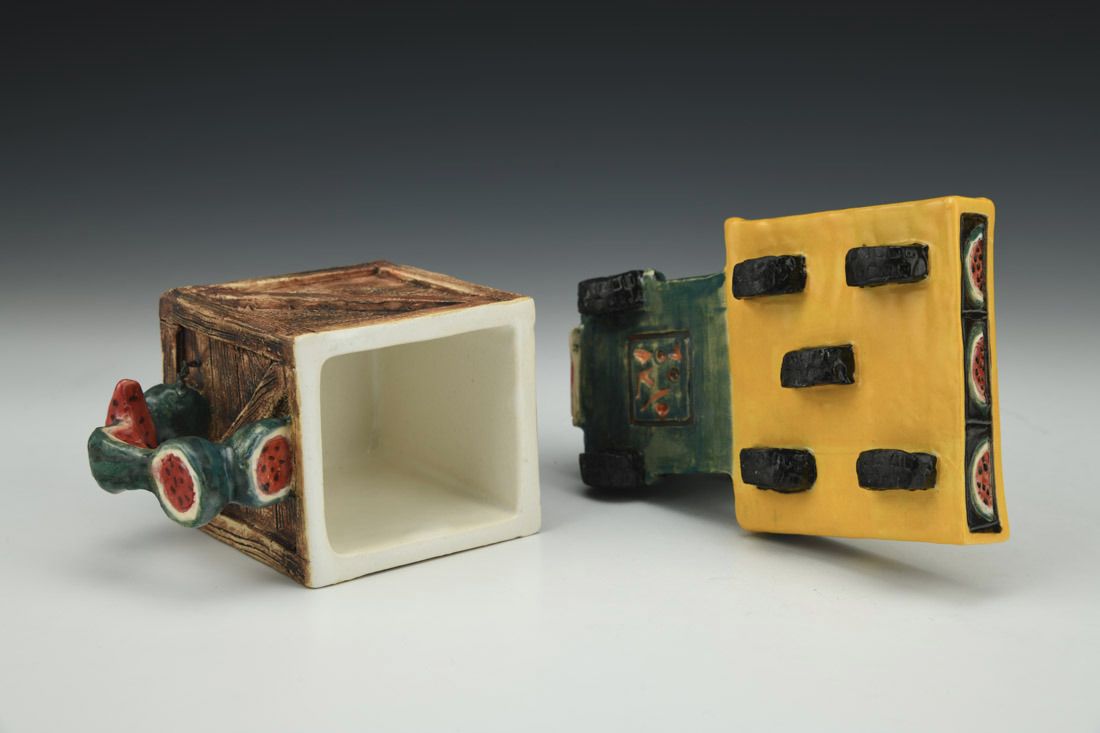 White stoneware with Liquid Quartz and wire, hand built, underglaze, glaze, cone 5 electric fired with multiple firings, 4 x 5.25 x 4.25 inches.