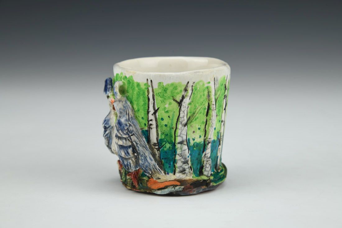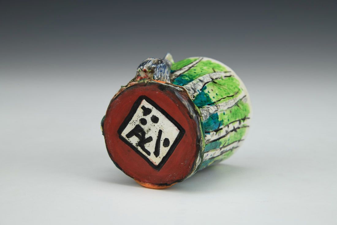 White stoneware with Liquid Quartz, hand built, underglaze, glaze, cone 5 electric fired with multiple firings, 2.25 x 2.25 x 2.5 inches.