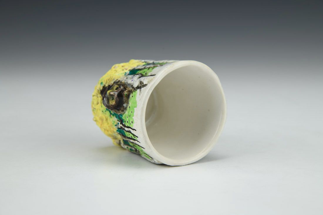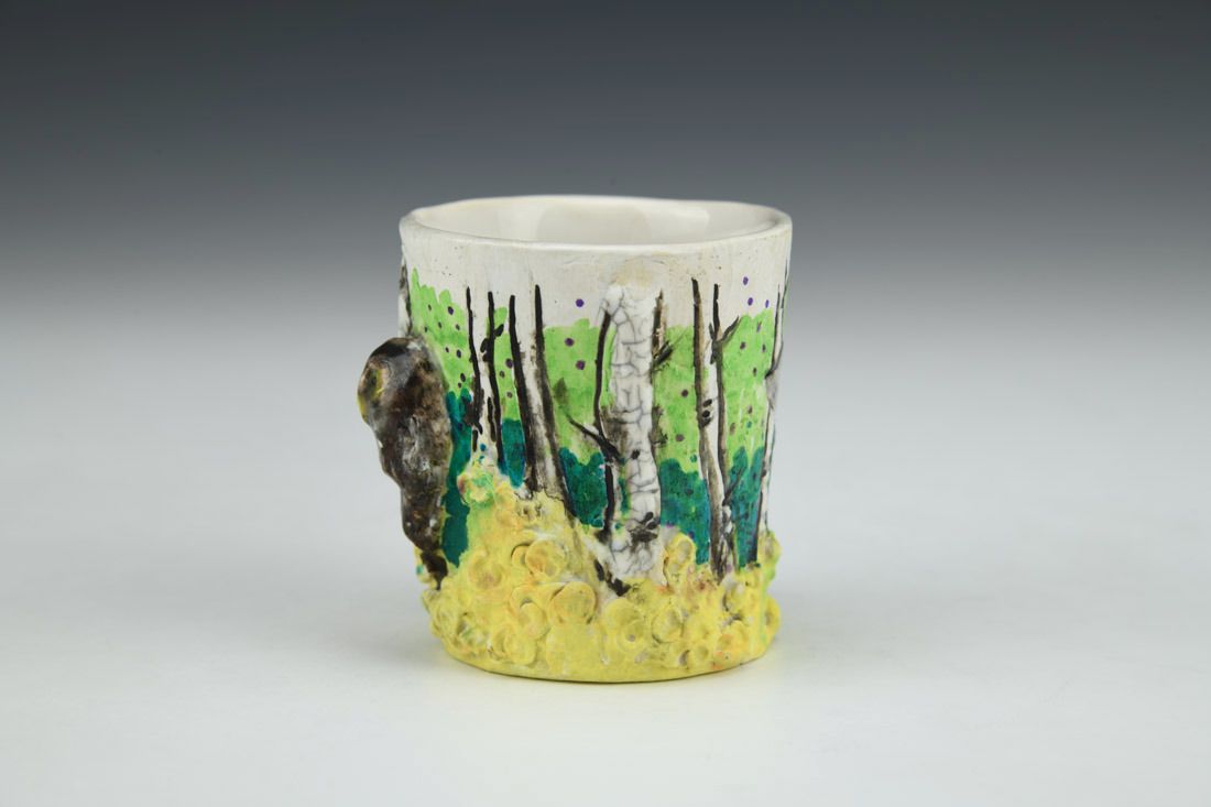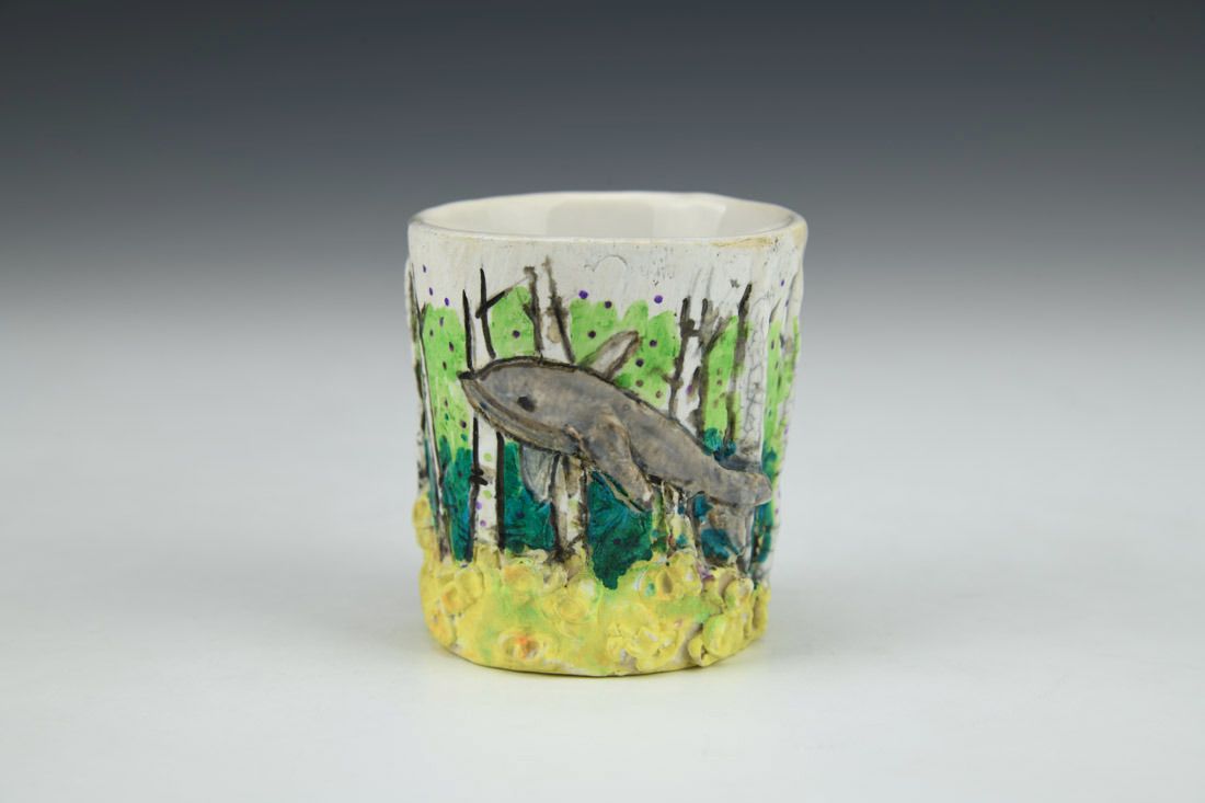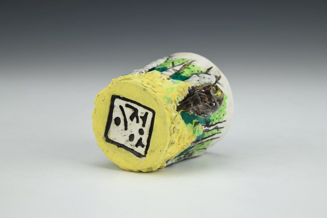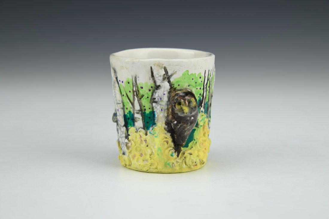 White stoneware with Liquid Quartz, hand built, underglaze, glaze, cone 5 electric fired with multiple firings, 2.25 x 2.25 x 2.5 inches.