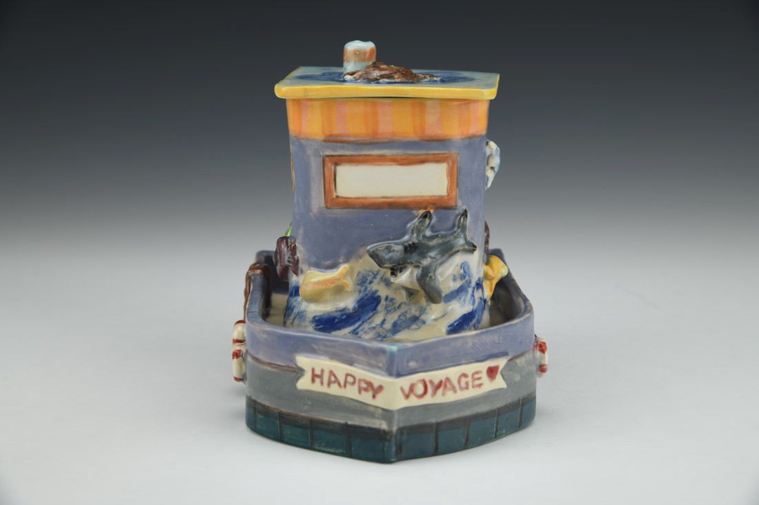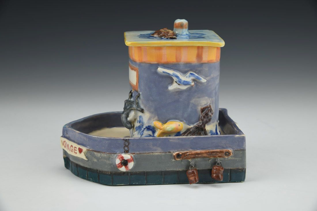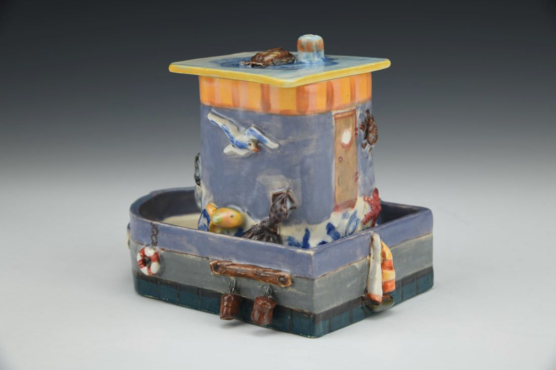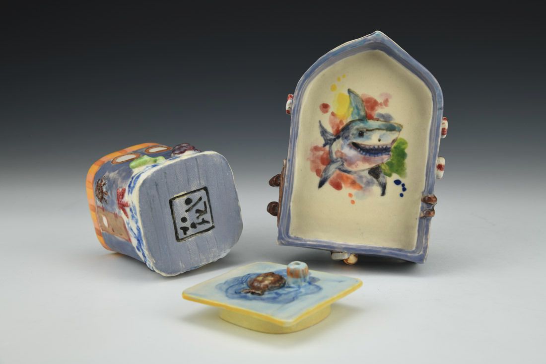 White stoneware with wire, hand built, underglaze, glaze, cone 5 electric fired with multiple firings, 4.5 x 5.75 x 4 inches.