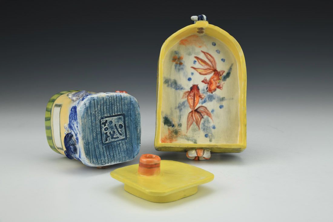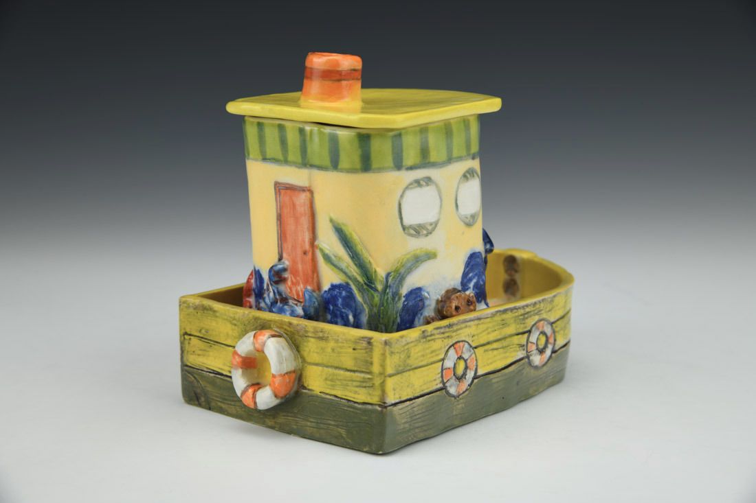 White stoneware, hand built, underglaze, glaze, cone 5 electric fired with multiple firings, 4.5 x 5.75 x 3.5 inches.