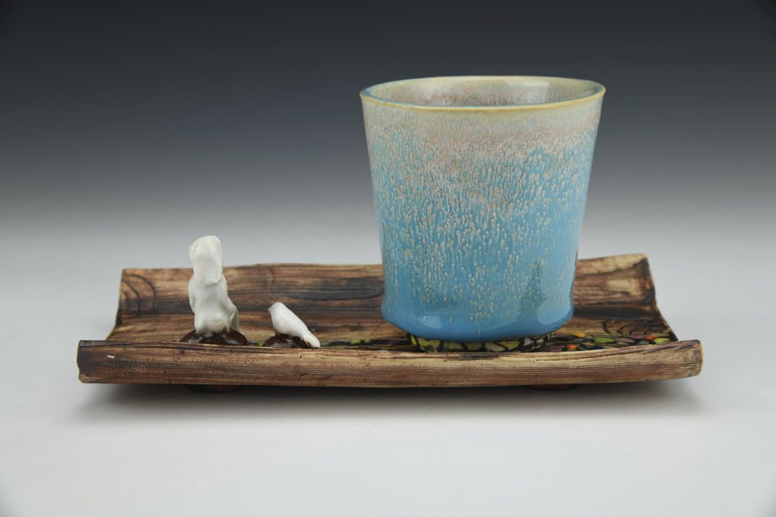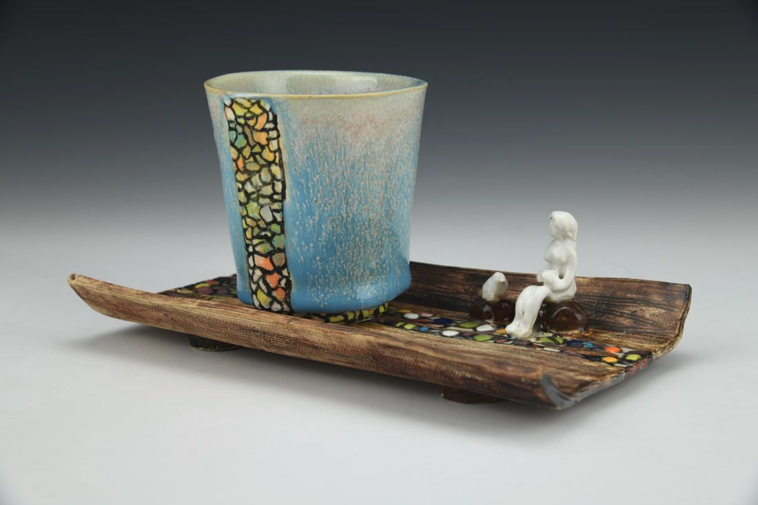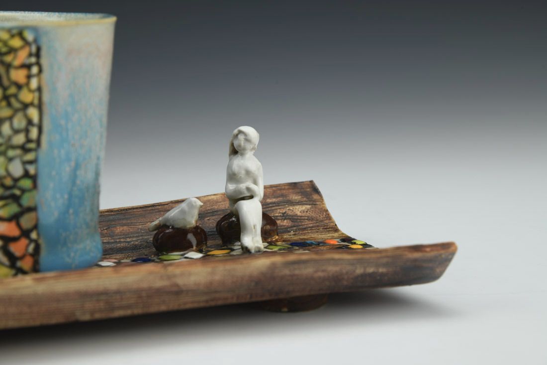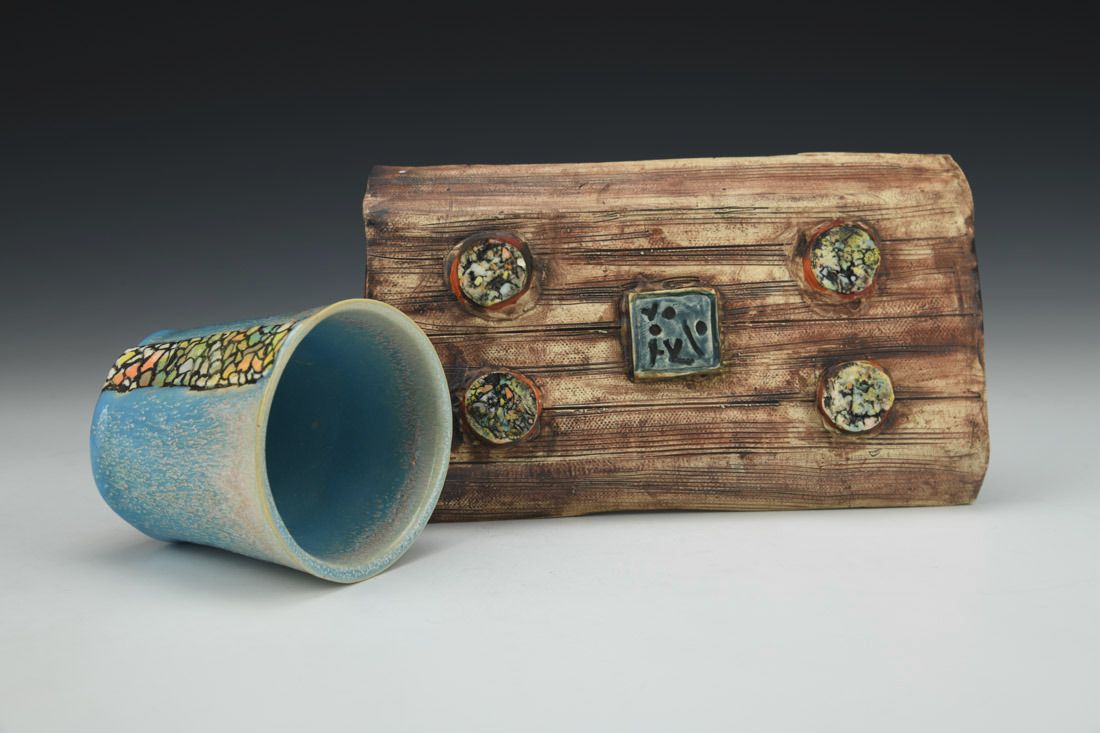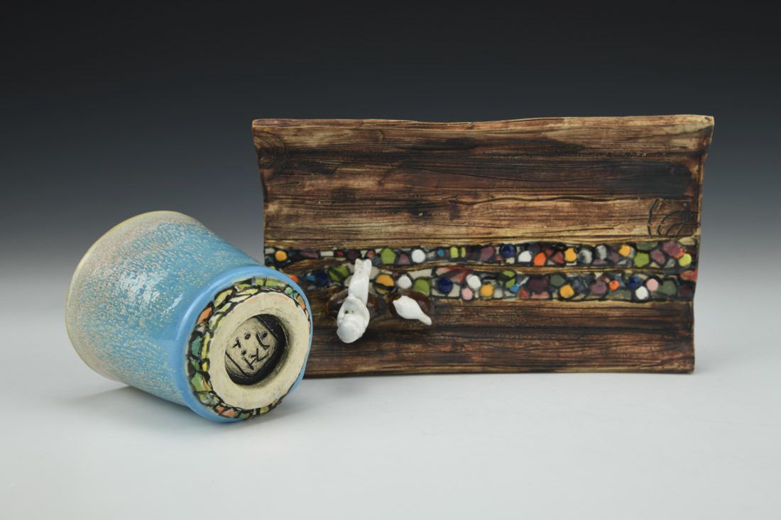 White stoneware with Liquid Quartz, hand built, underglaze, glaze, cone 5 electric fired with multiple firings, 4 x 7.75 x 4.75 inches.