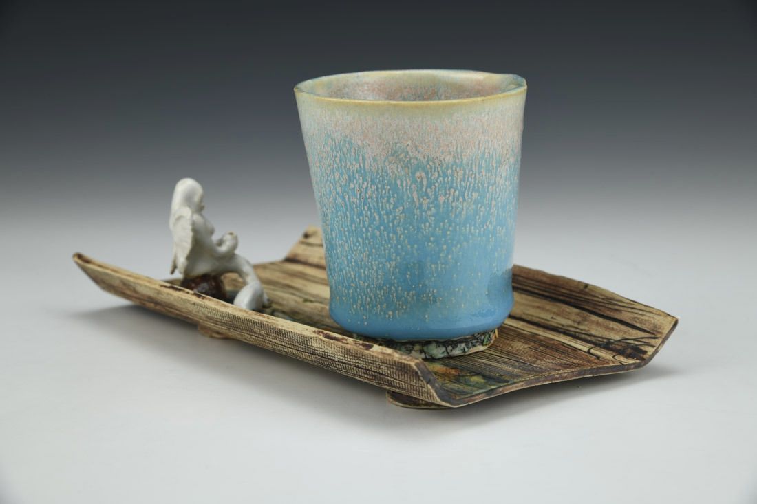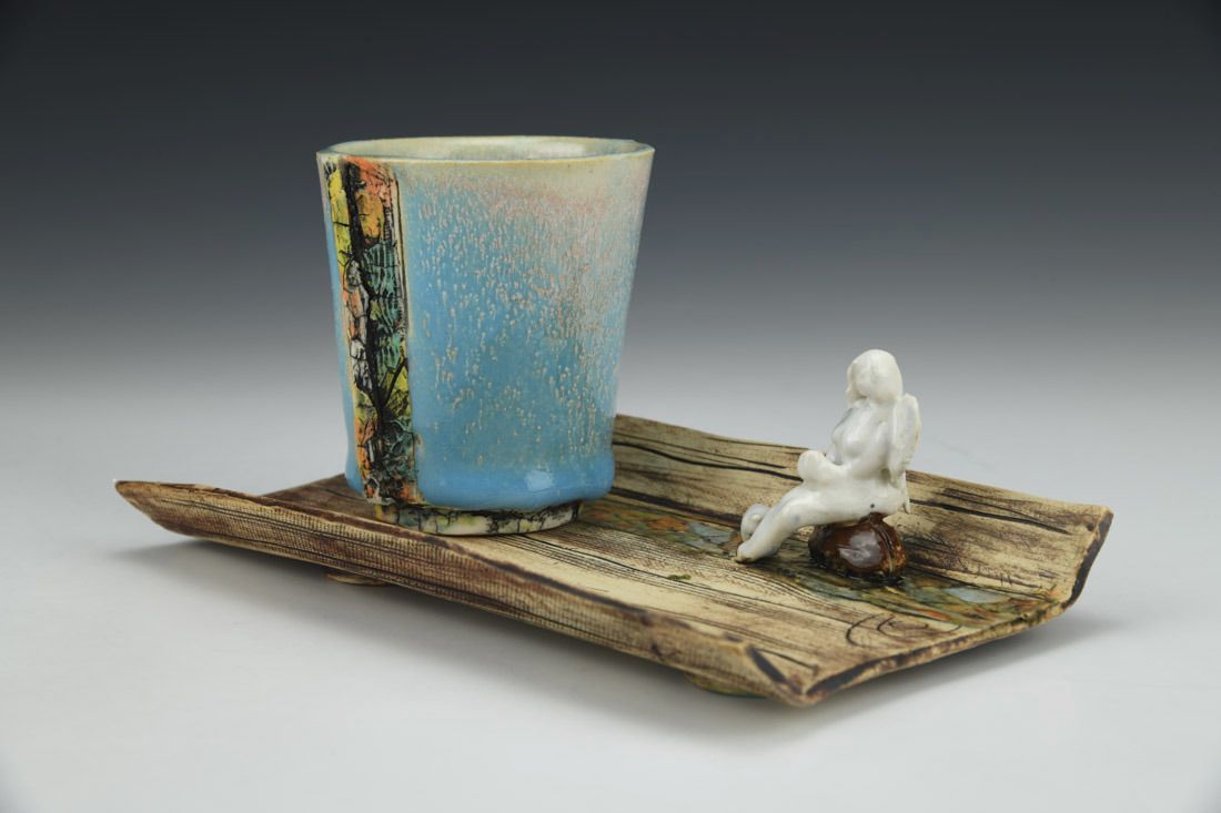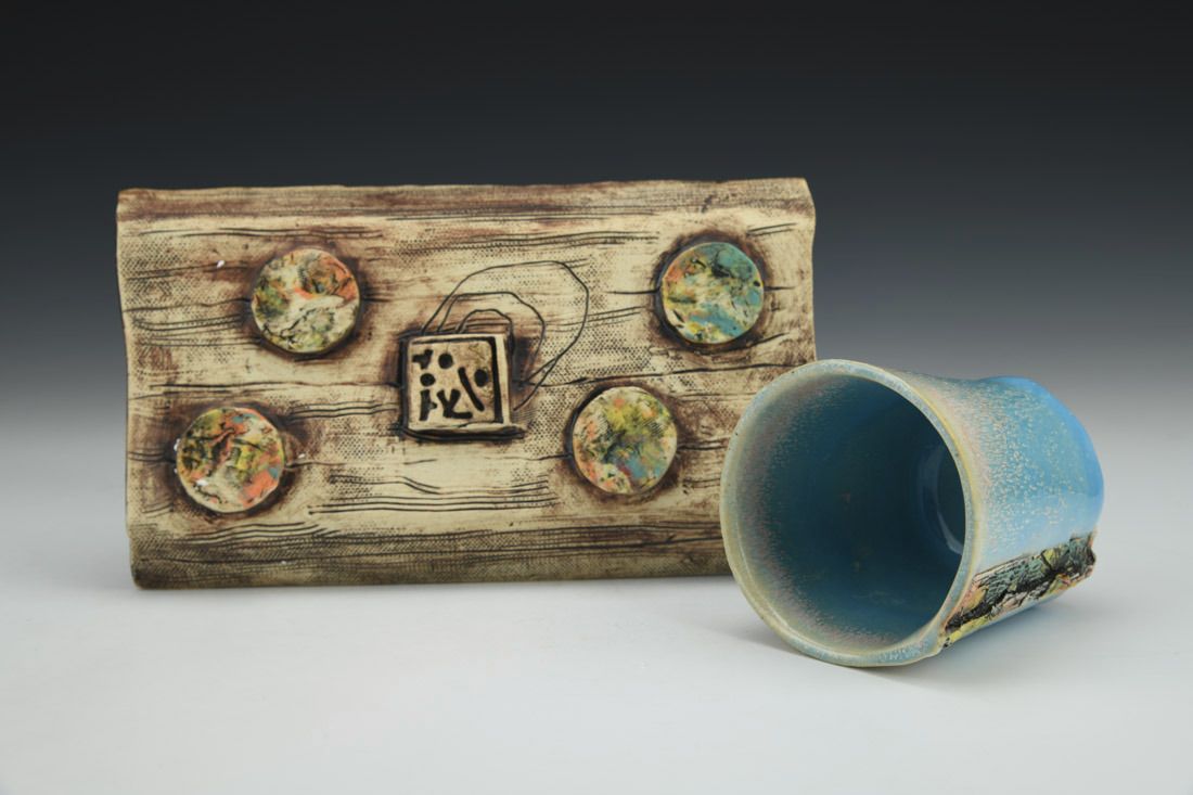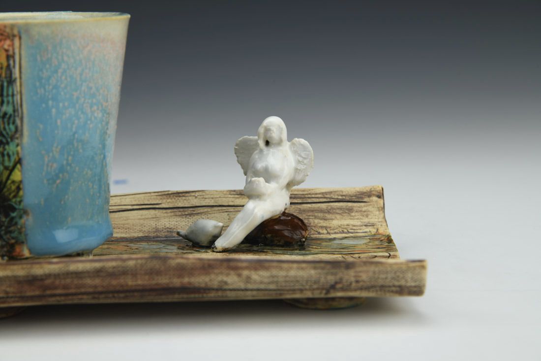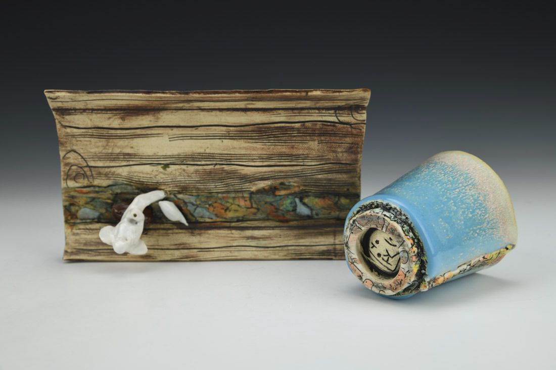 White stoneware with Liquid Quartz, hand built, underglaze, glaze, cone 5 electric fired with multiple firings, 3.75 x 7.5 x 4.5 inches.