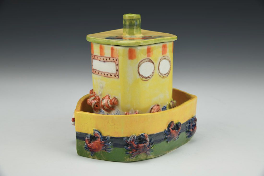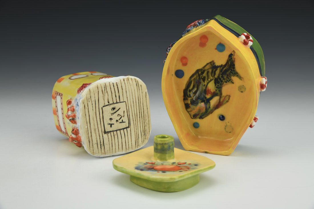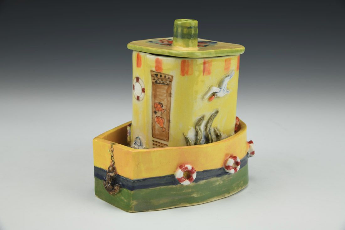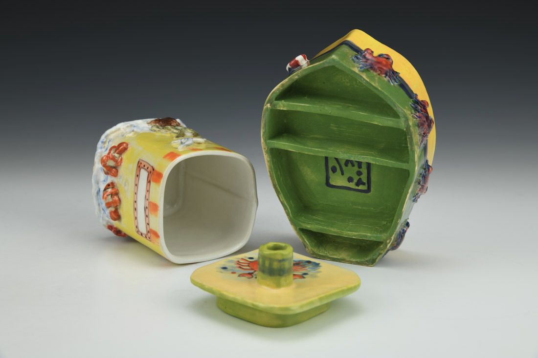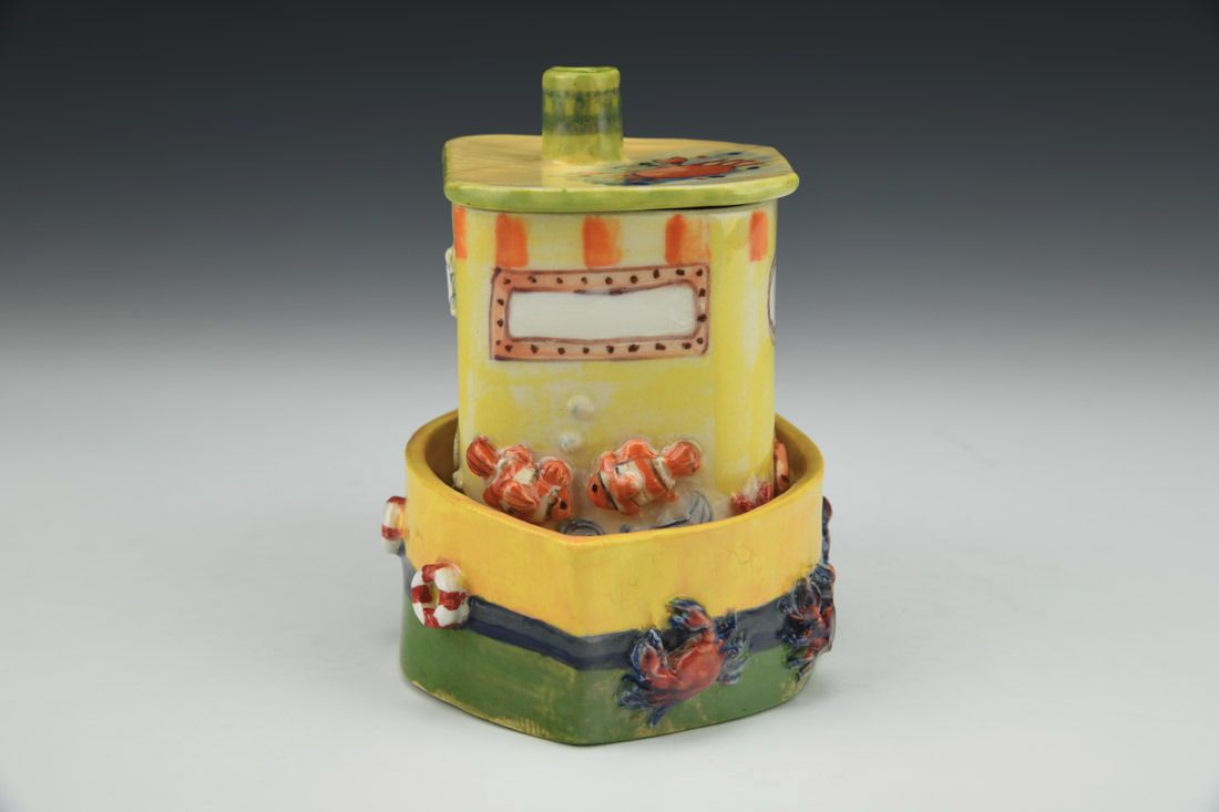 White stoneware, hand built, underglaze, glaze, cone 5 electric fired with multiple firings, 4.75 x 5 x 4 inches.