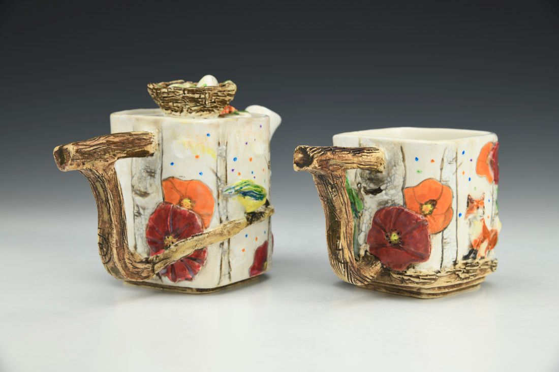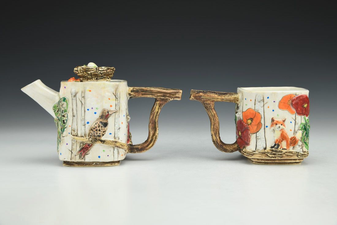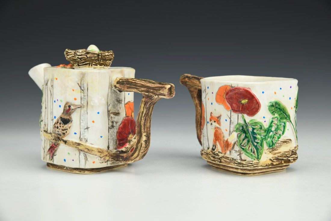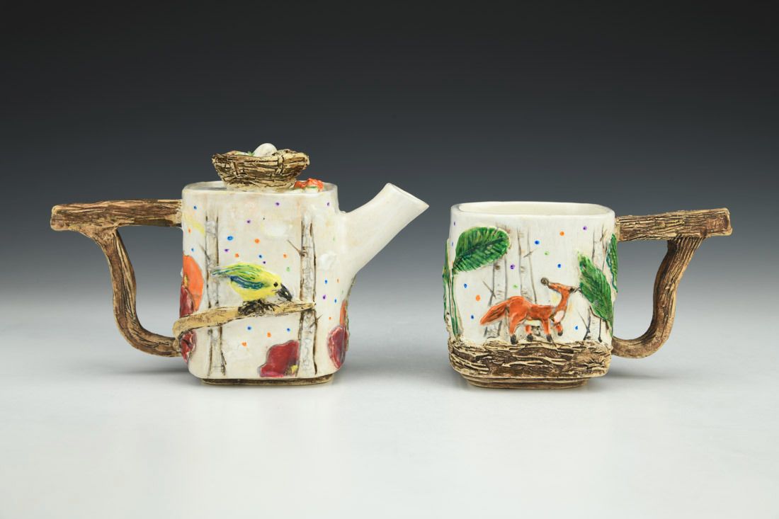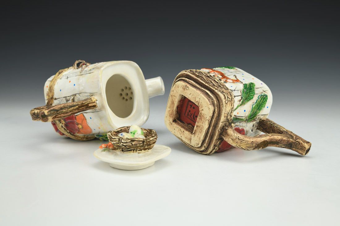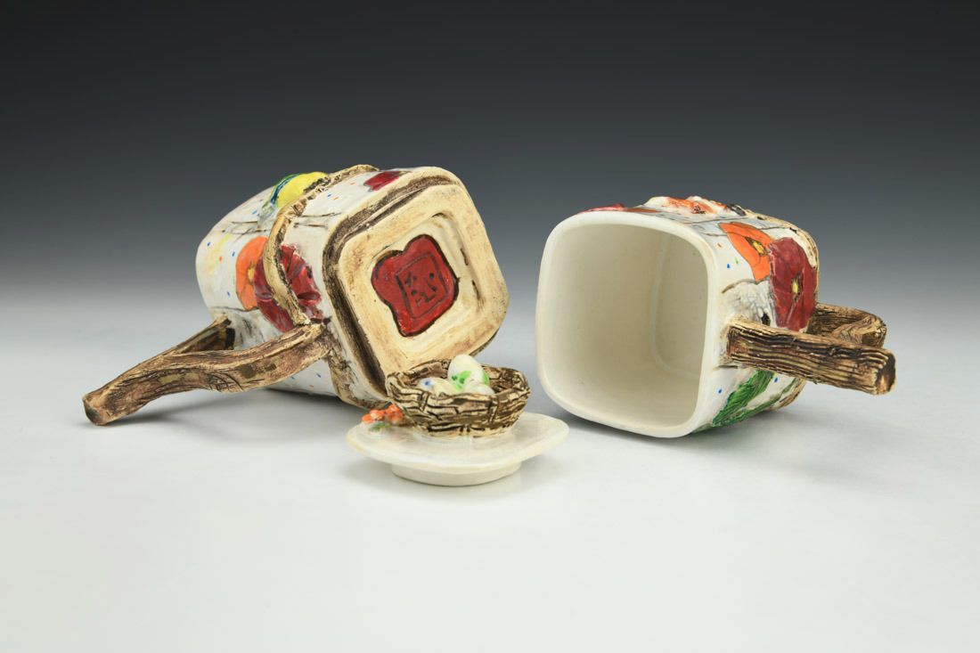 White stoneware, colored porcelain slip, hand built, multiple firings, underglaze, glaze, liquid quartz, 4.5 x 6.75 x 3.5 inches.