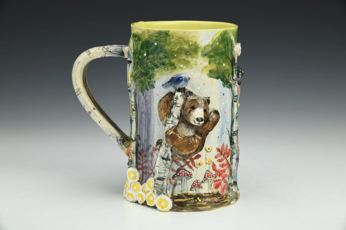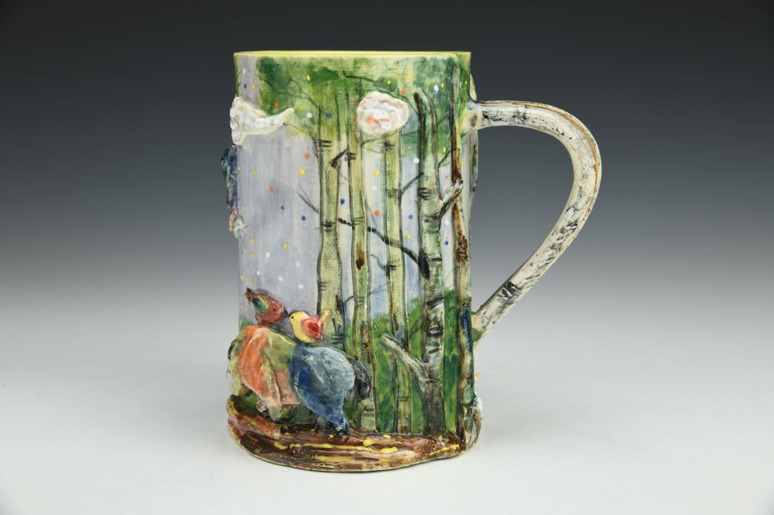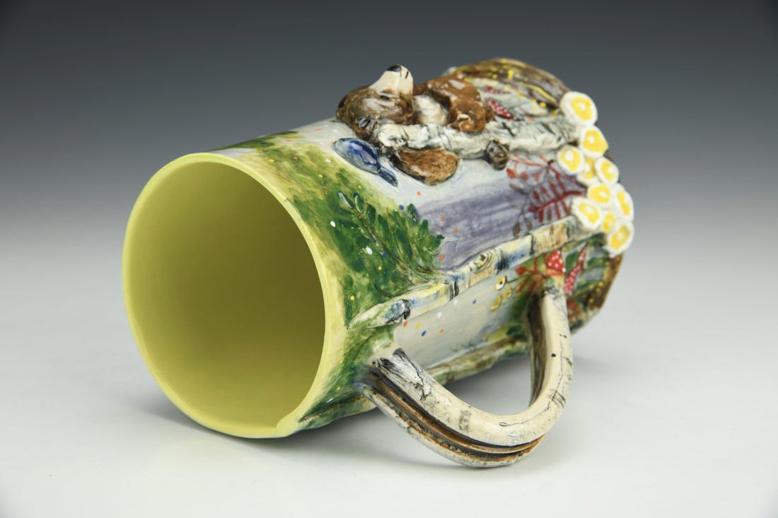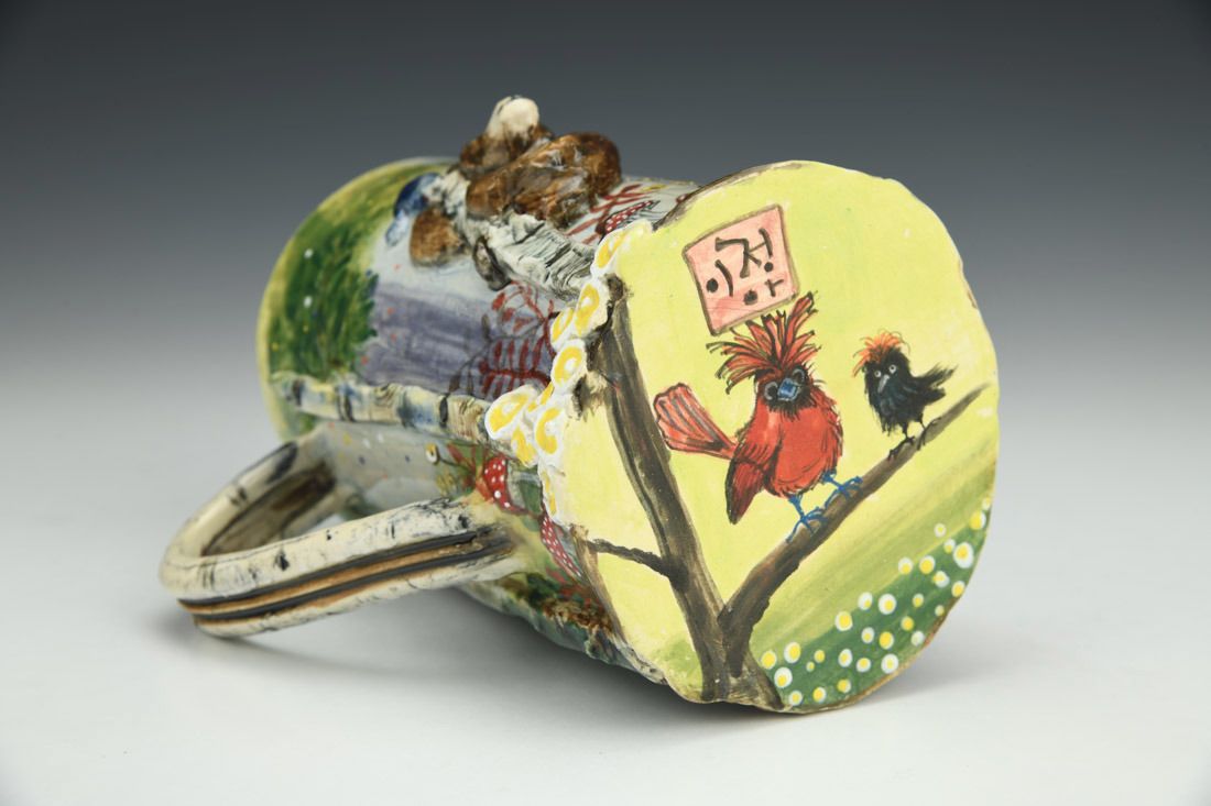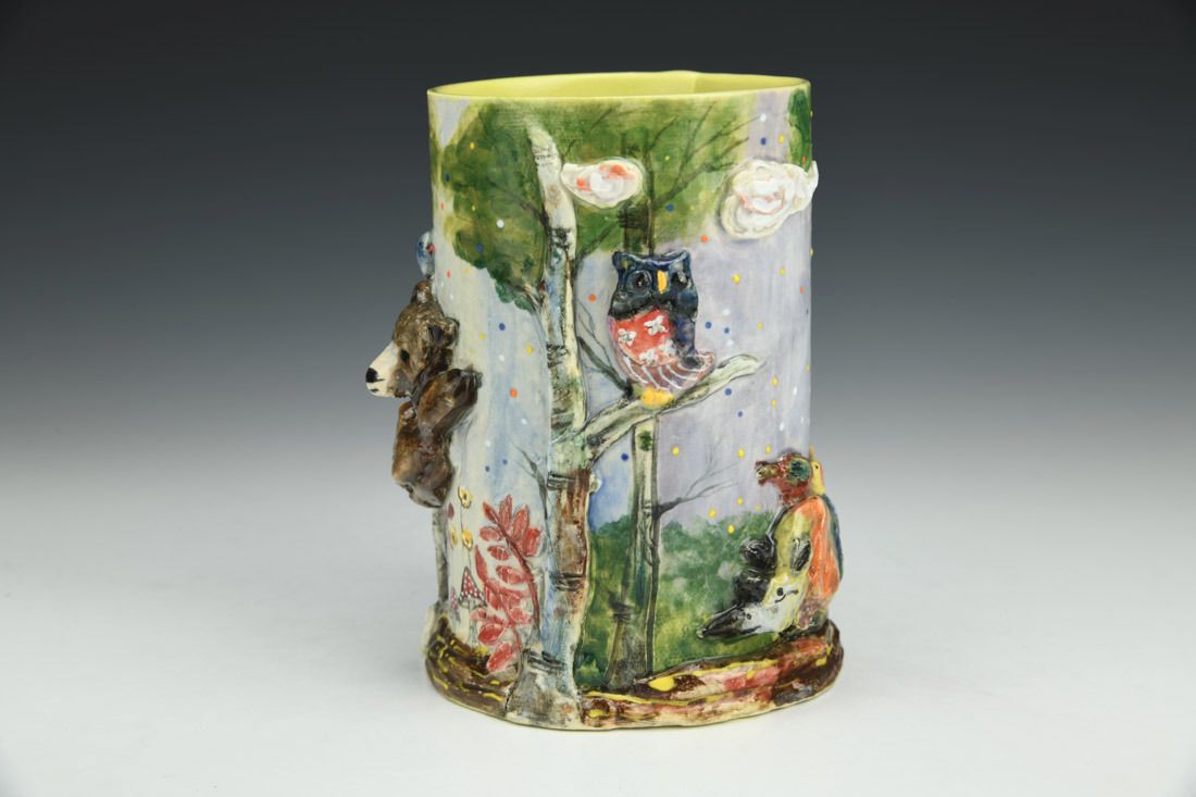 White stoneware, hand built, multiple firings, underglaze, glaze, liquid quartz, 5.5 x 5 x 4.25 inches.