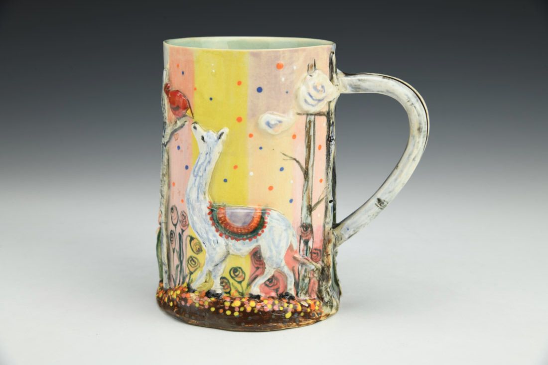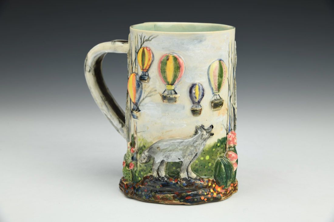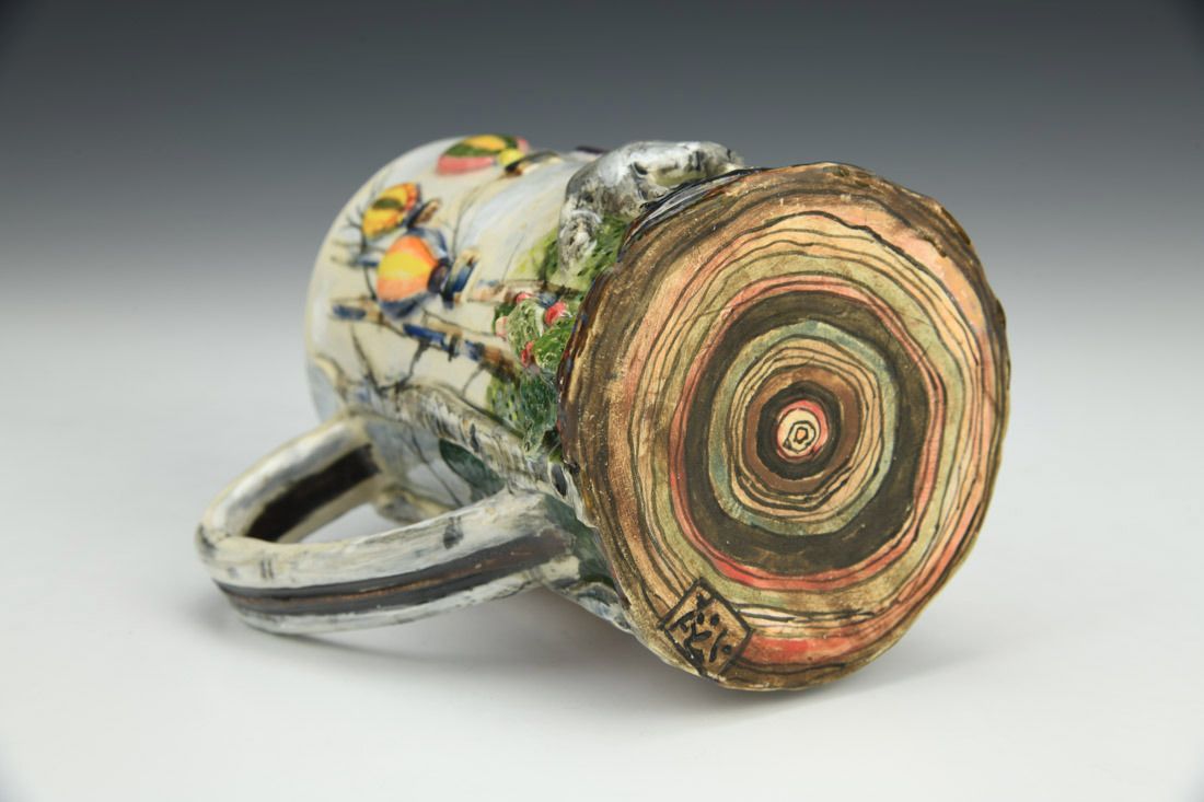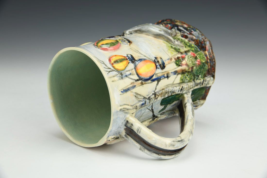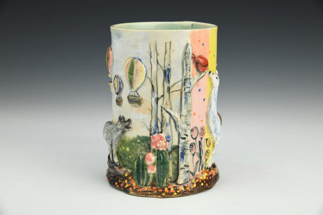 White stoneware, hand built, multiple firings, underglaze, glaze, liquid quartz, 5 x 4.5 x 4 inches.