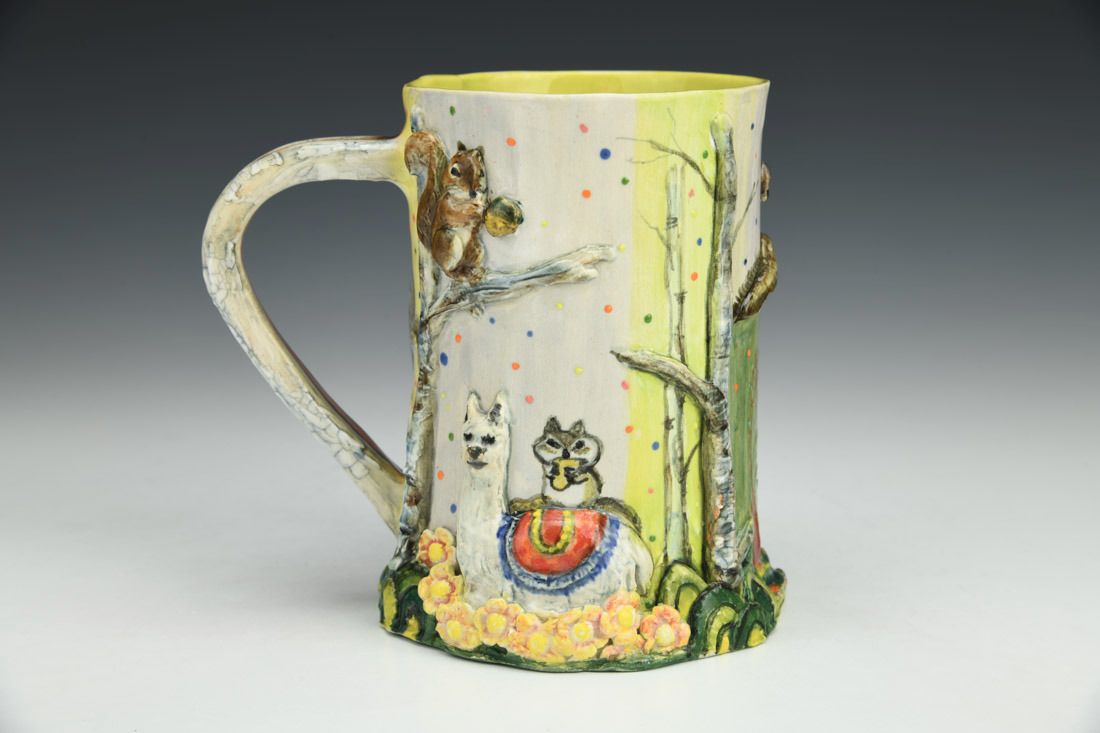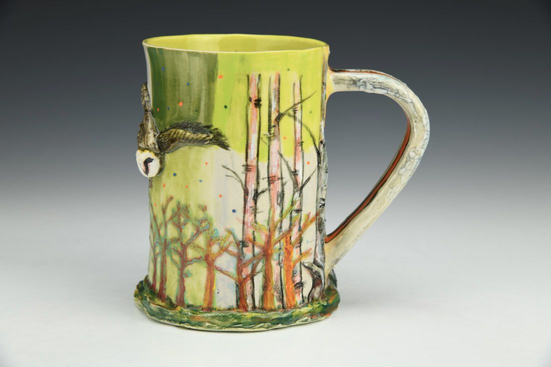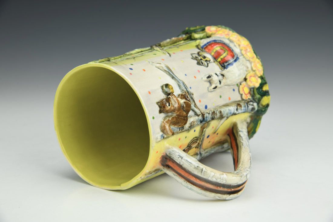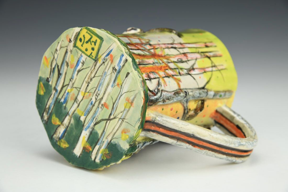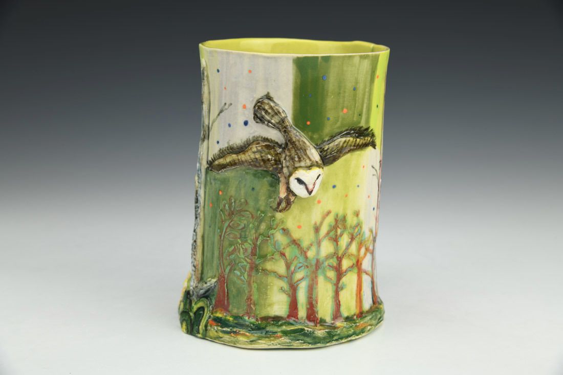 White stoneware, hand built, multiple firings, underglaze, glaze, liquid quartz, 4.75 x 4.75 x 3.75 inches.