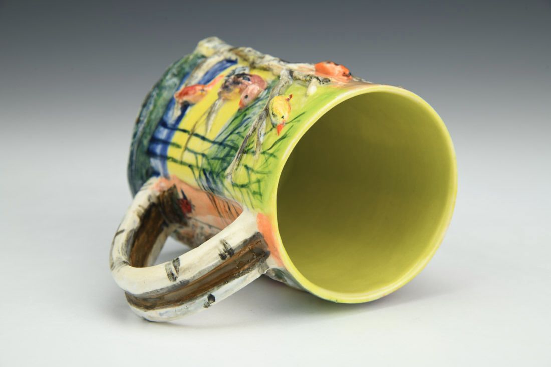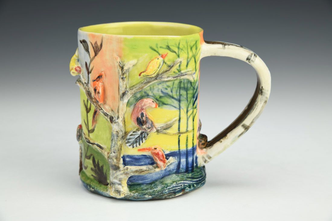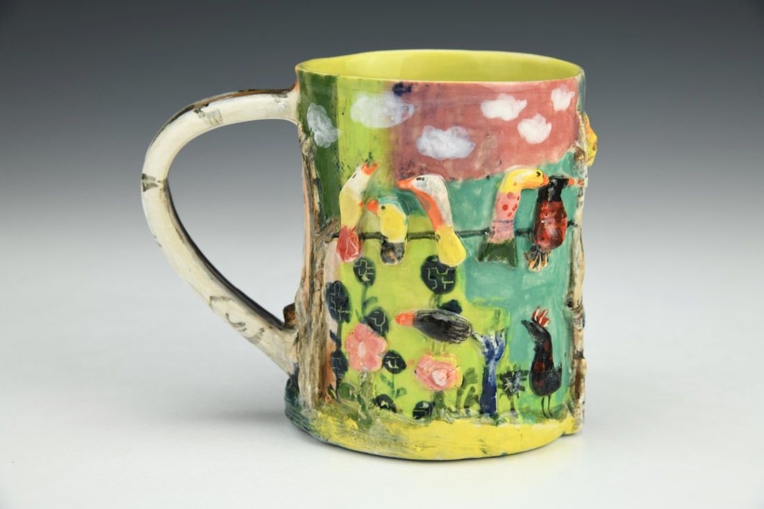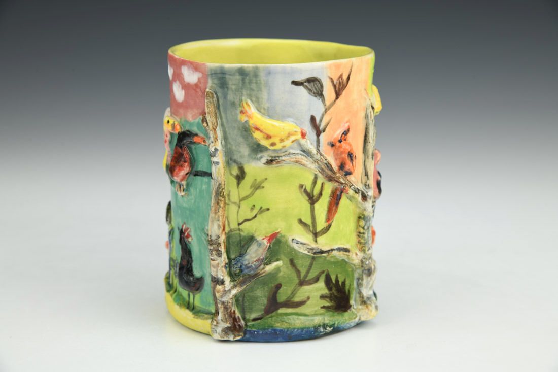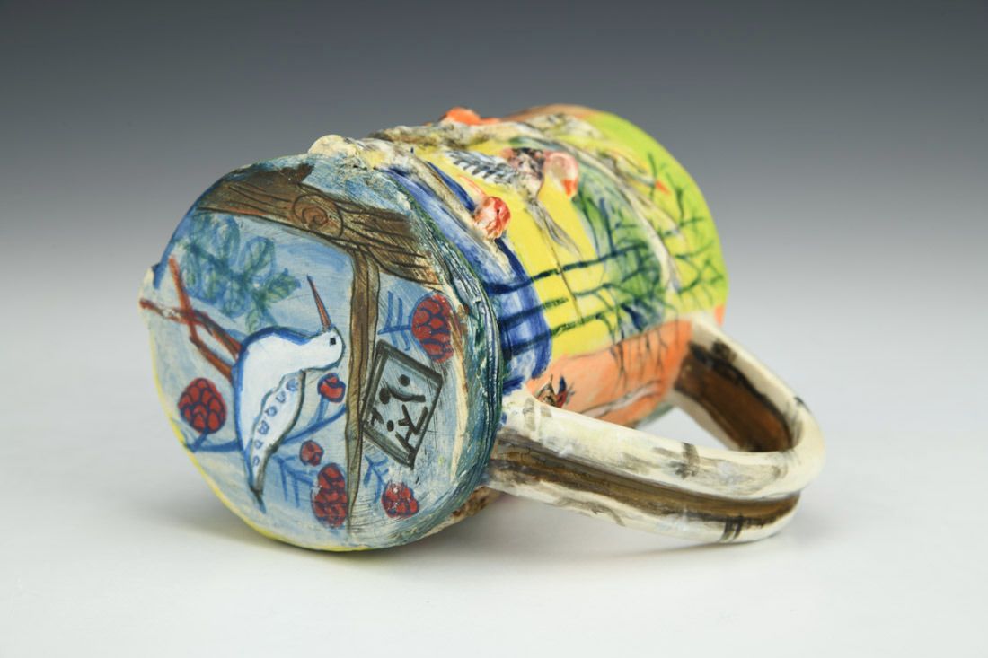 White stoneware, hand built, multiple firings, underglaze, glaze, liquid quartz, 3.75 x 4.75 x 3.25 inches.