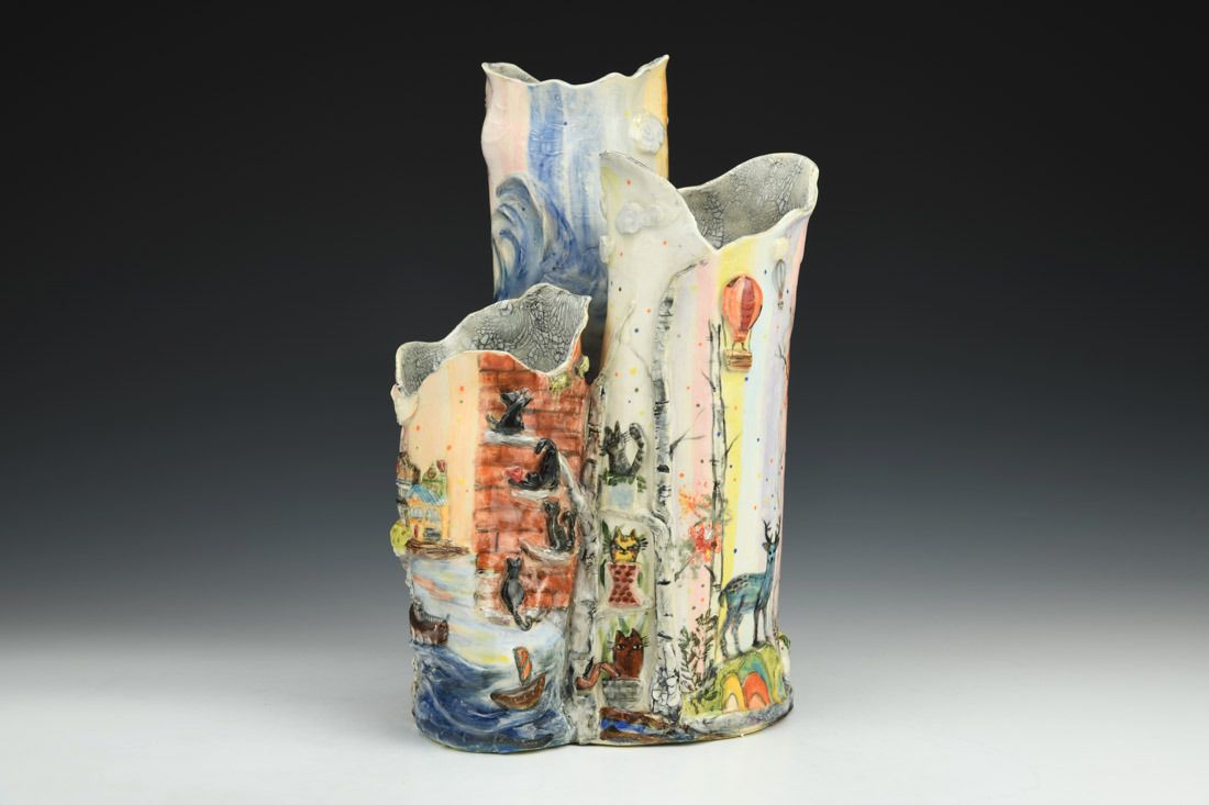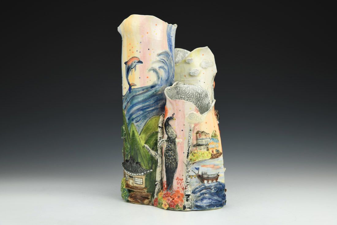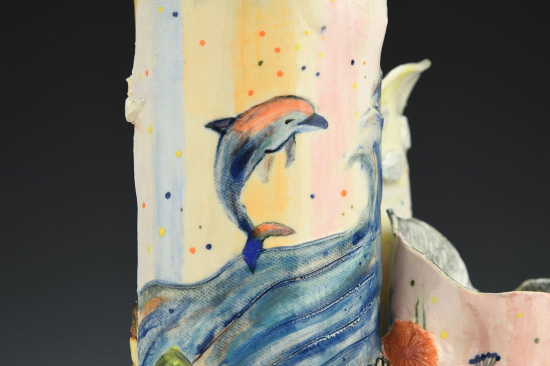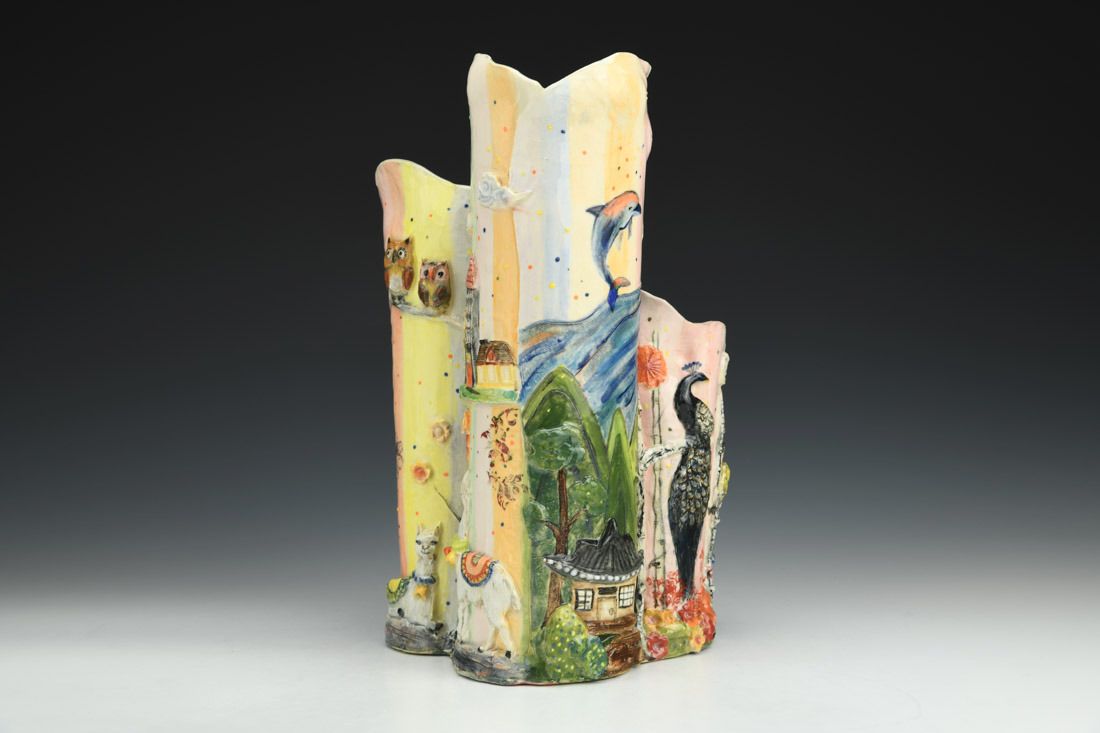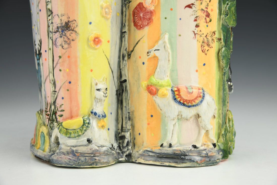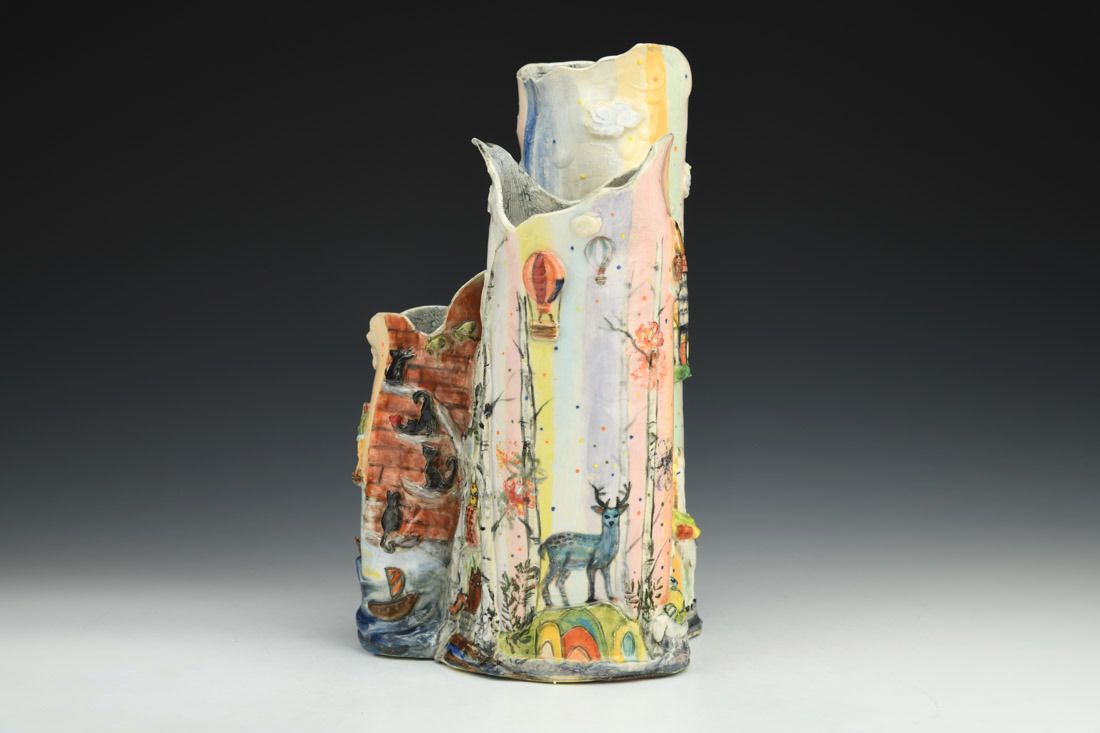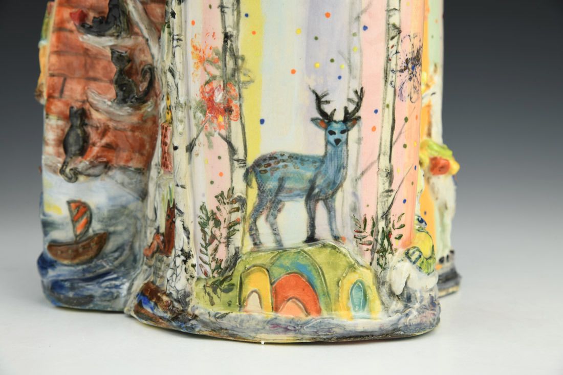 White stoneware, hand built, multiple firings, underglaze, glaze, porcelain slip, liquid quartz, 12 x 7 x 6.5 inches.