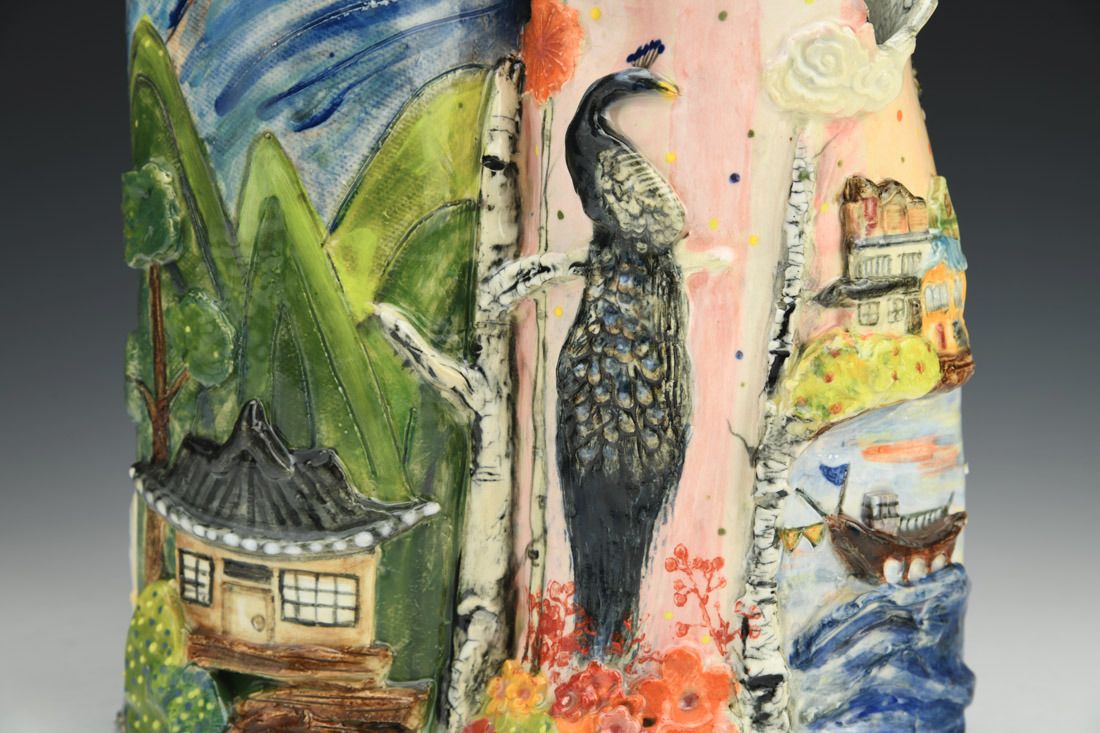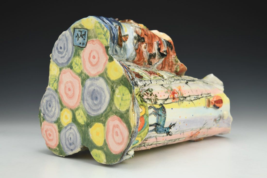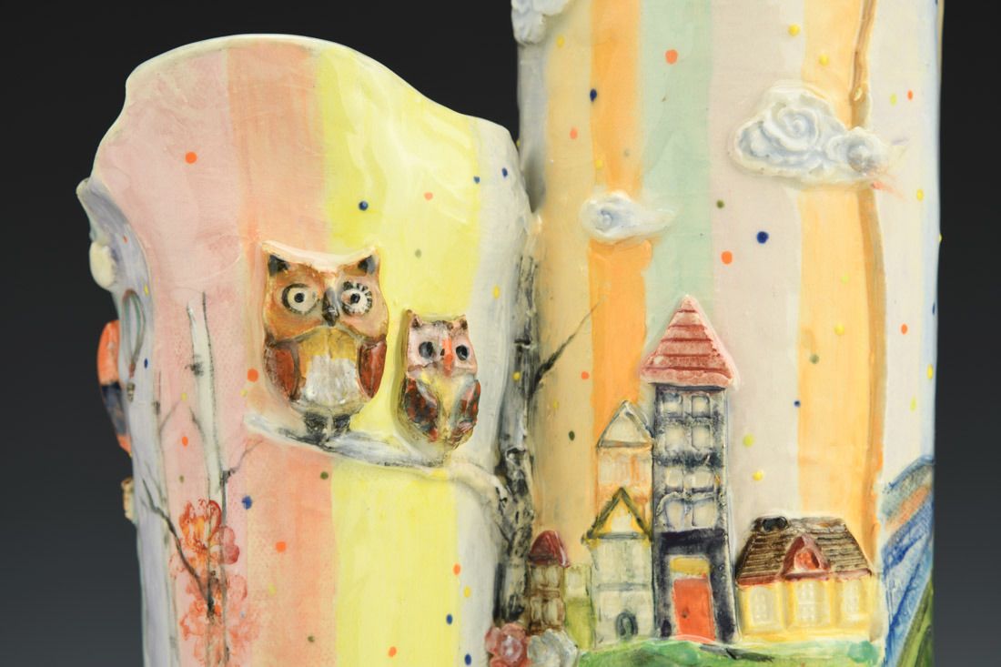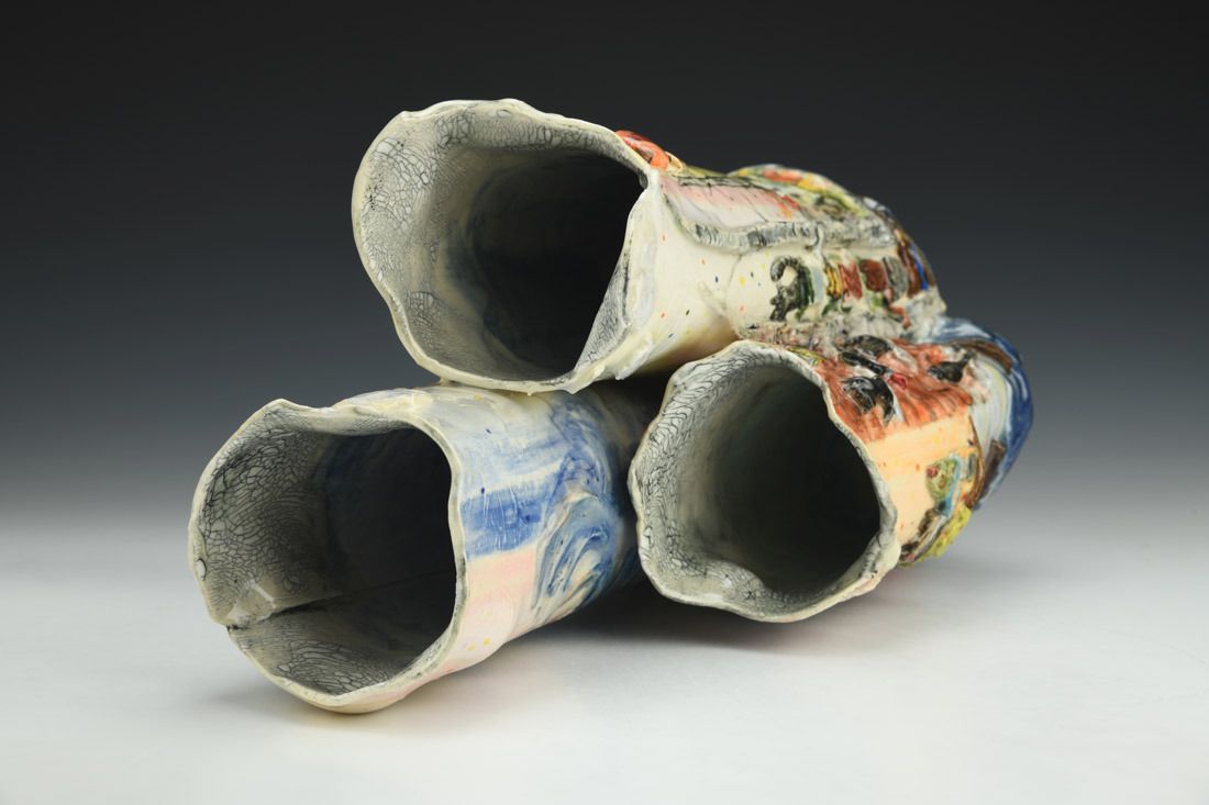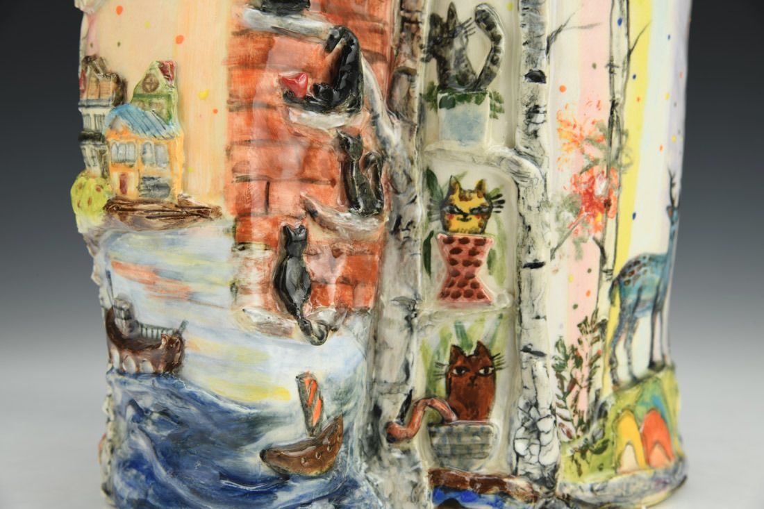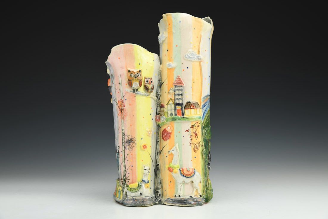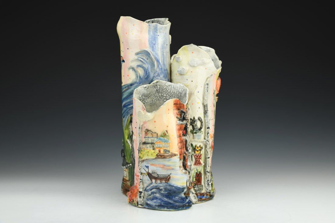 White stoneware, hand built, multiple firings, underglaze, glaze, porcelain slip, liquid quartz, 12 x 7 x 6.5 inches.