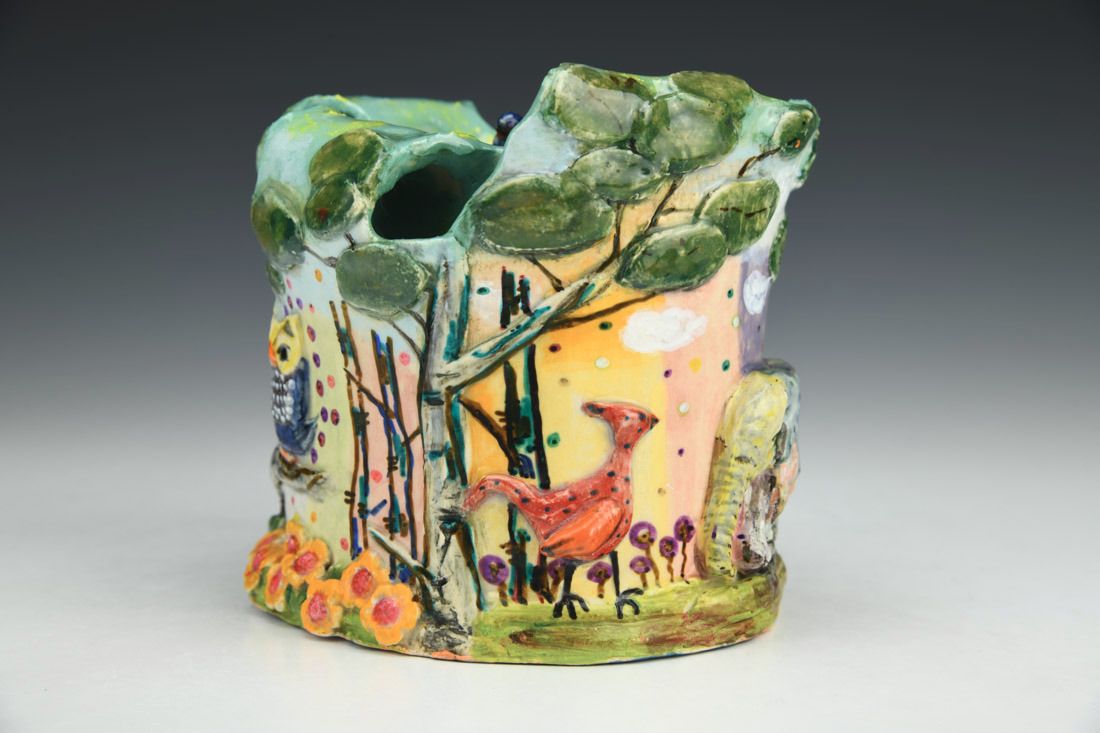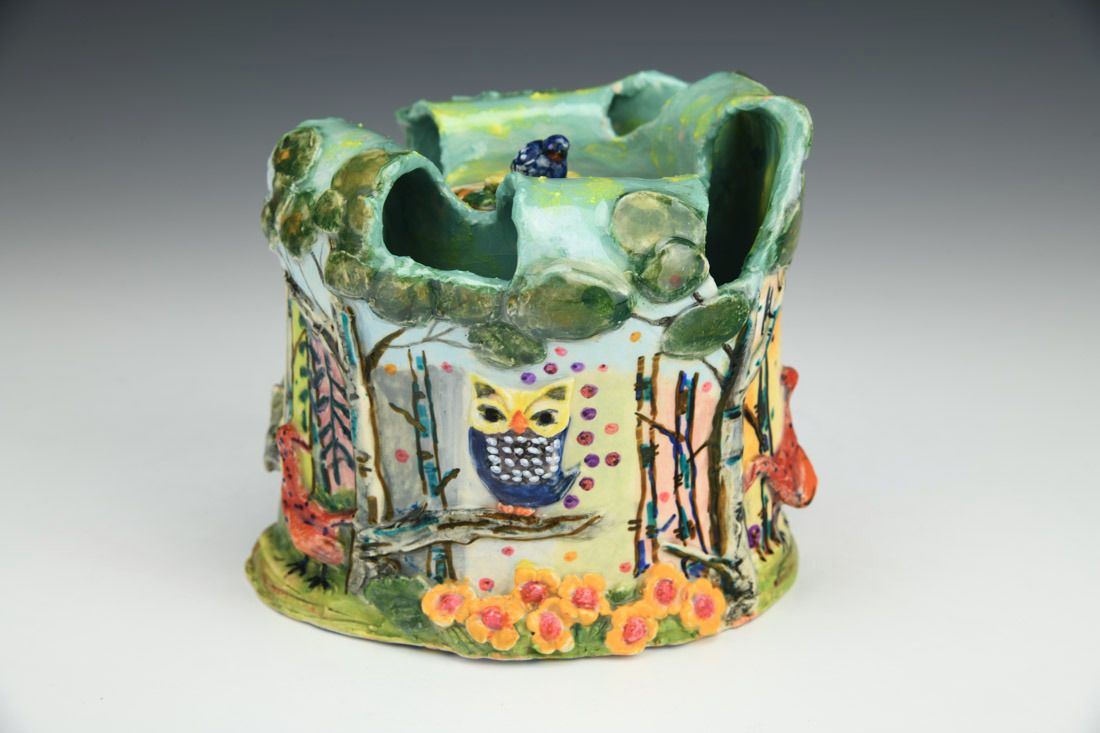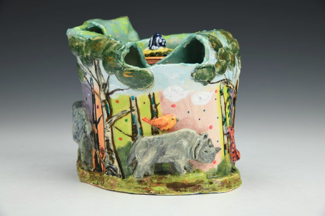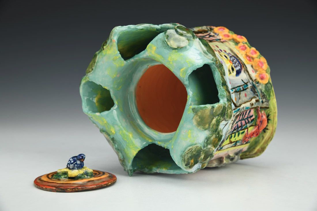 White stoneware, hand built, multiple firings, underglaze, glaze, colored porcelain slip, liquid quartz, 4.5 x 5 x 4.75 inches.