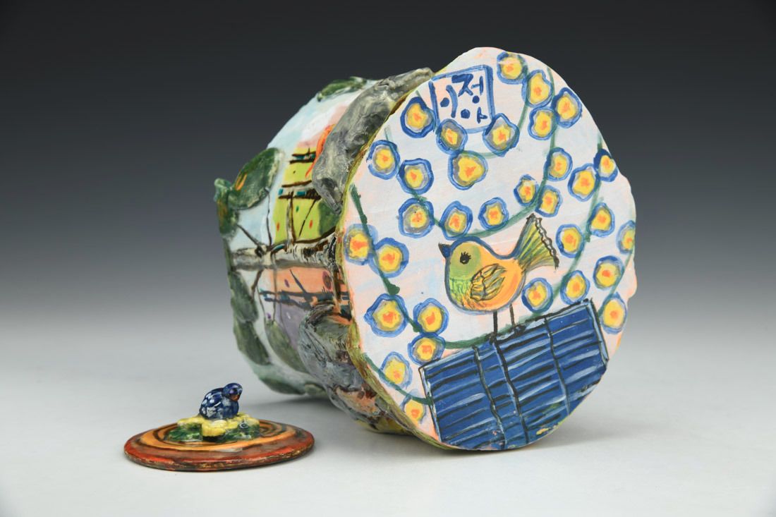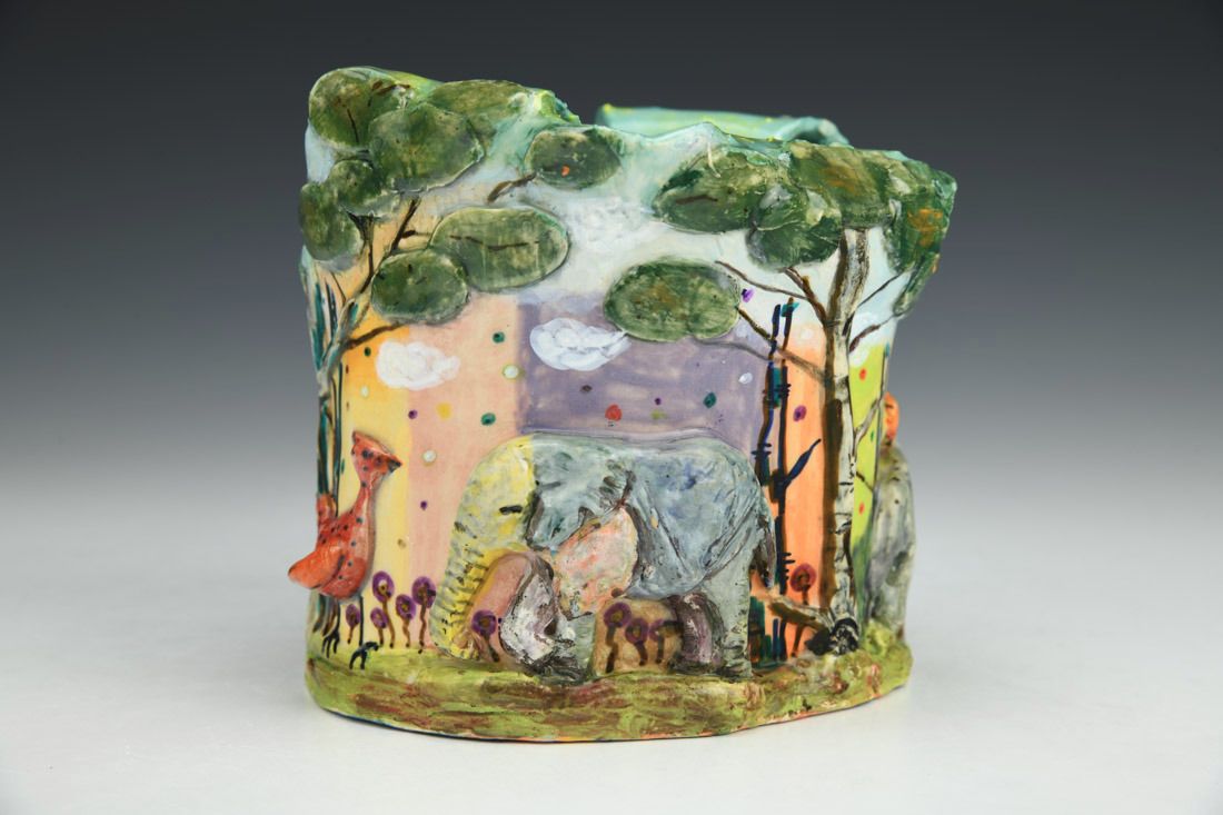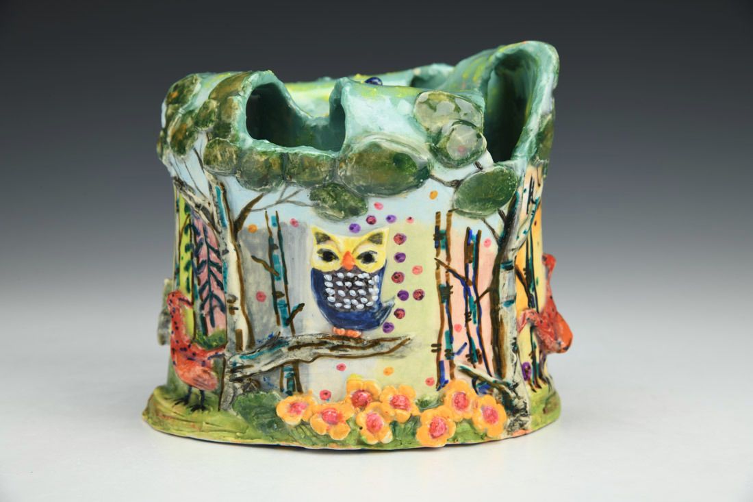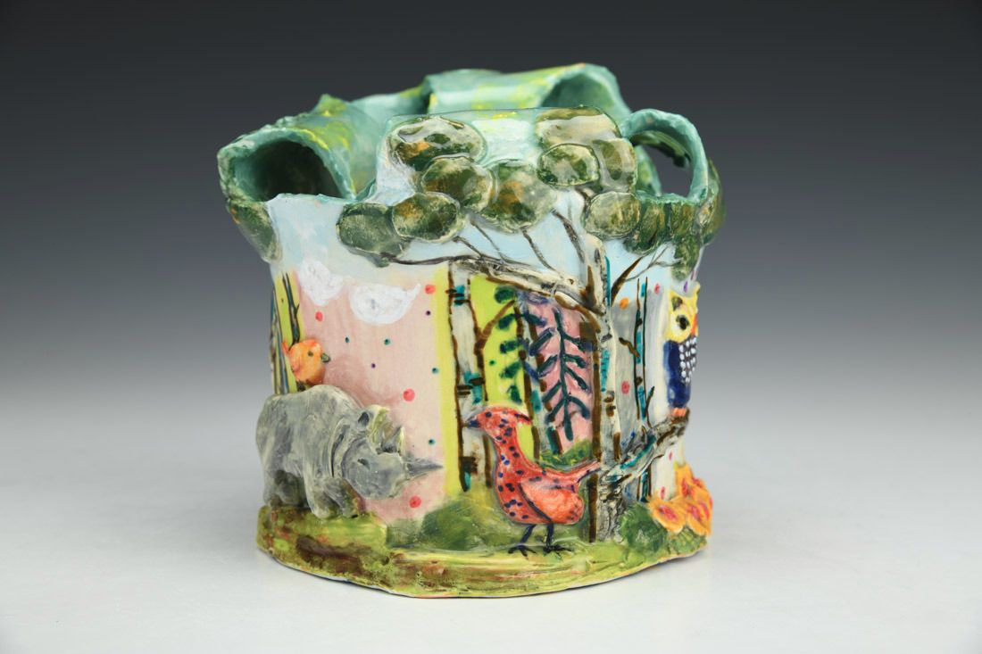 White stoneware, hand built, multiple firings, underglaze, glaze, colored porcelain slip, liquid quartz, 4.5 x 5 x 4.75 inches.