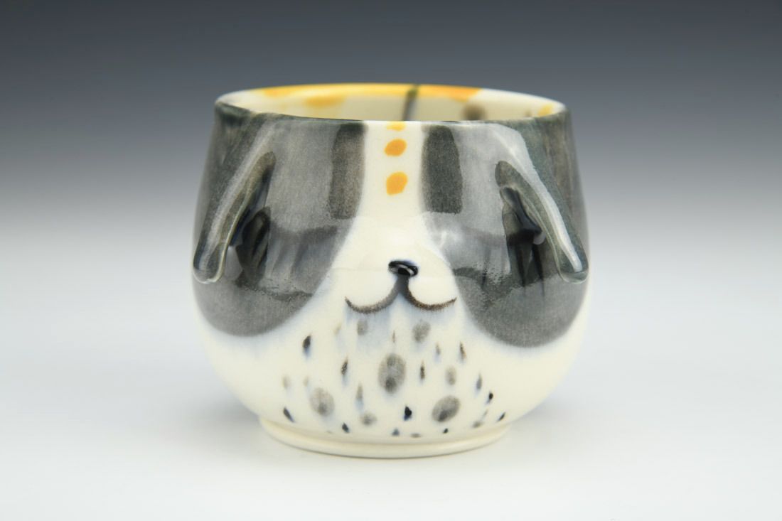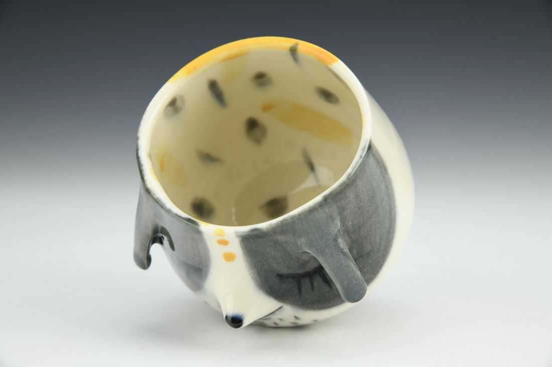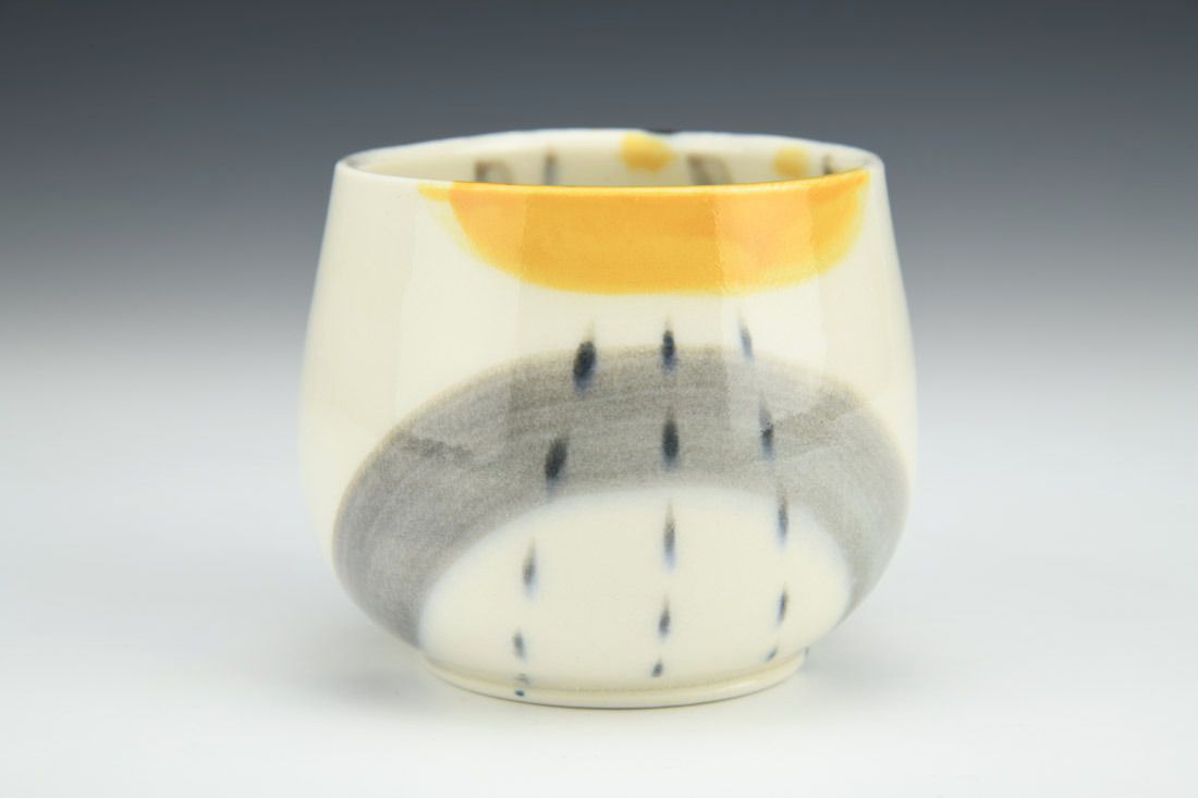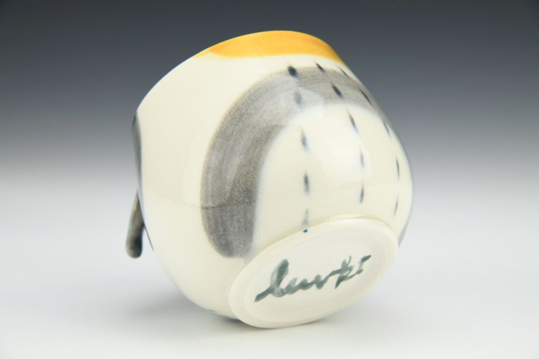 Porcelain, wheel thrown and altered, underglaze, clear glaze, electric fired, 3 x 3.5 x 3.25 inches.