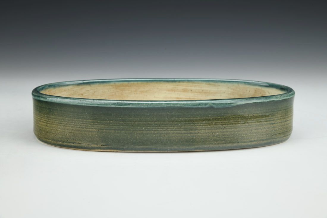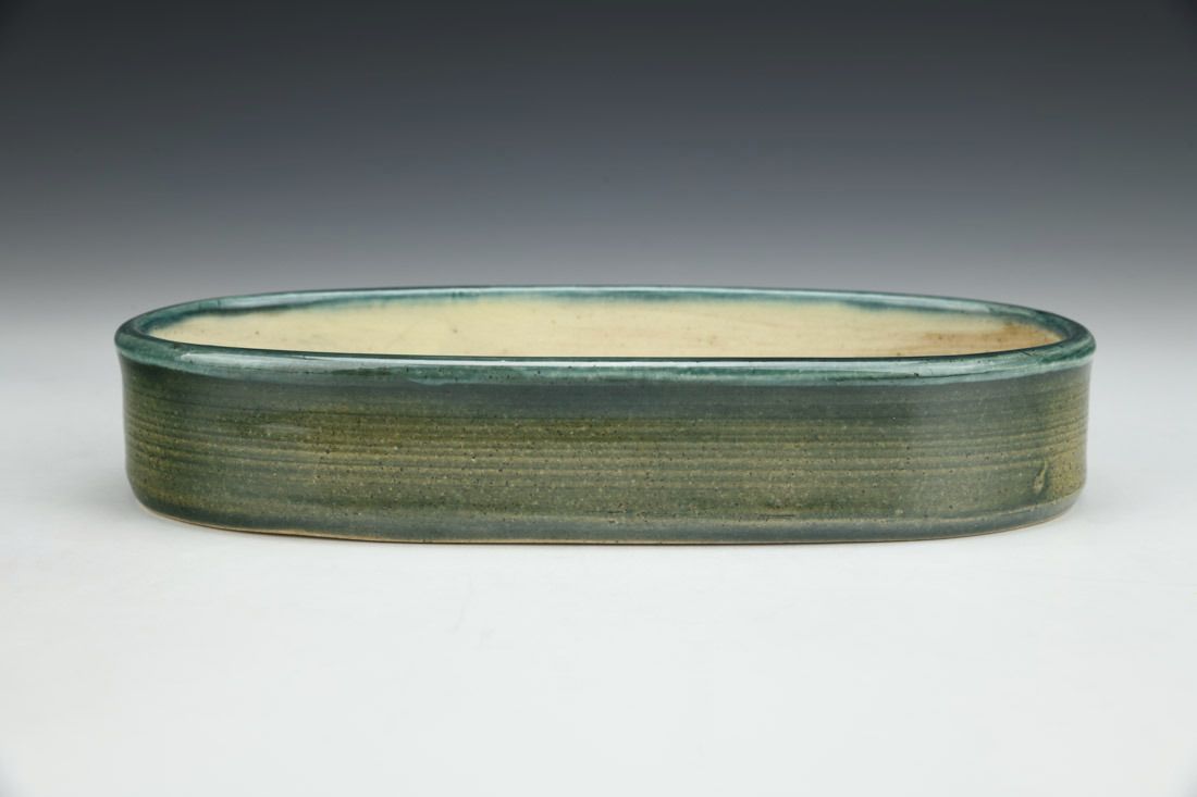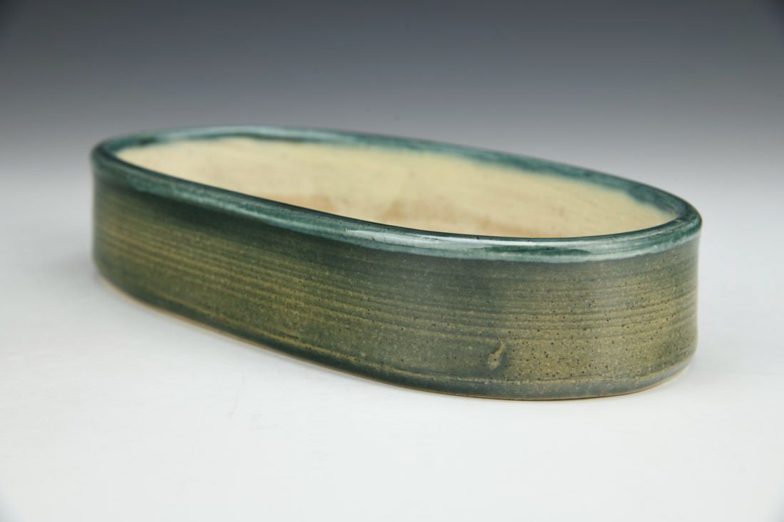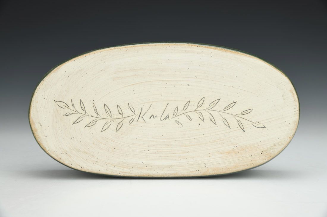Stoneware, wheel thrown and altered, inlaid decoration, white slip, underglaze, glaze, cone 6 electric fired, 1.5 x 8.5 x 4.5 inches.