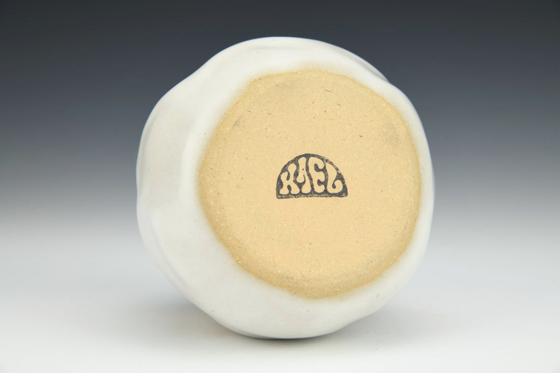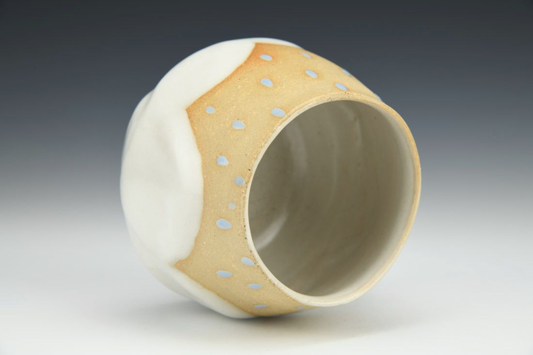 Tan stoneware, wheel thrown and altered, oxidation fired, 3.25 x 4 x 4 inches.