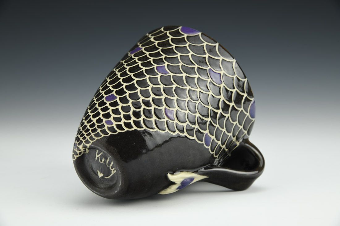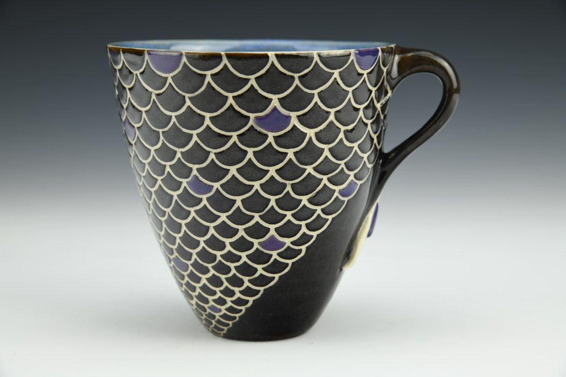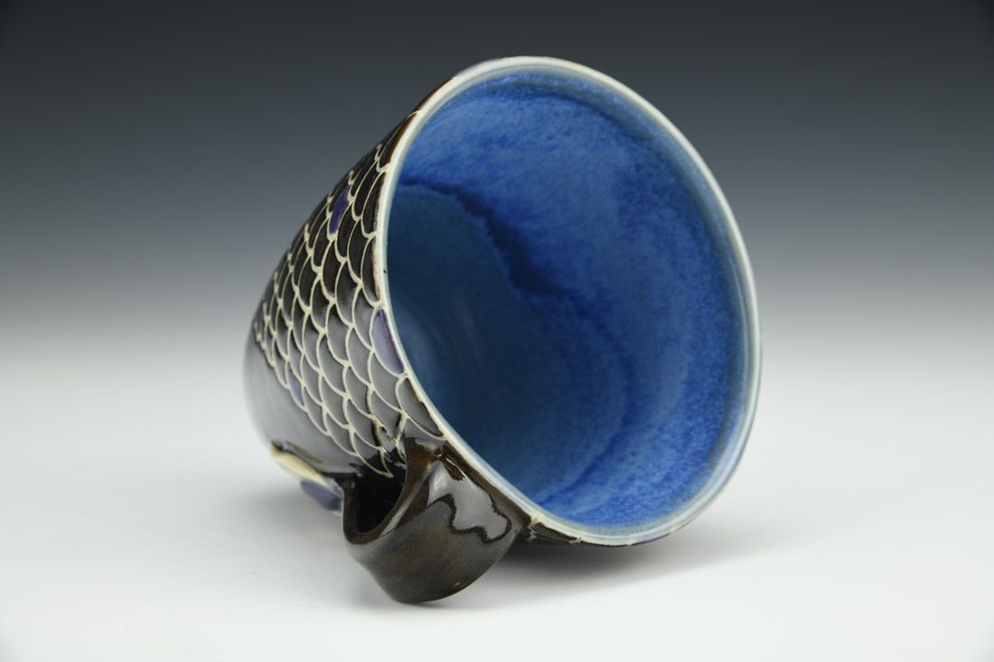 Creamy white stoneware, wheel thrown, sgraffito, black slip, underglazes, carved, clear glaze on exterior, two liner glazes, cone 7 electric fired, 4 x 4.75 x 4 inches.