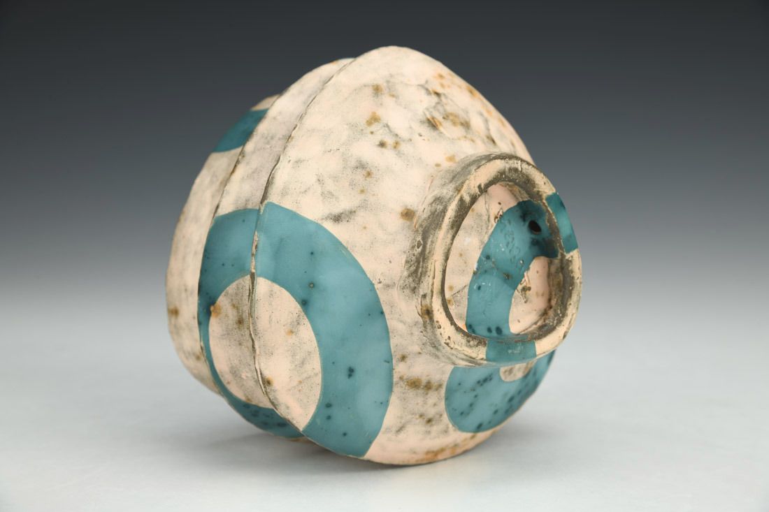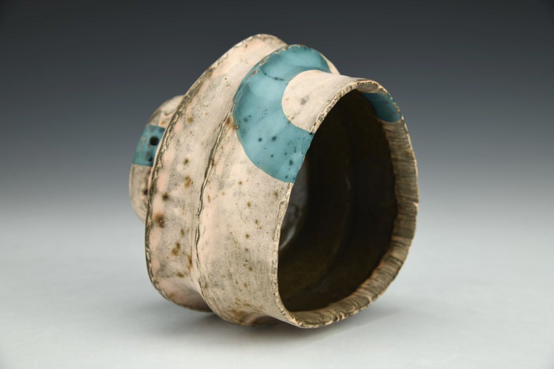 Stoneware, hand built with coils and pinched, terra sigillata, glaze, electric fired, 3.5 x 4 x 4 inches.