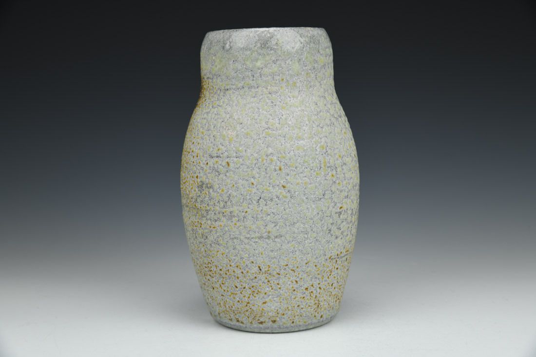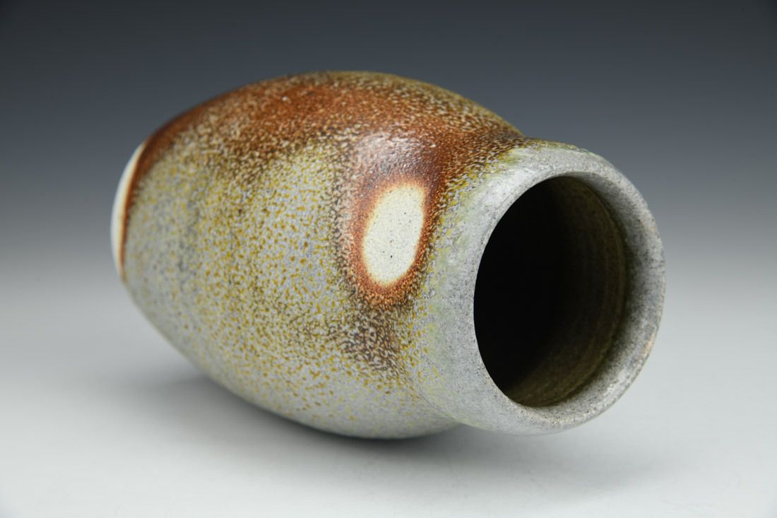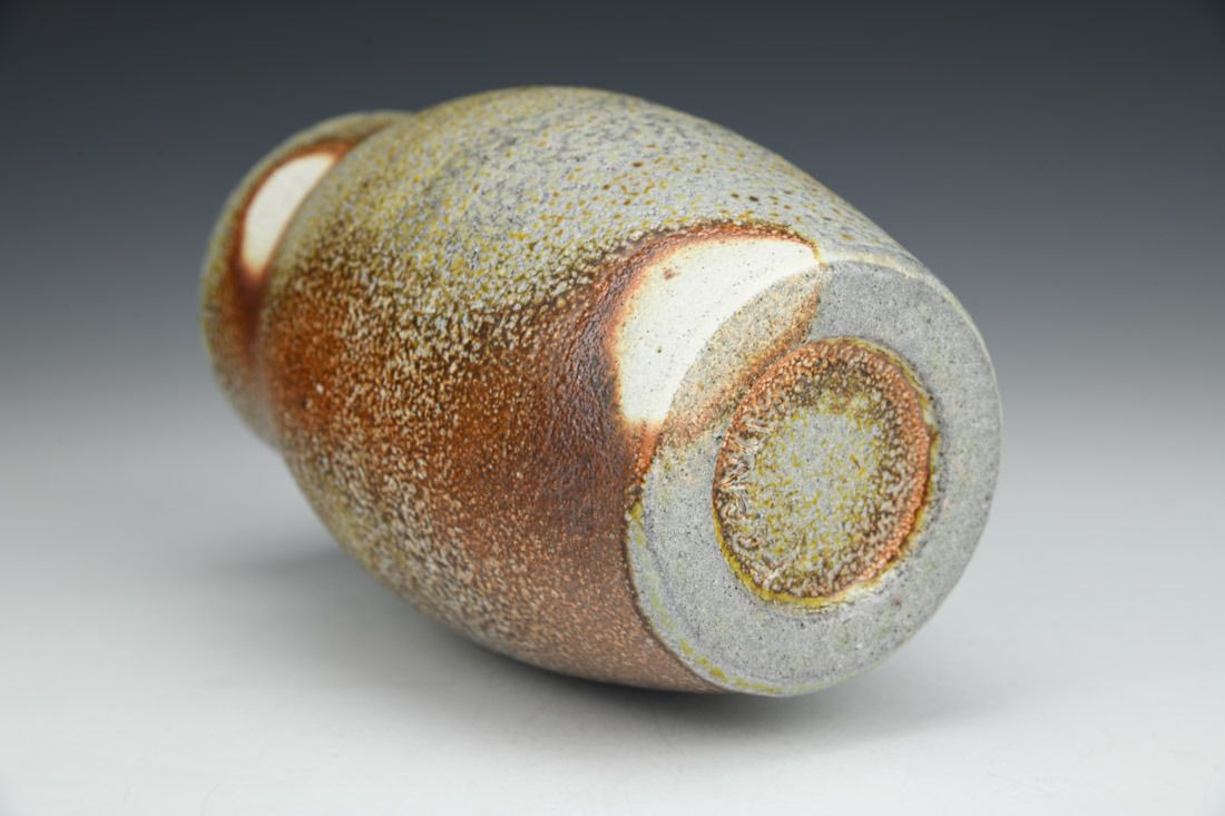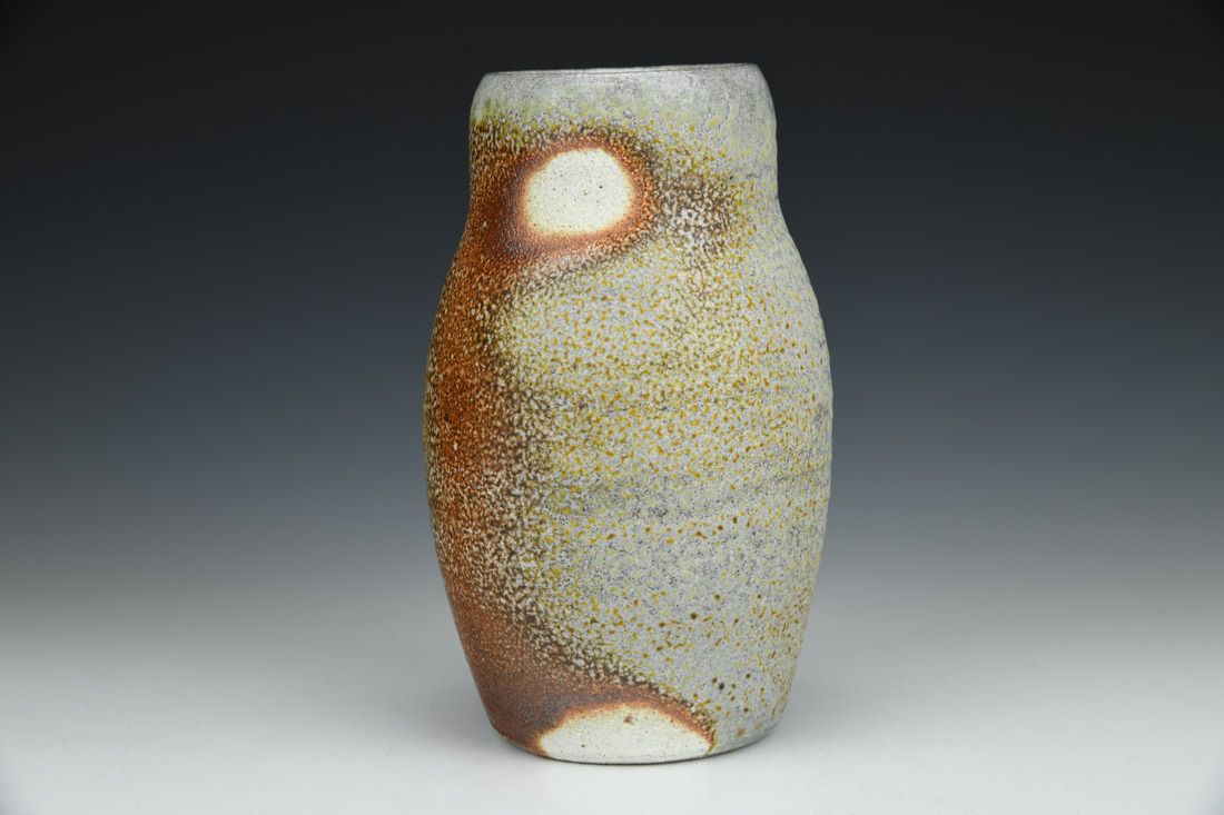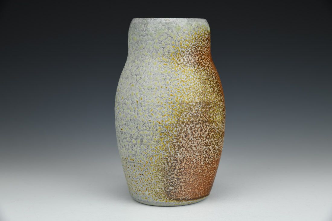 Stoneware with flashing slip, wheel thrown, cone 10 soda fired, 6 x 3.75 x 3.75 inches.