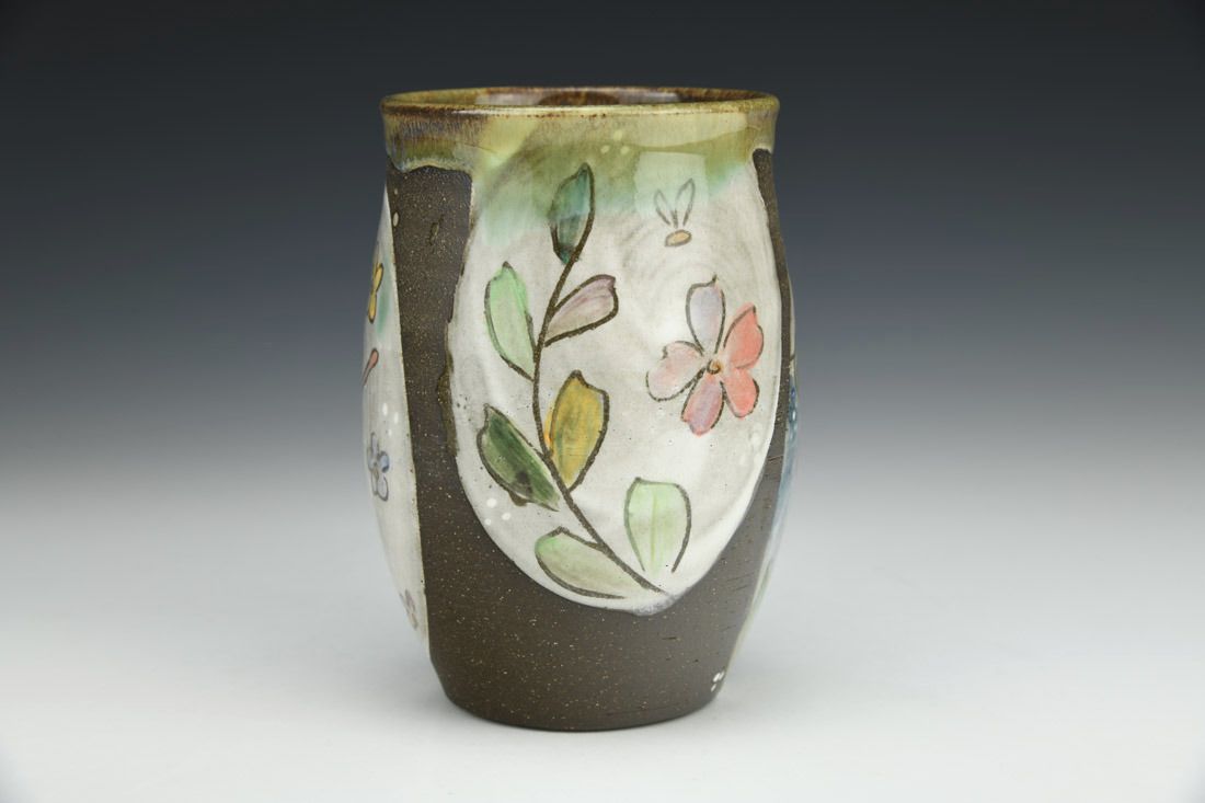 Black stoneware, wheel thrown, underglaze painted, cone 6 electric fired, 4.5 x 5 x 4 inches.