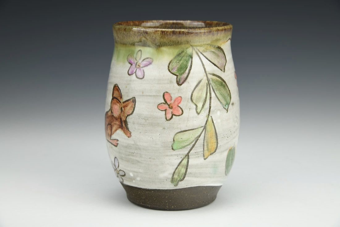 Black stoneware, wheel thrown, underglaze painted, cone 6 electric fired, 4.25 x 5 x 4 inches.
